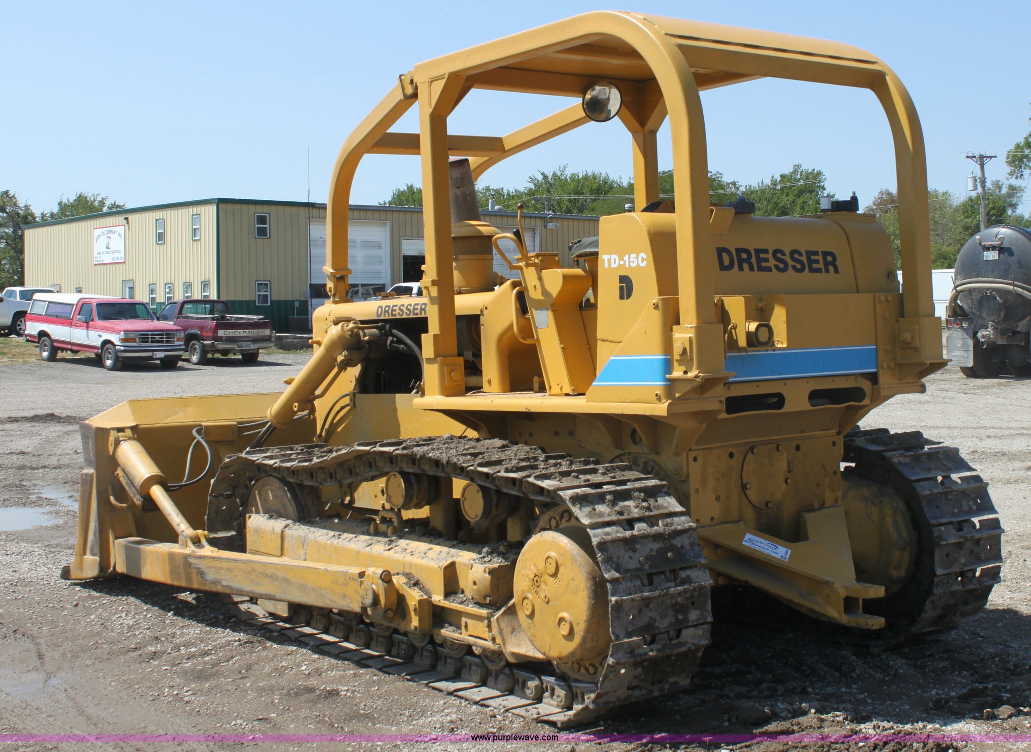 Dresser TD-15C dozer. 1,948 hours on meter, International six cylinder turbo diesel engine Serial 468TM2U484538, Powershift transmission 4F-4R gears, Canopy, Clutch brake, 6-way dozer blade 123"W, Angle, Tilt, Rear pin hitch, (6) bottom rollers, 20"W single grouser pads, 32,975 lbs. base operating weight, Exhaust manifold elbow leaks New elbow included. View equipment video. Shipping quotes available. Birk Petrolium. 900 S 4th. Burlington, KS 66839