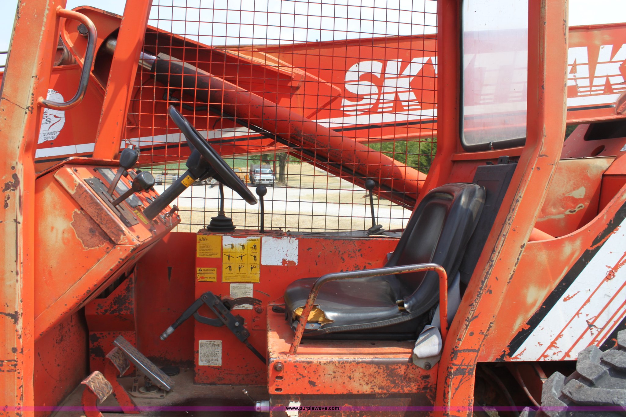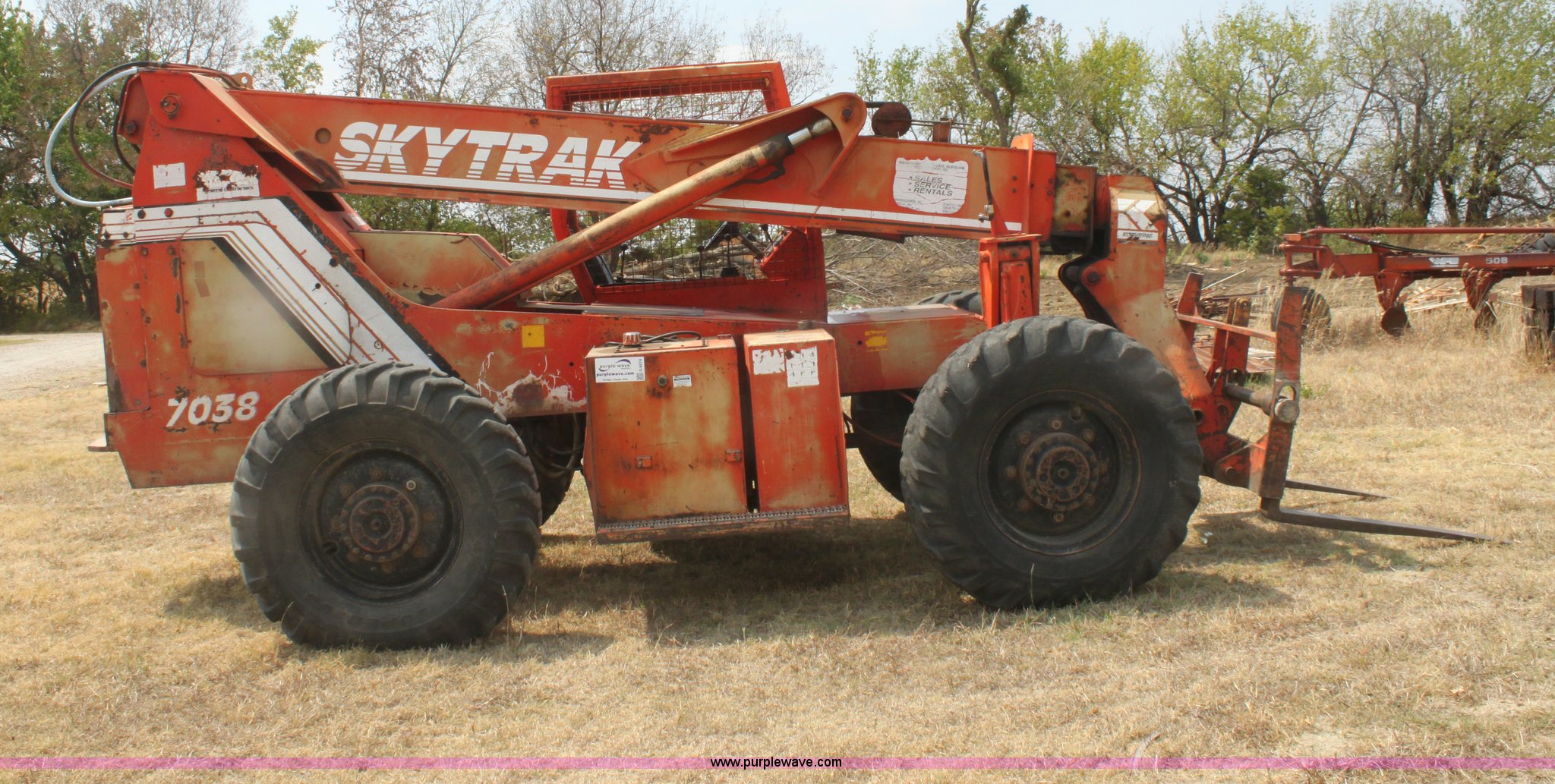 Purple Wave is selling a used Telehandler in Kansas. This item is a SkyTrak 7038 telehandler with the following: Hours unknown, Ford BSD-444 four cylinder diesel engine, Powershift transmission, 3F-3R gears, Four wheel drive, Crab steer, ROPS, Spring seat, 7,000 lb lift capacity, 37.5'L reach, 48" forks, Adjustable width, Tilt carriage, Two stick control, Micro-brake lock, Automatic fork leveling system, 44 gallon fuel tank, 108" wheelbase, 13.00-24 tires, 22,100 lbs. base operating weight, Torque converter rebuilt May 2012, Drive line carrier bearing, tie-rod ends, hydraulic hose inside boom, and boom bearing replaced May 2012, (4) steering cylinders rebuilt May 2012, One lift cylinder leaks, Serial 6E0020