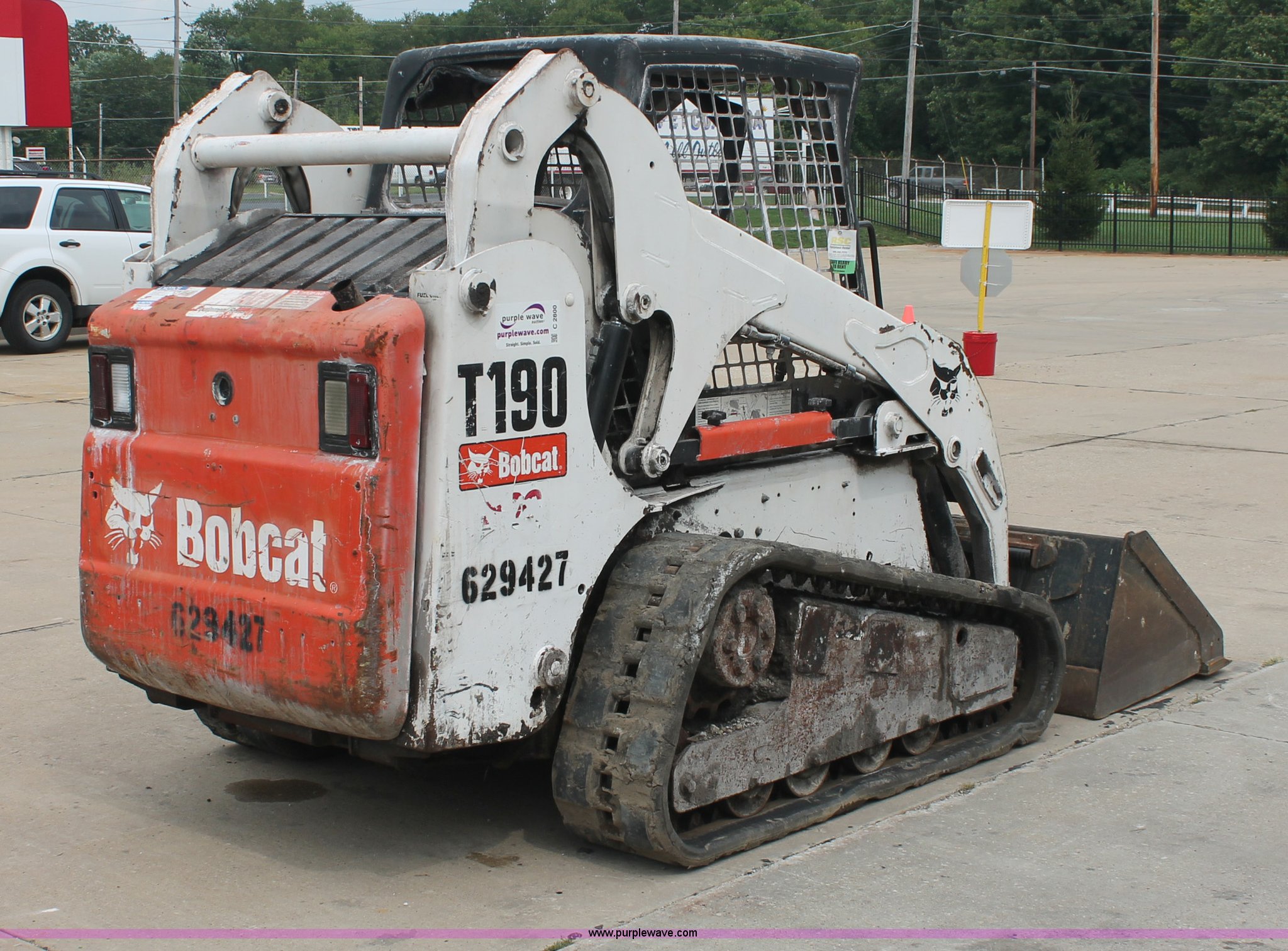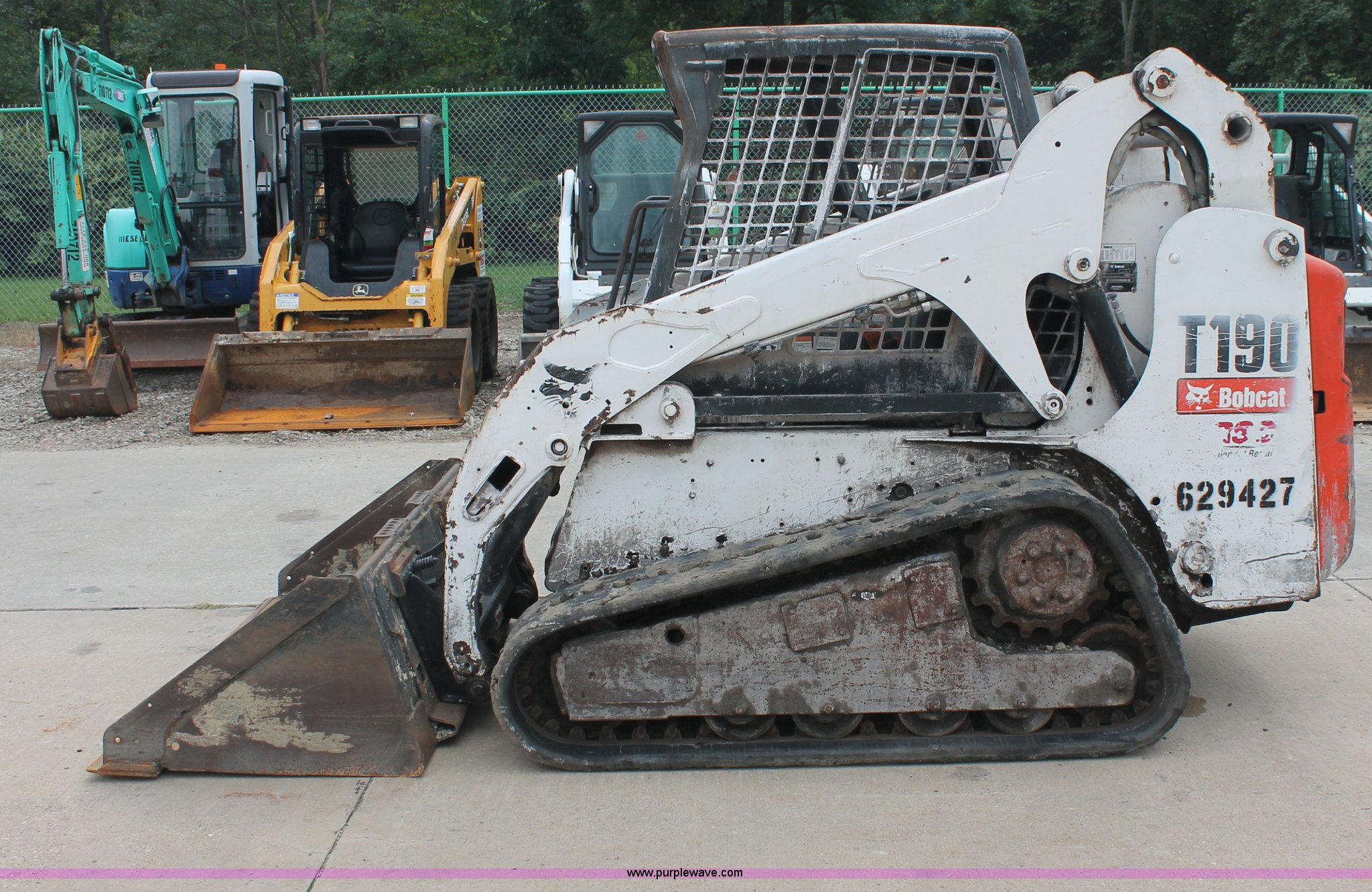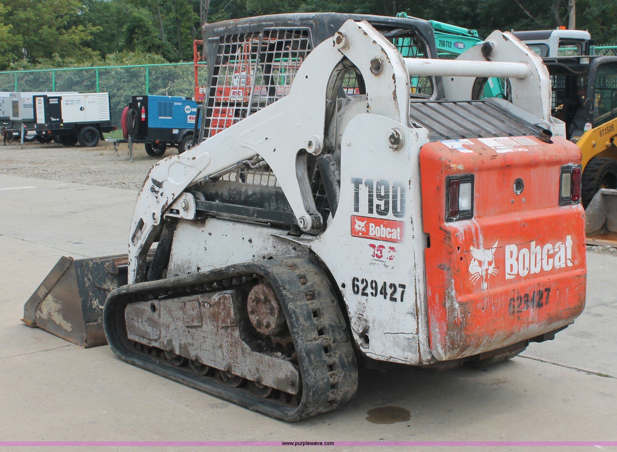 Purple Wave is selling a used Tracked Skid Steer Loader in Ohio. This item is a 2006 Bobcat T190 track skid steer with the following: 1,959 hours on meter, Kubota V2403 four cylinder turbo diesel engine, 66 HP, OROPS, Dual joystick controls, Dual foot pedal controls, 68" smooth bucket, Bolt-on cutting edge, Quick attach, Auxiliary hydraulics, Work lights, 1,900 lb lift capacity, 12"W rubber tracks, 7,775 lbs. base operating weight, Serial 531612932, EIN 629427