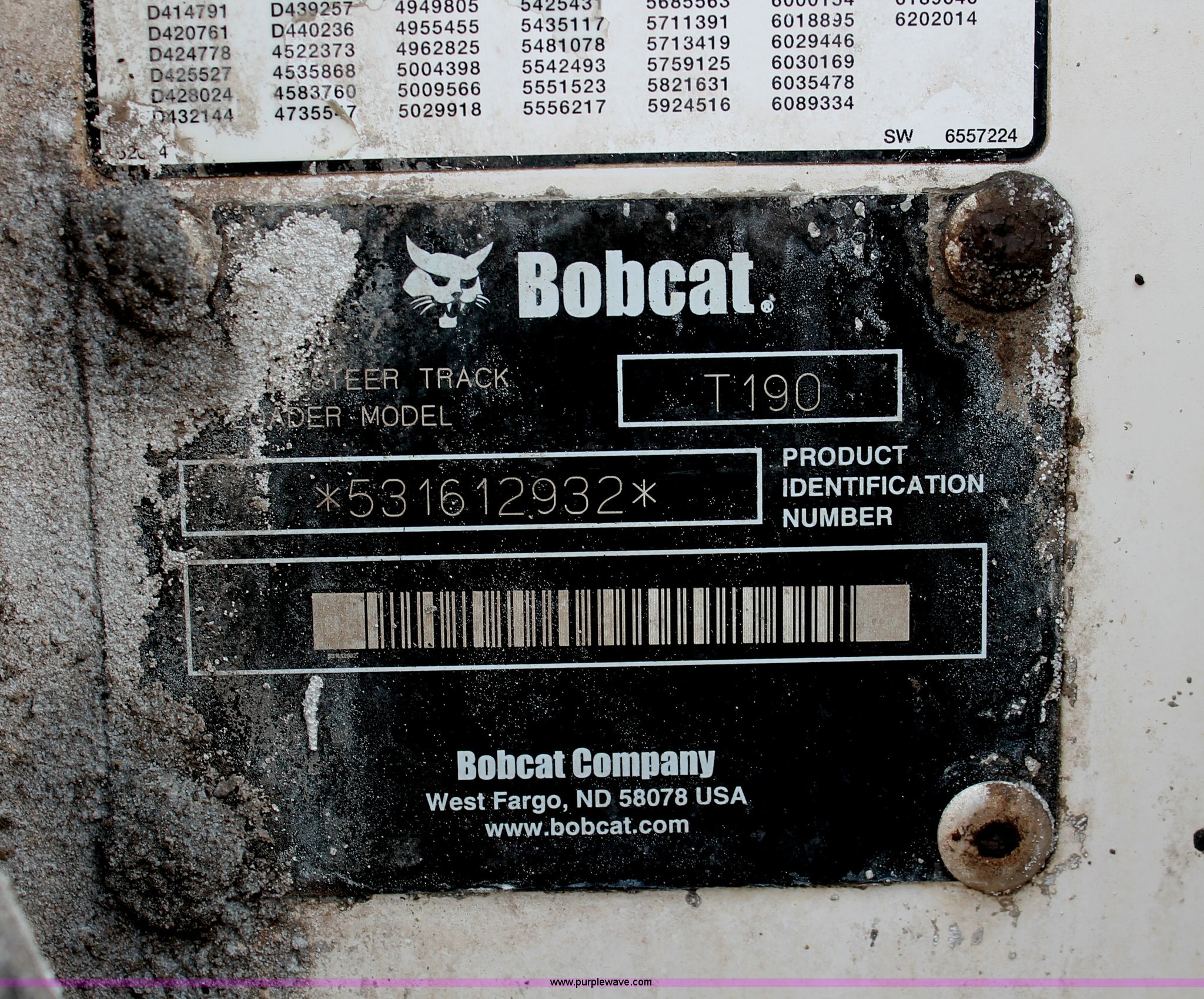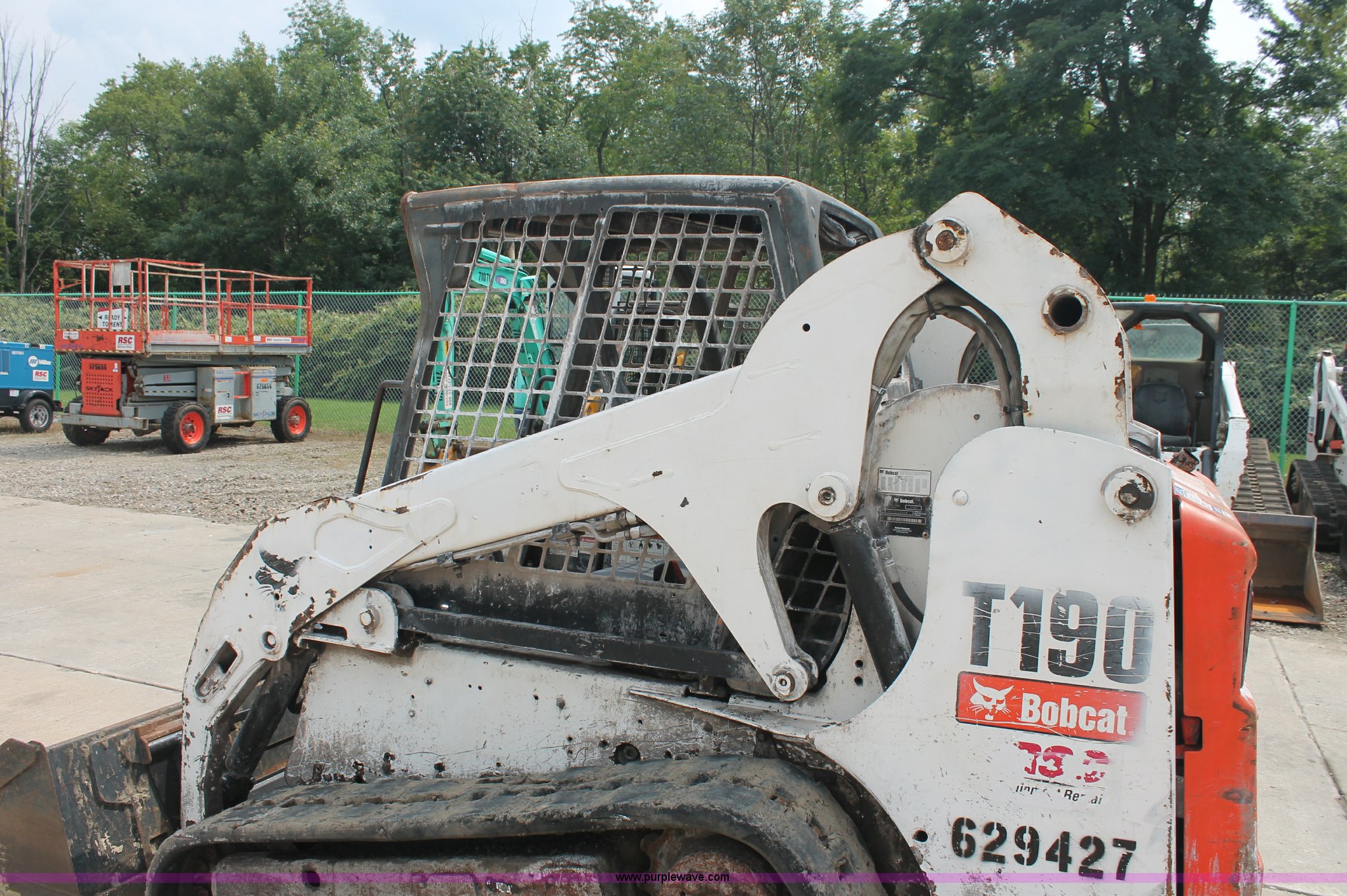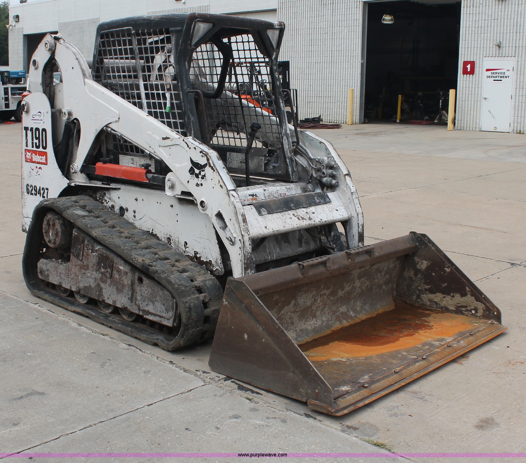 Purple Wave is selling a used Tracked Skid Steer Loader in Ohio. This item is a 2006 Bobcat T190 track skid steer with the following: 1,959 hours on meter, Kubota V2403 four cylinder turbo diesel engine, 66 HP, OROPS, Dual joystick controls, Dual foot pedal controls, 68" smooth bucket, Bolt-on cutting edge, Quick attach, Auxiliary hydraulics, Work lights, 1,900 lb lift capacity, 12"W rubber tracks, 7,775 lbs. base operating weight, Serial 531612932, EIN 629427