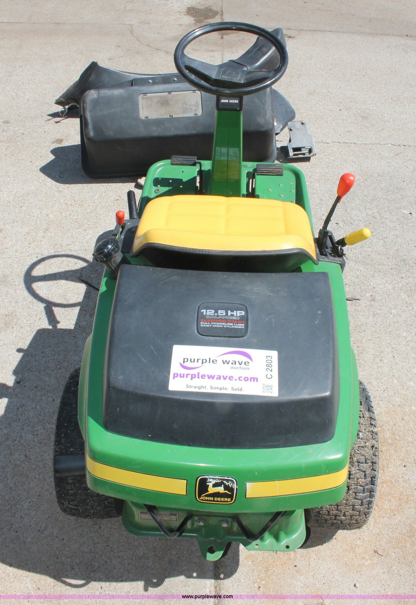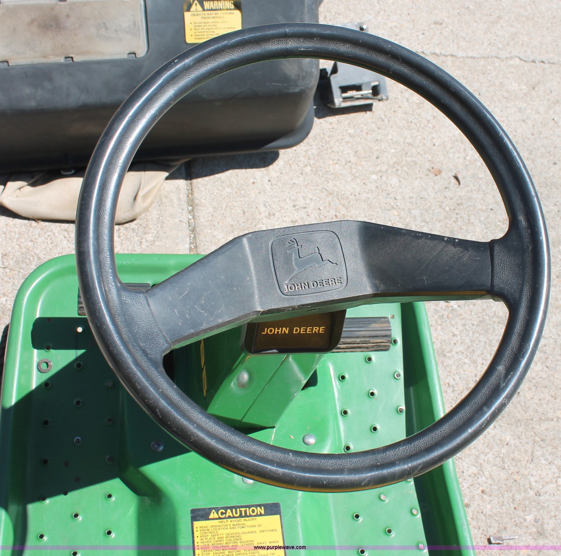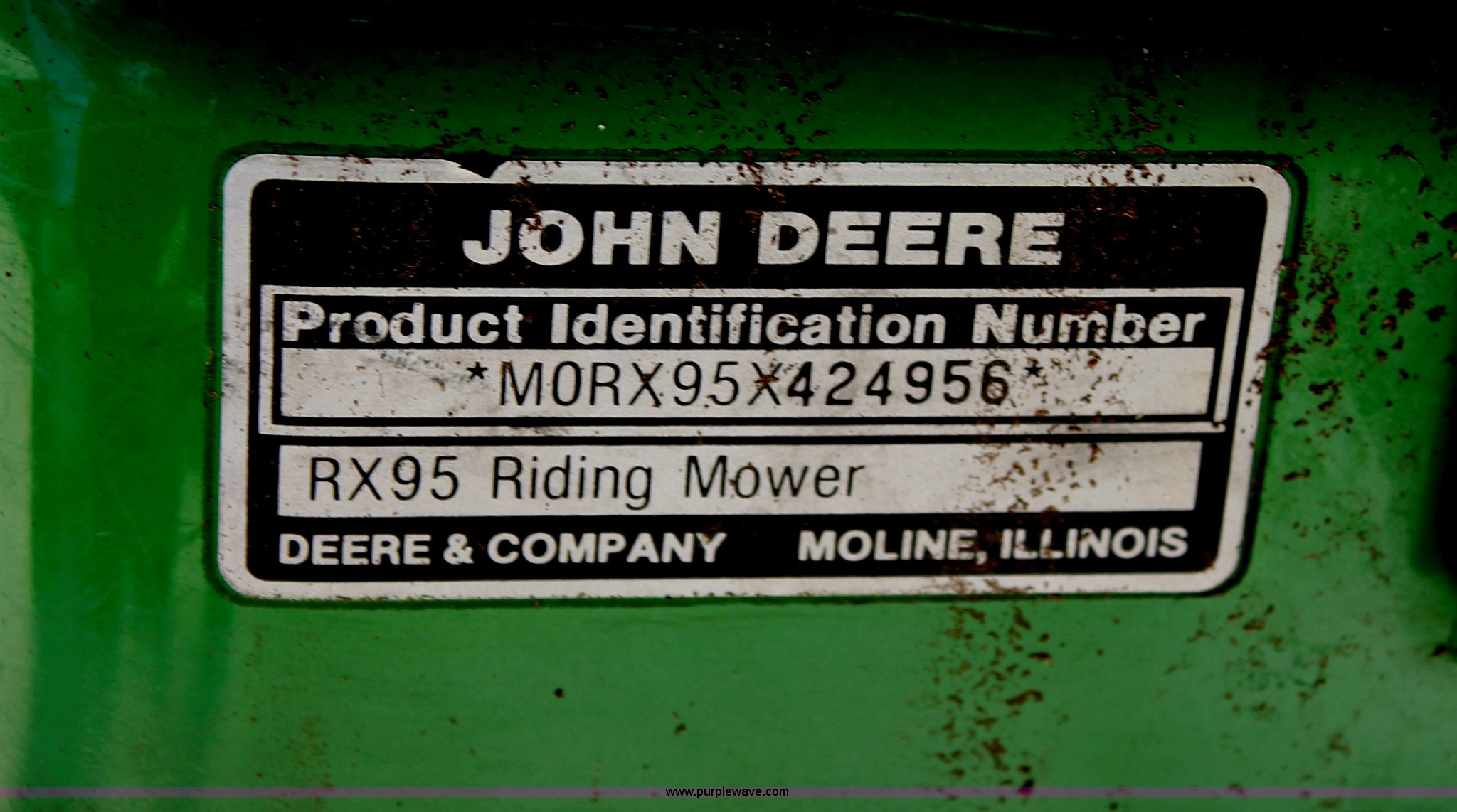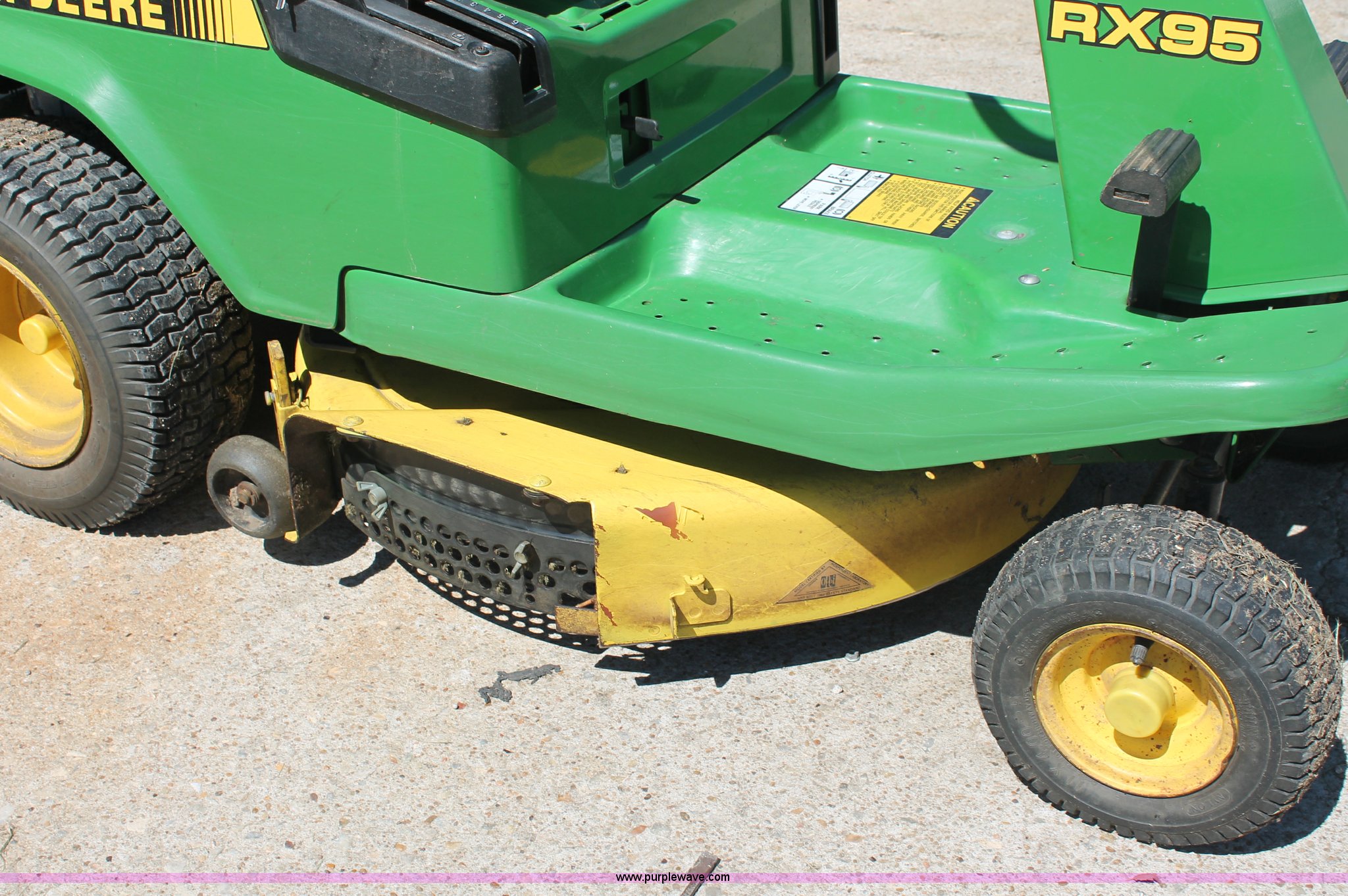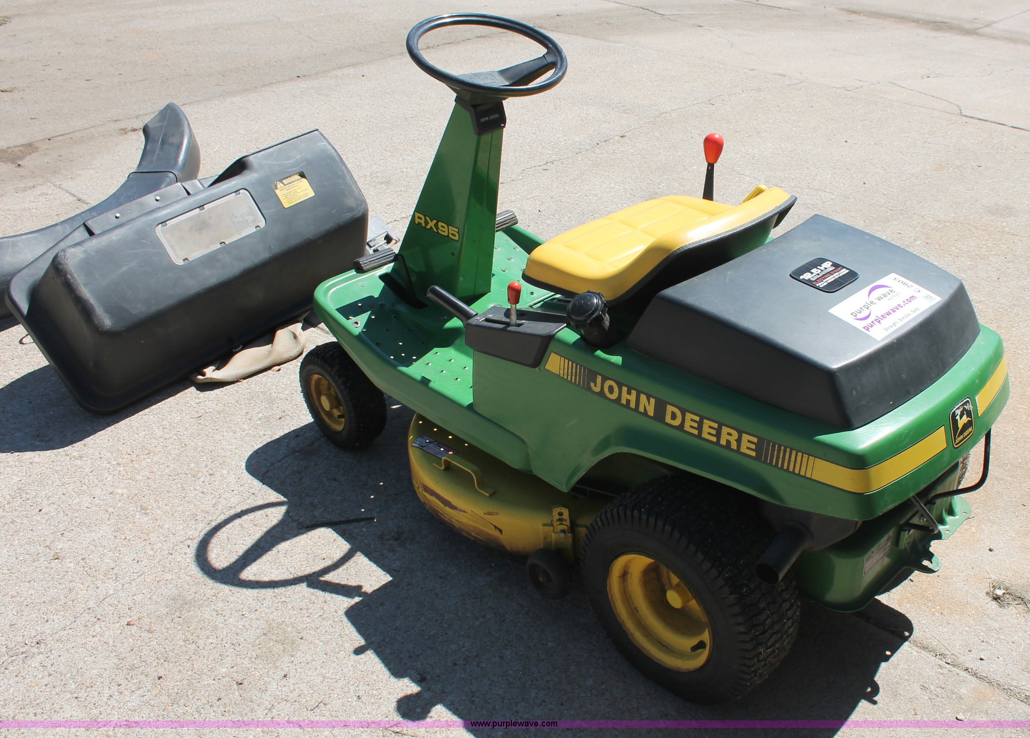 Purple Wave is selling a used Lawn and Garden in Kansas. This item is a John Deere RX95 lawn mower with the following: 30" cut, John Deere 12.5 HP gas engine, John Deere cushioned seat, Pin hitch, Grass catcher system with mulcher and discharge chute, 16x6.50-8 rear tires, 11x4.00-5 front tires, Owners manual included, Serial M0RX95X424956