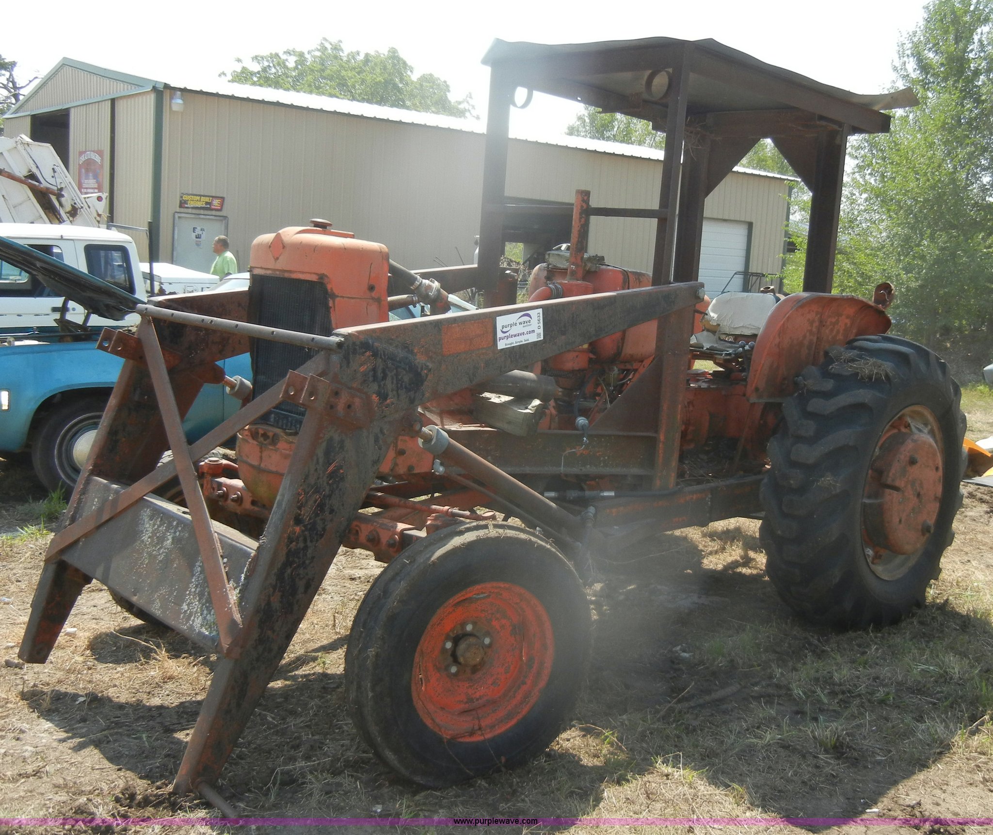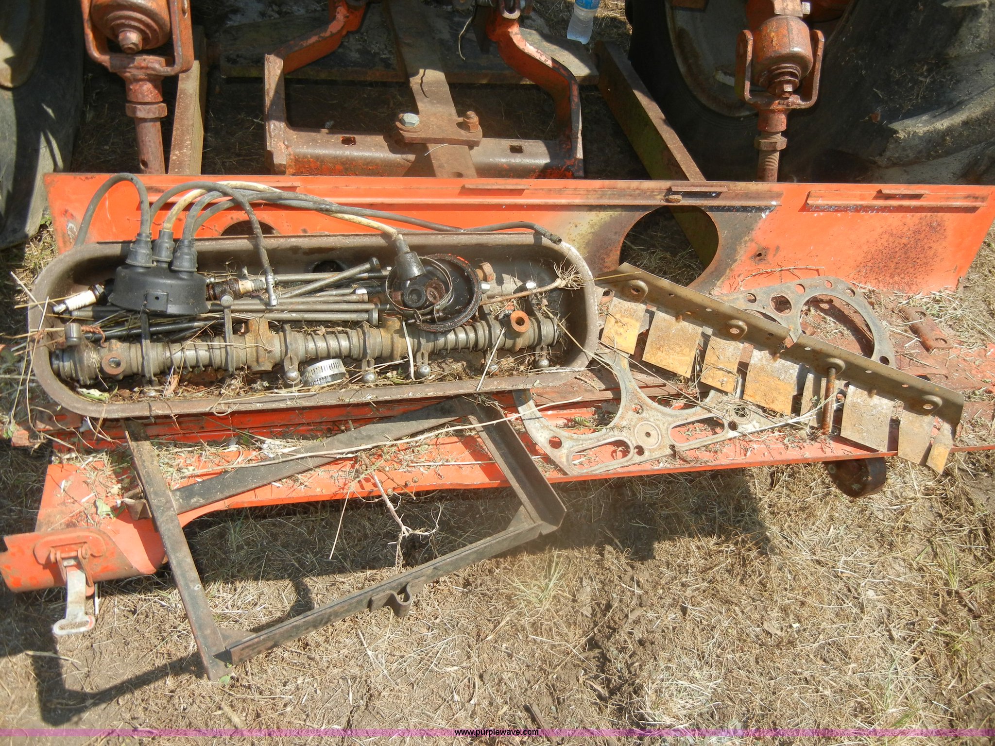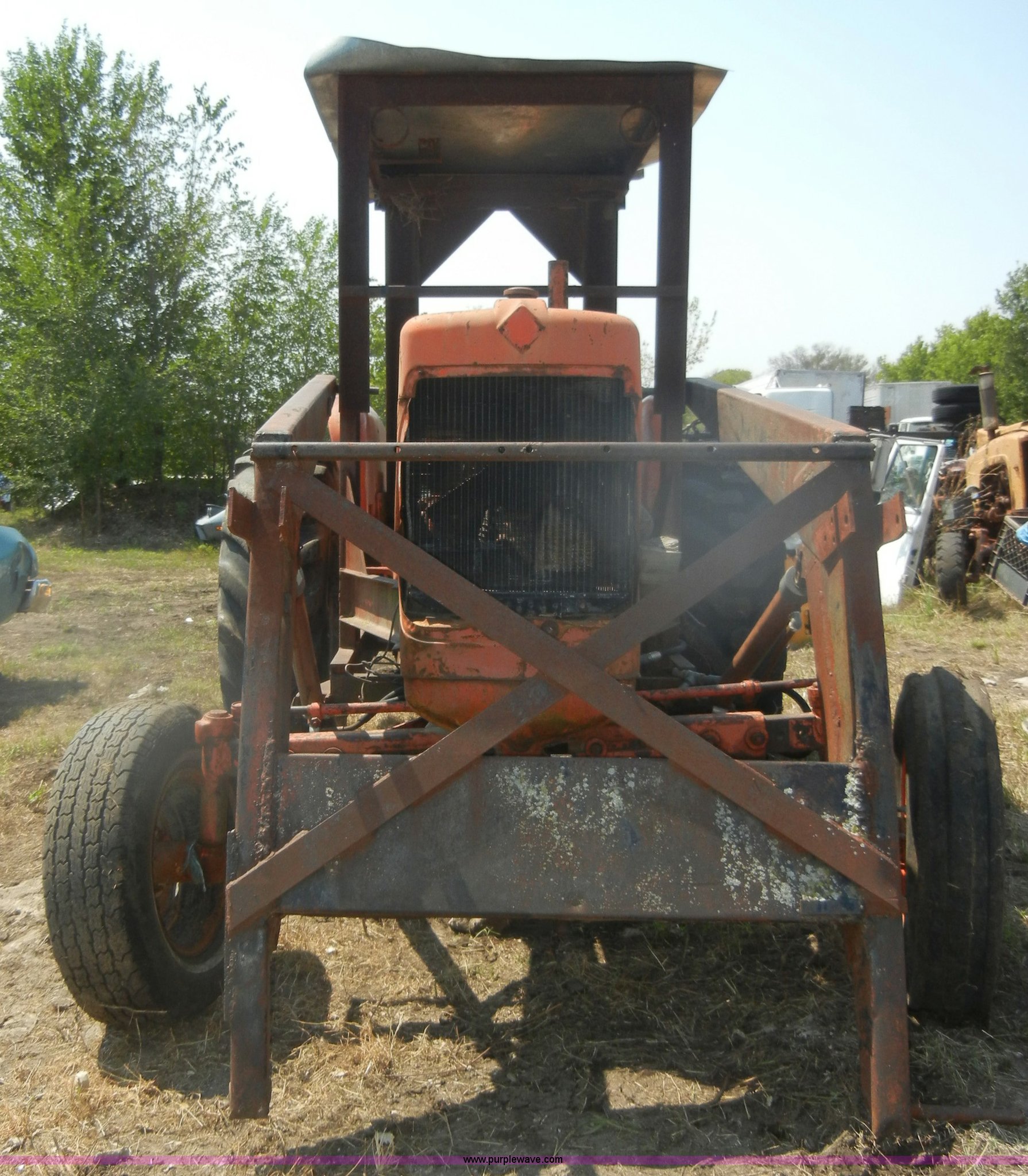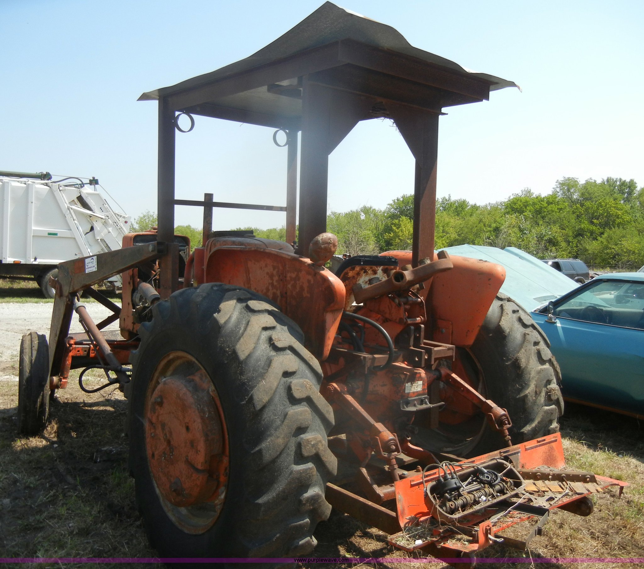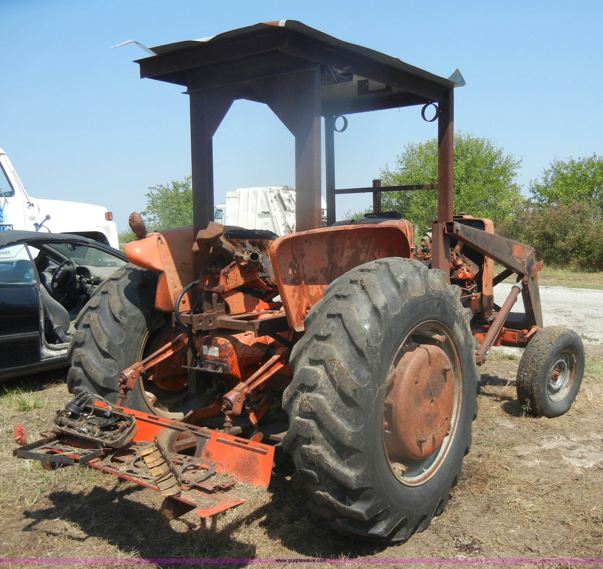 Purple Wave is selling a used Tractor in Kansas. This item is a Allis-Chalmers D17 tractor with the following: 1,005 hours on meter, Custom canopy, Manual transmission, 4F-1R gears, 540 PTO, Three point hitch, Rear hydraulics, Front loader, 14.9-28 rear tires, 5.50-16 front tires, No steering wheel, No front bucket or cylinders, Does not run, missing parts, Cylinder head needs put back on, Head gasket set, new in box, Valves, springs, and guides