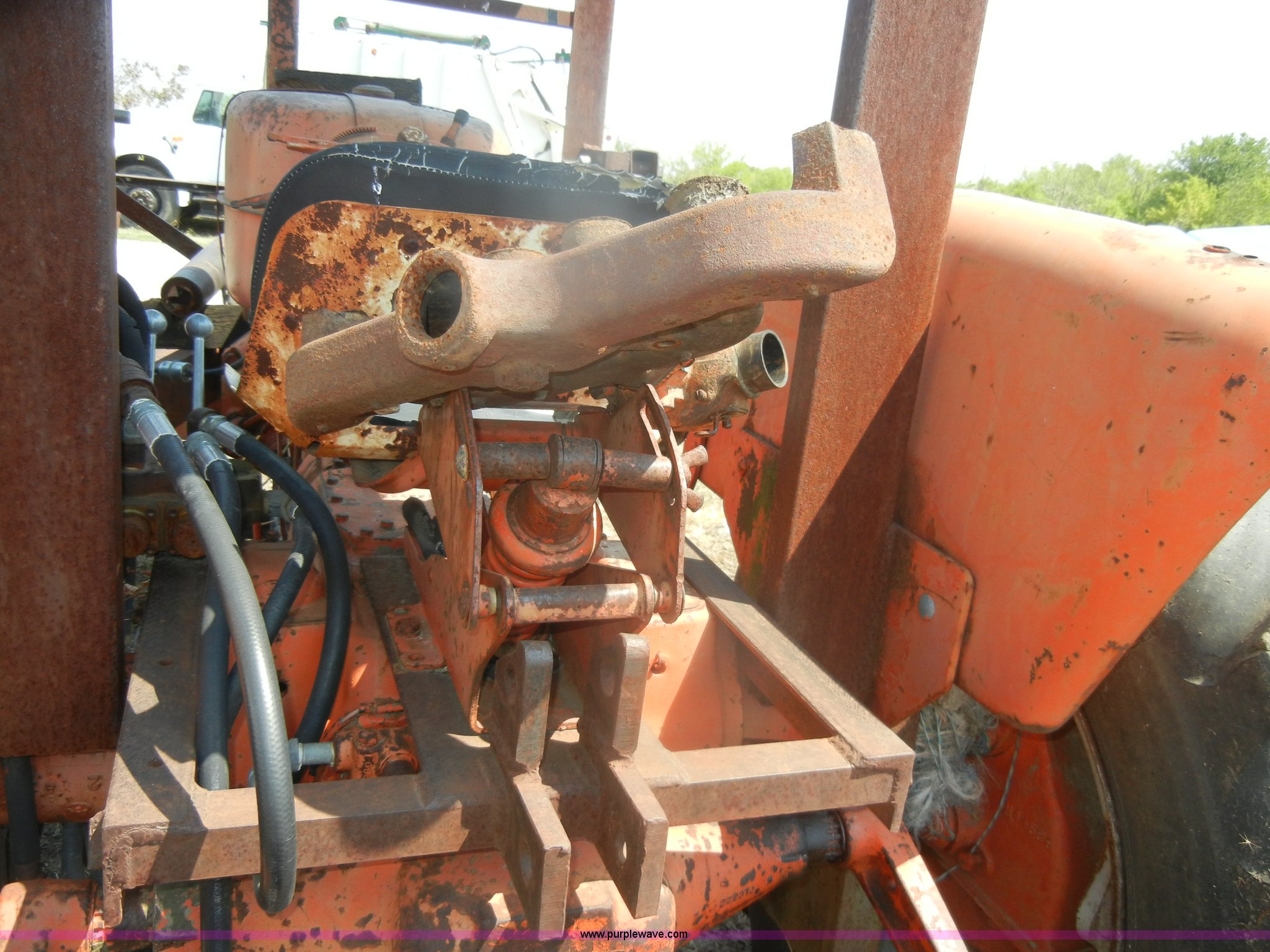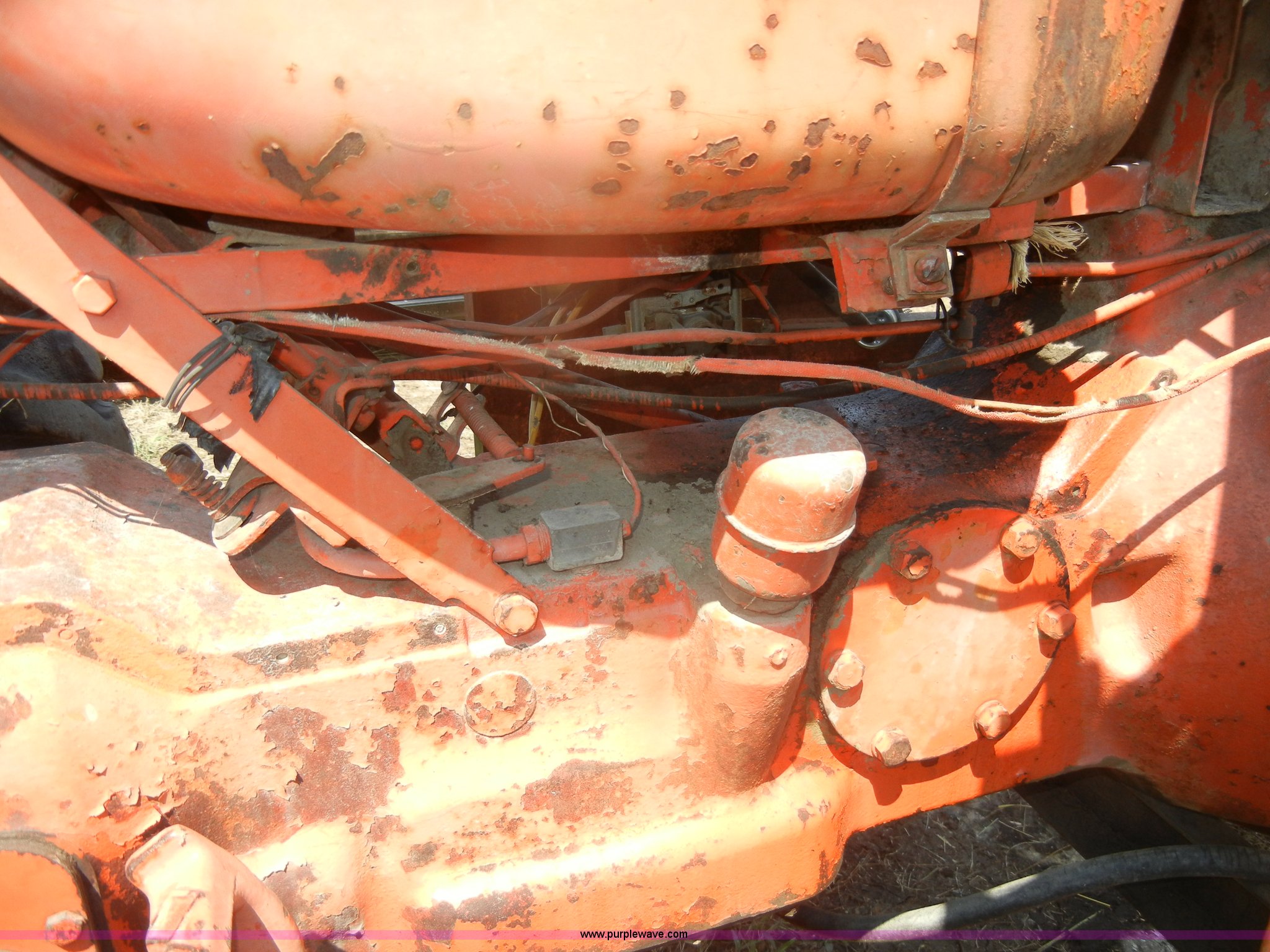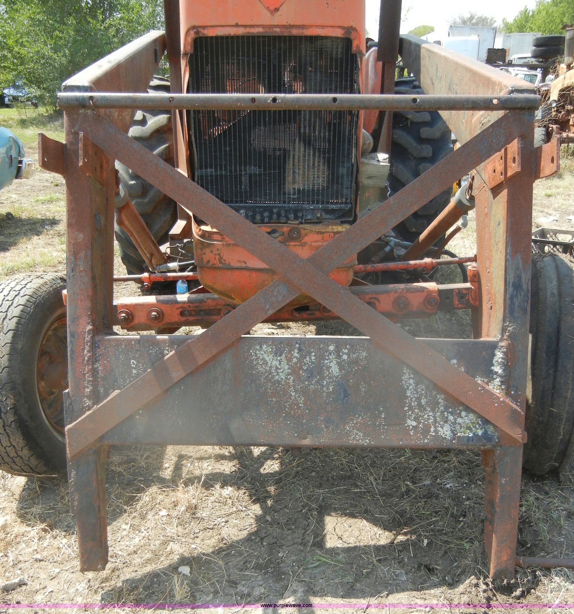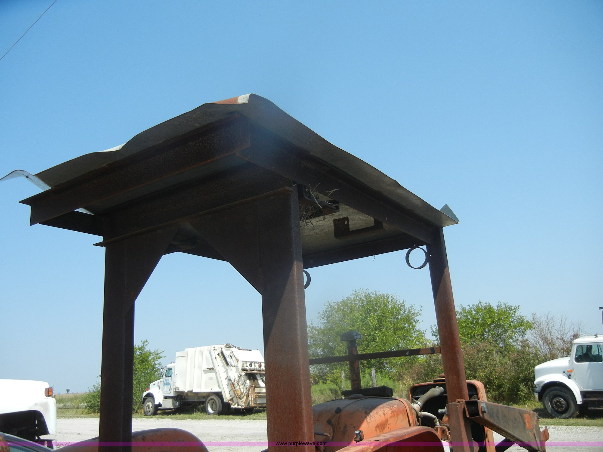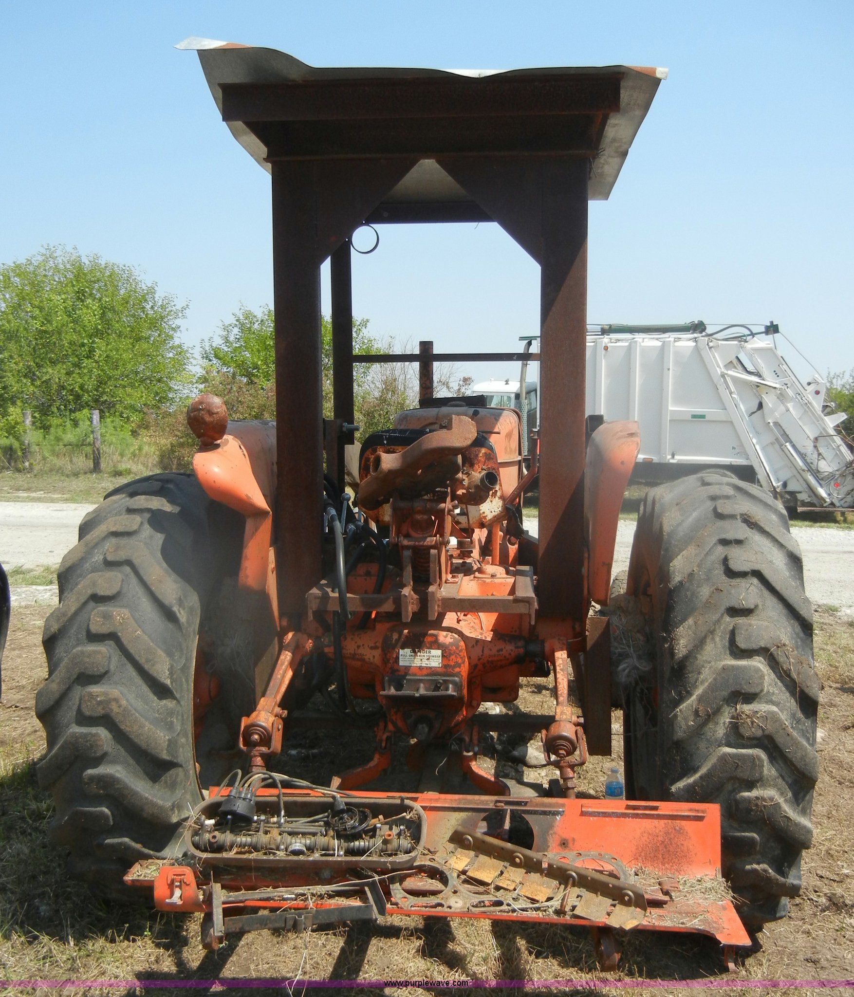 Purple Wave is selling a used Tractor in Kansas. This item is a Allis-Chalmers D17 tractor with the following: 1,005 hours on meter, Custom canopy, Manual transmission, 4F-1R gears, 540 PTO, Three point hitch, Rear hydraulics, Front loader, 14.9-28 rear tires, 5.50-16 front tires, No steering wheel, No front bucket or cylinders, Does not run, missing parts, Cylinder head needs put back on, Head gasket set, new in box, Valves, springs, and guides