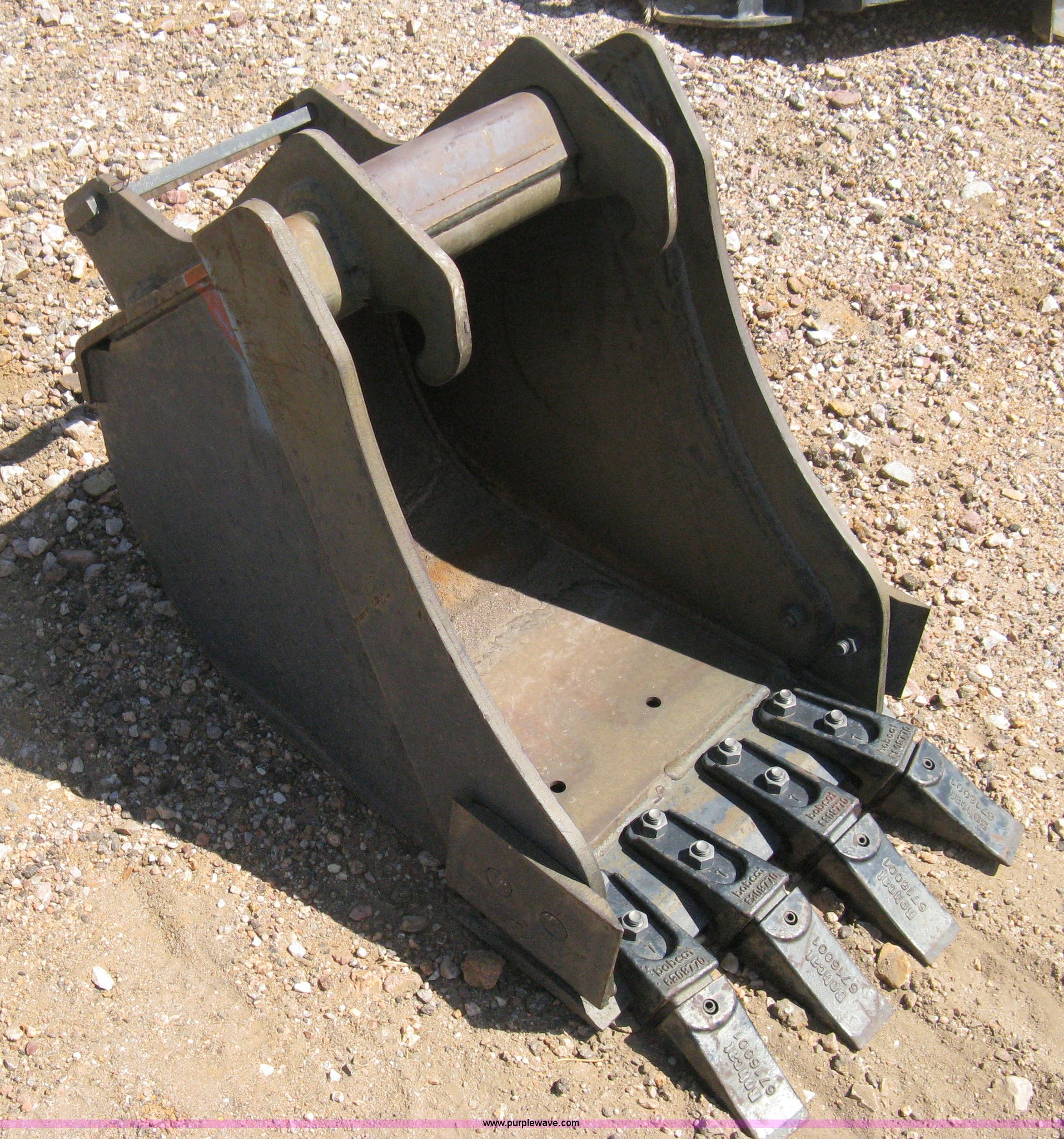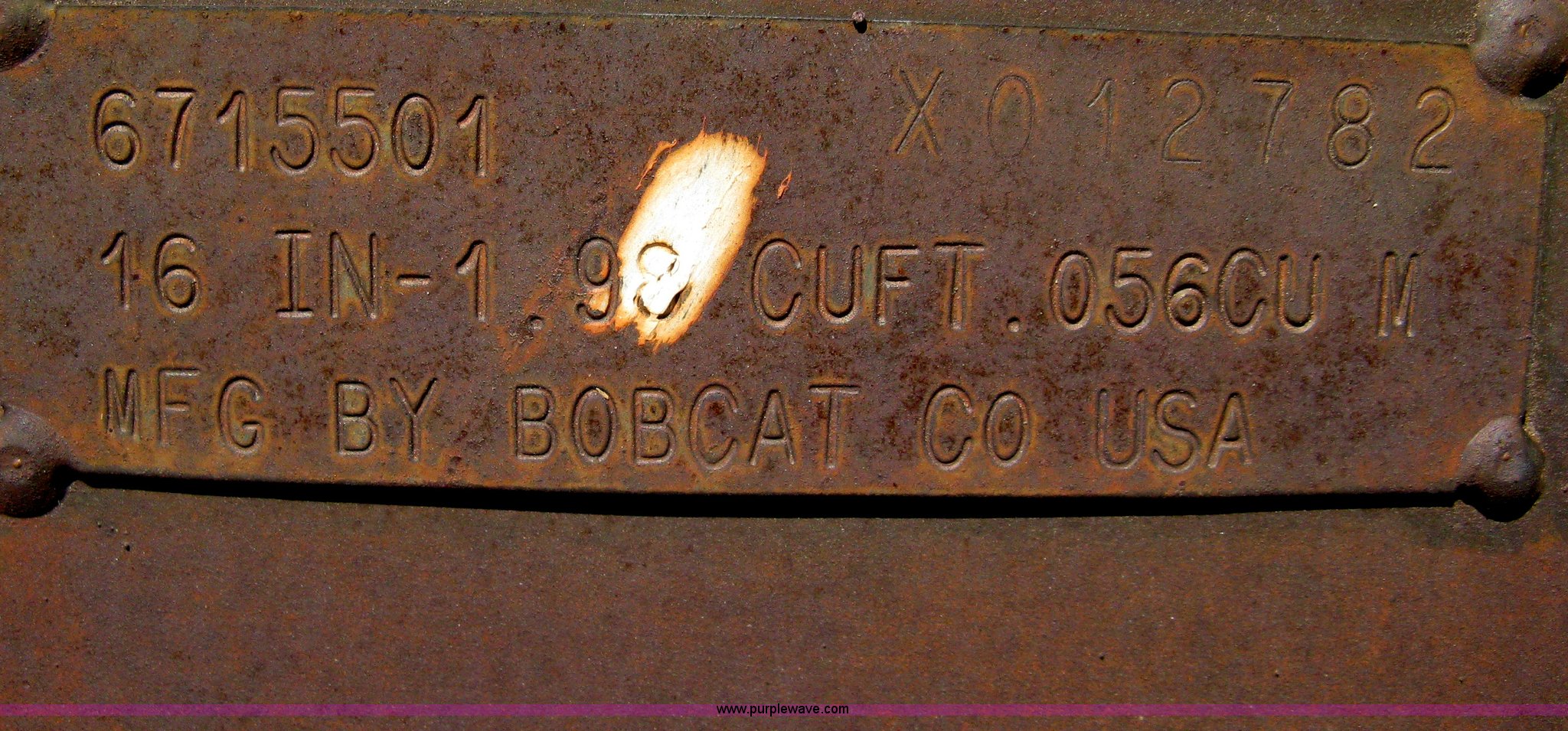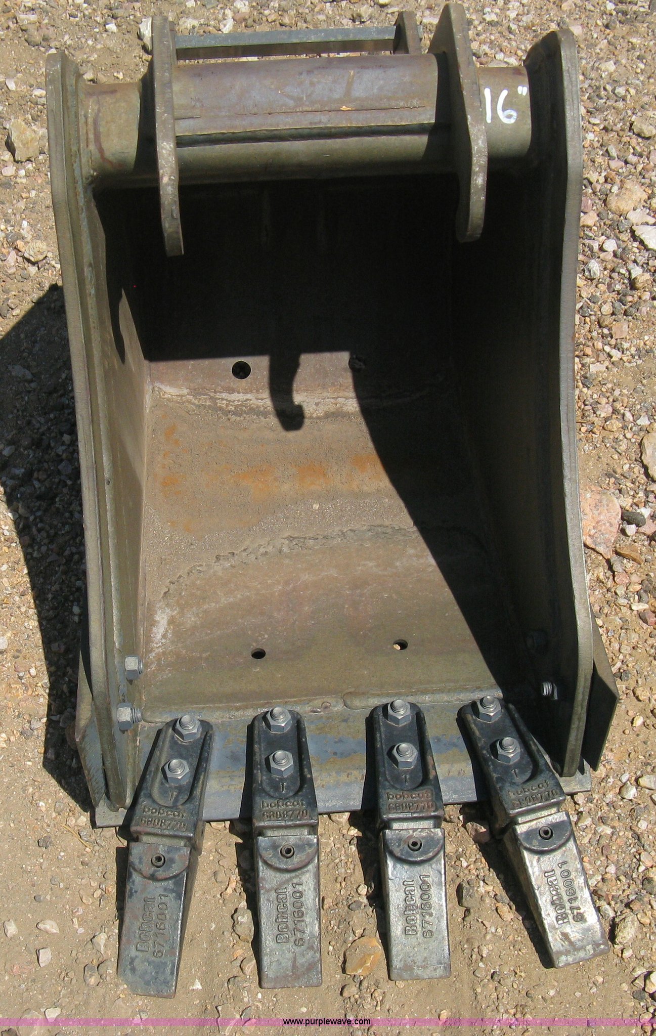 Purple Wave is selling a used Excavator Attach. in Colorado. This item is a Bobcat 16" toothed excavator bucket with the following: 1.98 cu. ft. capacity, (4) bolt-on teeth, Quick attach coupler, Serial 6715501, Unit# 1400043