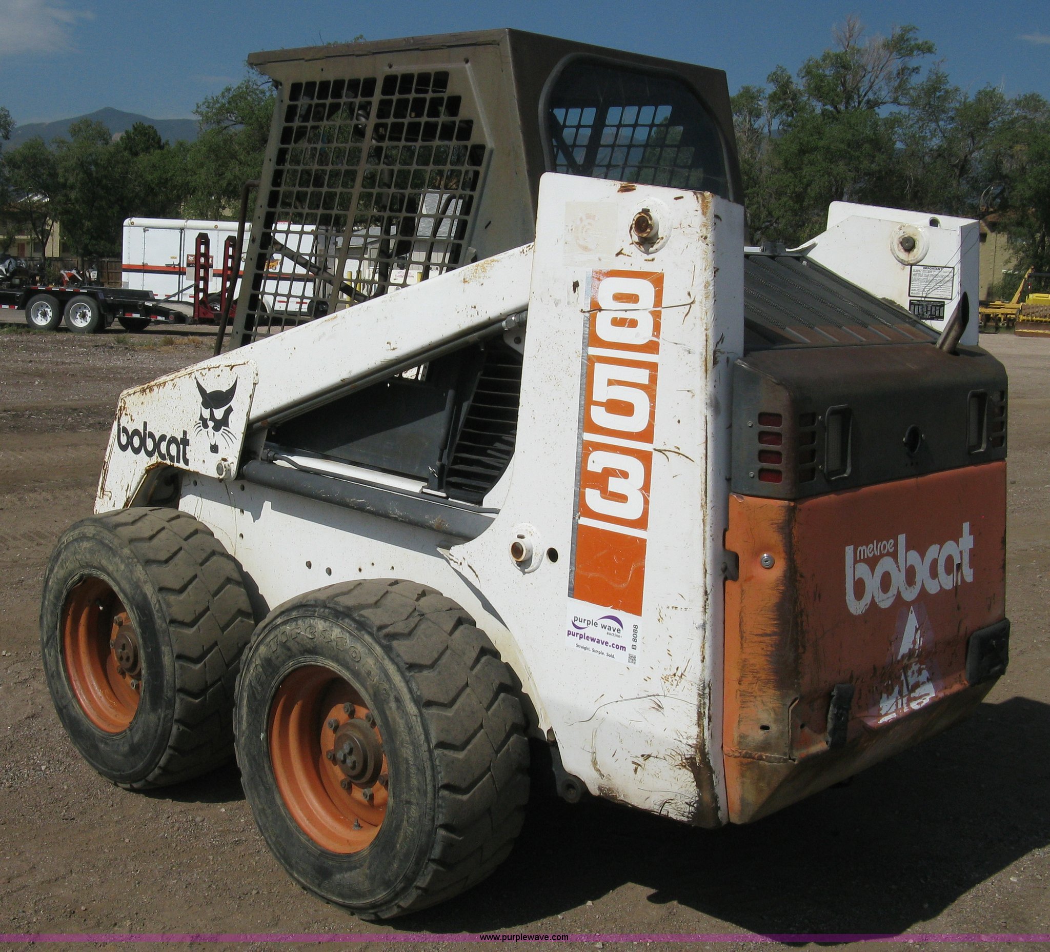 Purple Wave is selling a used Skid Steer Loader in Colorado. This item is a 1992 Bobcat 853 skid steer with the following: 4,615 hours on meter, Four cylinder diesel engine, Enclosed ROPS, Auxiliary hydraulics, Foot pedal loader control, Work lights, 12-16.5NHS tires, No side, roof top, or door glass, Rear glass damaged, Serial 508412201, Unit# 1055779
