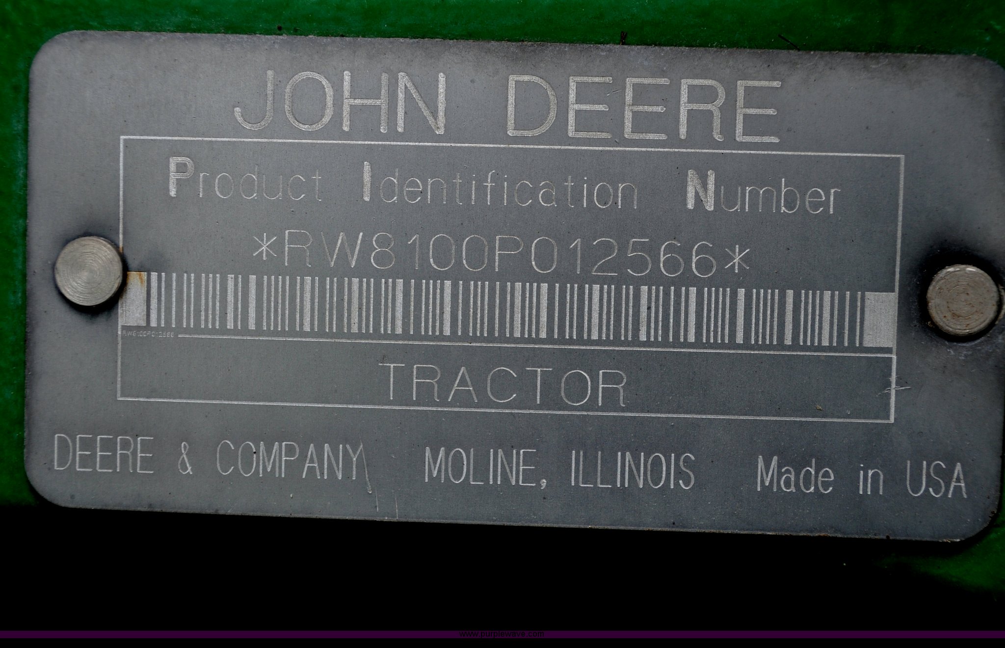 Purple Wave is selling a used Tractor in Colorado. This item is a 1997 John Deere 8100 MFWD tractor with the following: 4,714 actual hours, John Deere 6081 six cylinder diesel engine, 160 HP, Serial 6081H024996, Powershift transmission, 16F-4R gears, Differential lock, AC and heat, AM/FM/weaterband, Air seat, Tilt steering wheel, Shades and visors, Three point, Three point quick attach, Draw bar, Large 1000 PTO, (3) rear hydraulic remotes, (8) suitcase weights, Wheel weights, 380/85R30 front tires, 14.9R46 dual rear tires, Serial RW8100P012566
