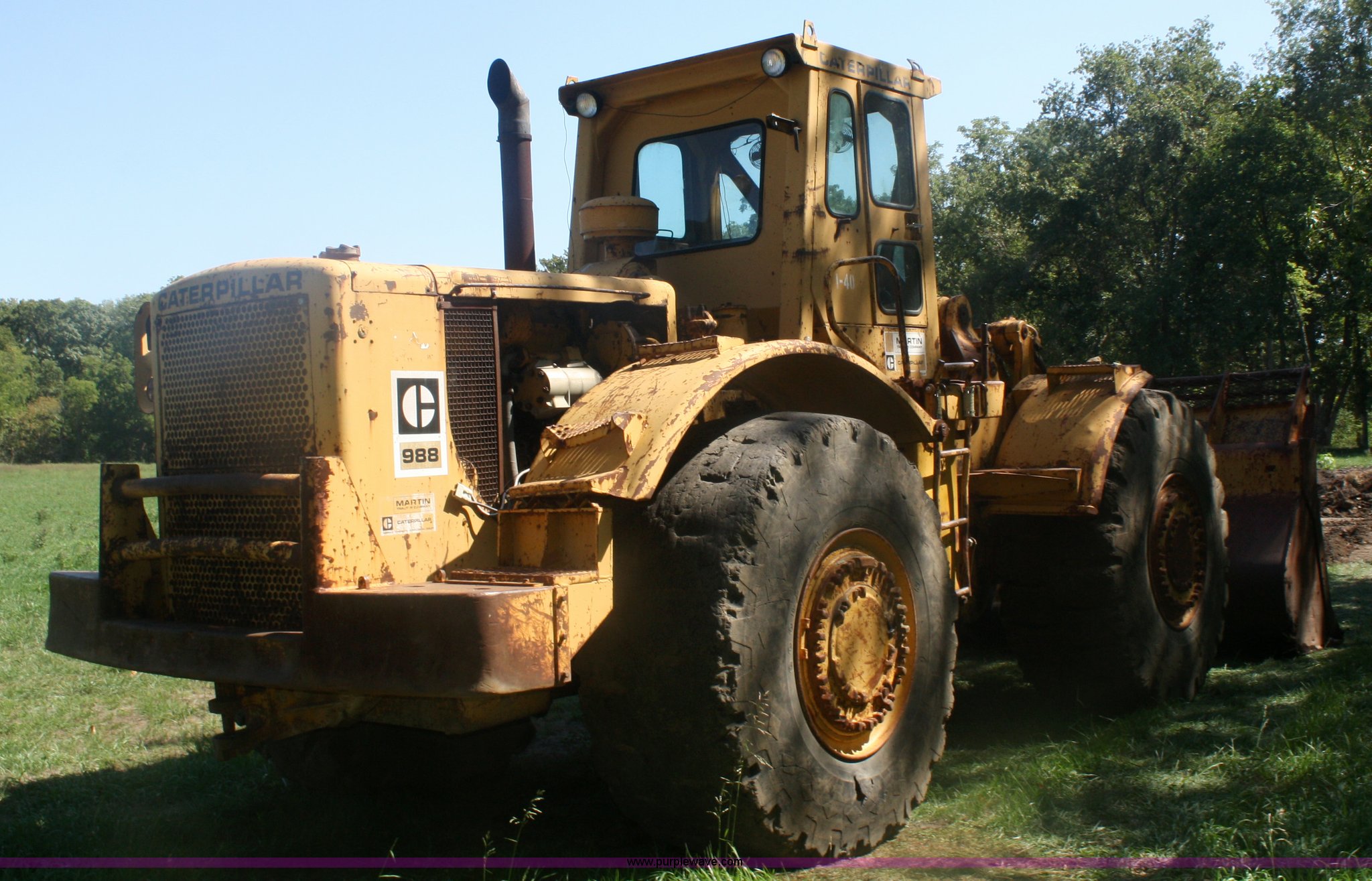 Purple Wave is selling a used Wheel Loader in Kansas. This item is a 1968 Caterpillar 988 wheel loader with the following: 744 hours on meter, Caterpillar D343T six cylinder diesel engine, 300 HP, Three speed transmission, 3F-3R gears, Two-stick loader control, 7 cu. yd. bucket, Pin hitch, Enclosed cab, Front and rear work lights, 29.5-29 L-5 tires, 79,000 lbs. base operating weight, Serial 87A2551