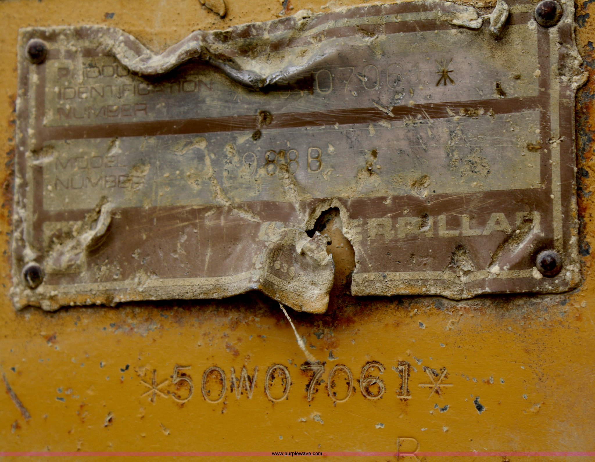 Purple Wave is selling a used Wheel Loader in Kansas. This item is a 1984 Caterpillar 988B wheel loader with the following: 40,928 hours on meter, Caterpillar 3408 diesel engine, 375 HP, Four speed transmission, 7 cu. yd. bucket, (8) weld on shanks with pin-on teeth, (7) bolt-on cutting segments, 65/35-33 L5 tires, Work lights, 95,600 lbs. base operating weight, Serial 50W07061