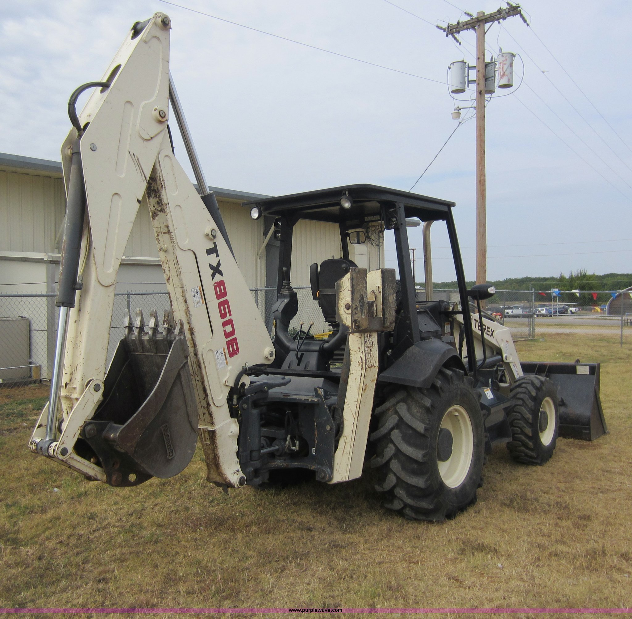 Purple Wave is selling a used Tractor Loader Backhoe in Oklahoma. This item is a 2009 Terex TX860B backhoe with the following: 485 actual hours, Perkins four cylinder turbo diesel engine, 74.5 KW, Fully synchronized power shuttle transmission, 4F-4R gears, Four wheel drive, High, Low, and 2WD options, Joystick boom and loader controls, Smooth bucket, Bolt-on edge, 1 cu. meter bucket capacity, 24" toothed backhoe bucket, 14'8" dig depth, Outrigger pads, Boom lock, Parking brake, 12.5-80-18 front tires, 19.5L-24 rear tires, 15,964 lbs. base operating weight, Serial SMPH64SR09DJS7952, Unit# 7701