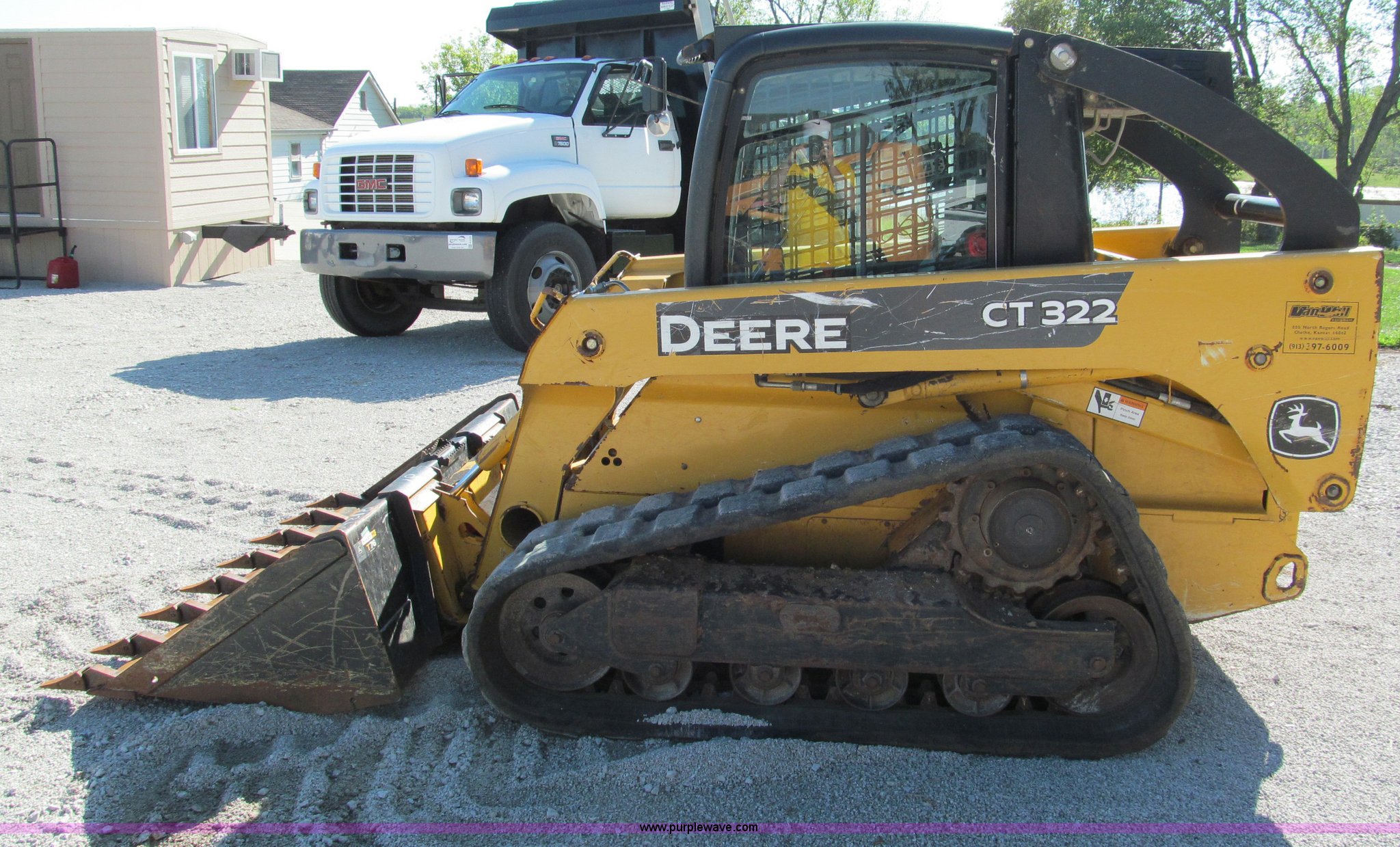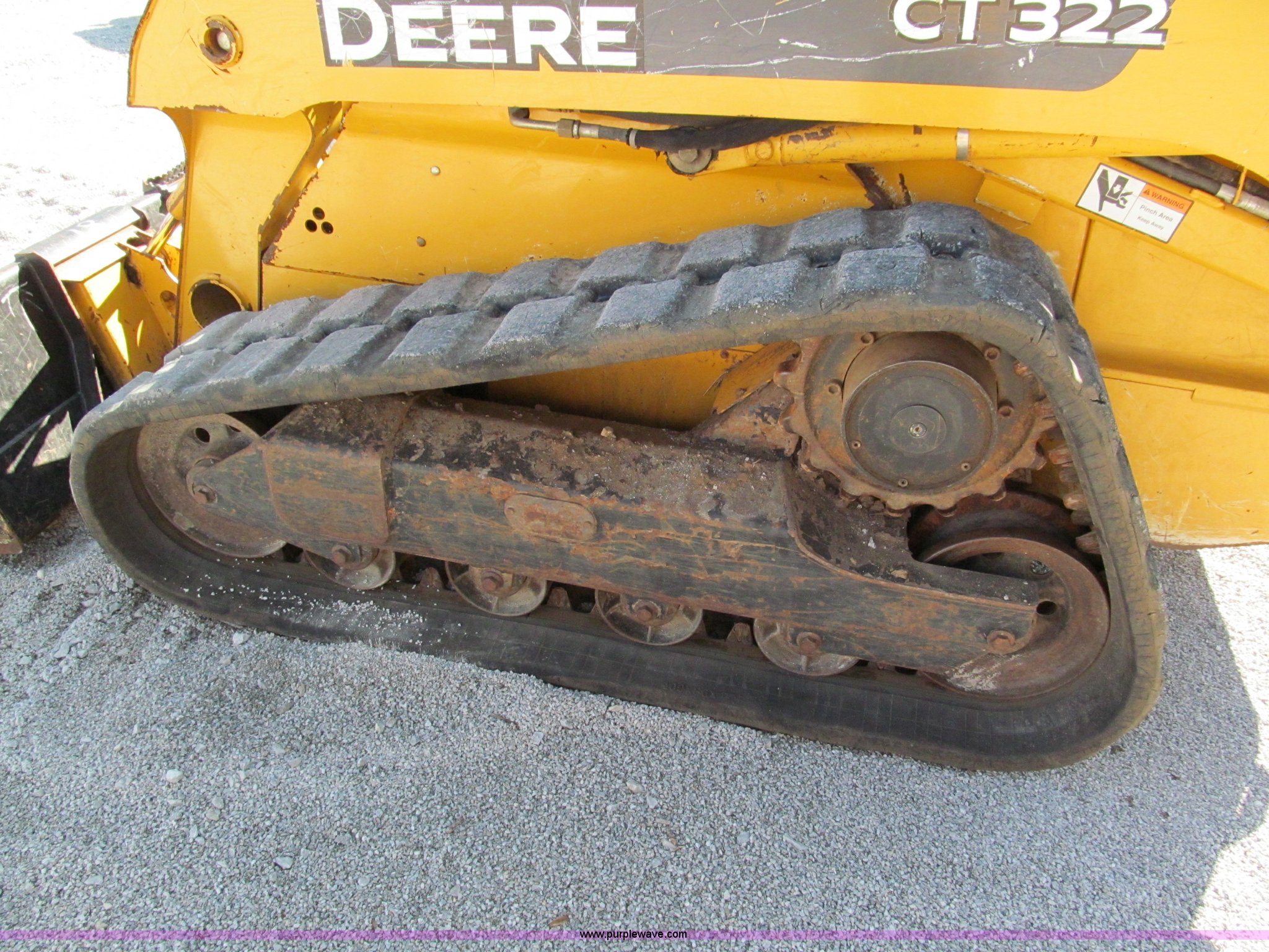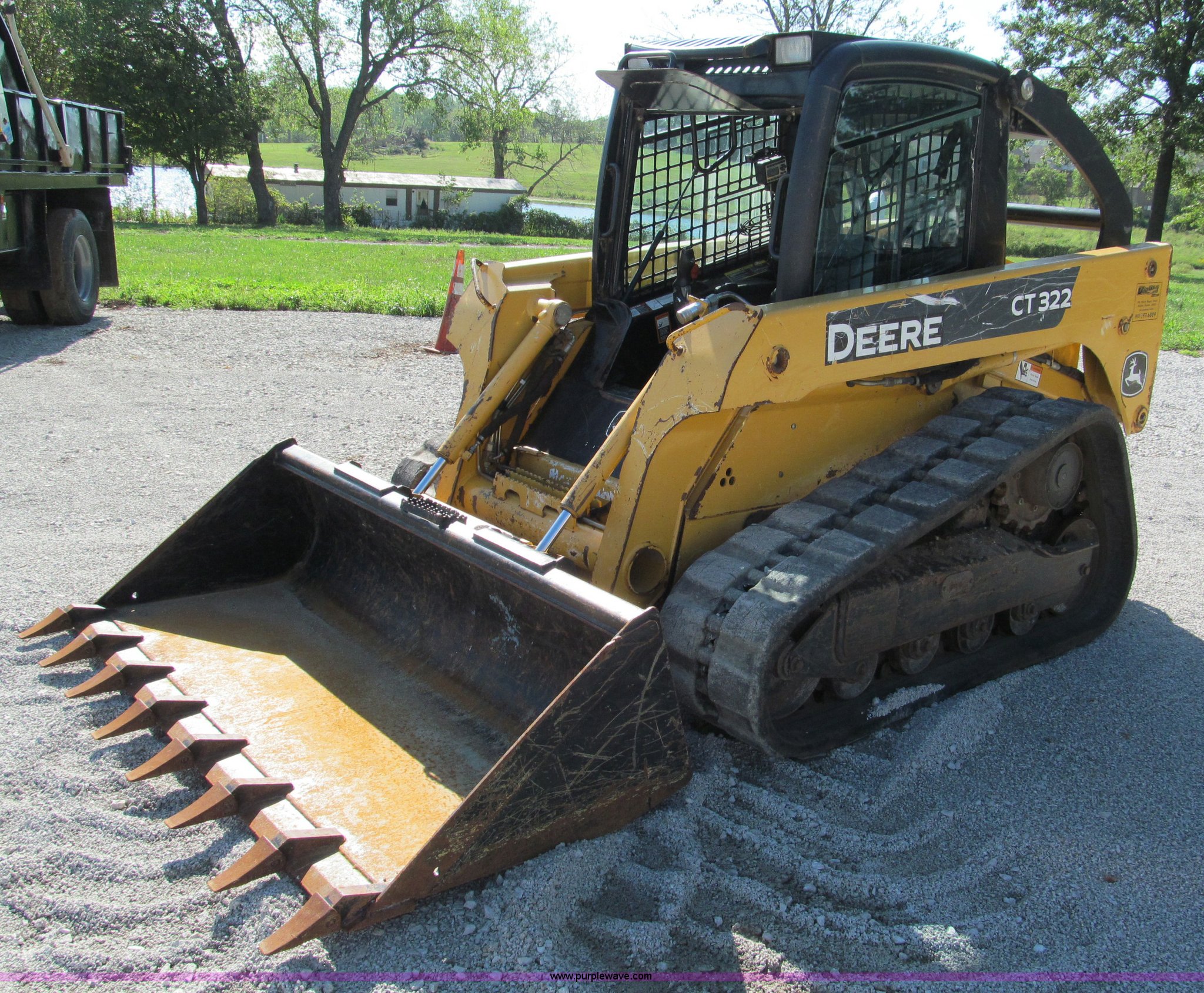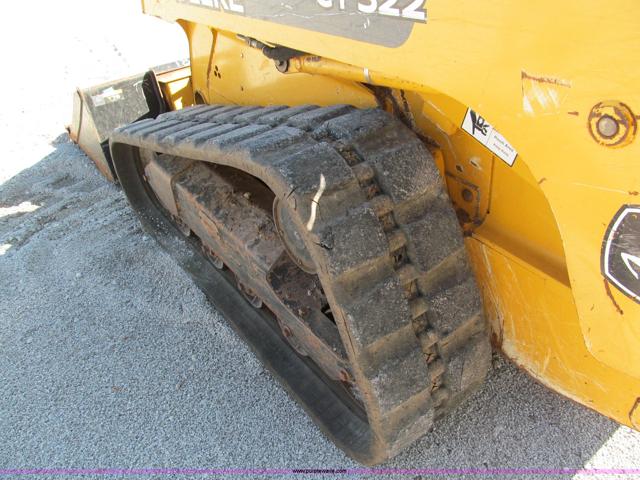 Purple Wave is selling a used Tracked Skid Steer Loader in Missouri. This item is a 2006 John Deere CT322 track skid steer with the following: 1,818 hours on meter, John Deere four cylinder turbo diesel engine, 66 HP, Enclosed cab, AC and heat, Foot controls, Hydraulic quick attach, Auxiliary hydraulics, 76" toothed bucket, 2,178 lbs operating load, 16"W tracks, 8,305 lbs. base operating weight, Serial T0322TB129114