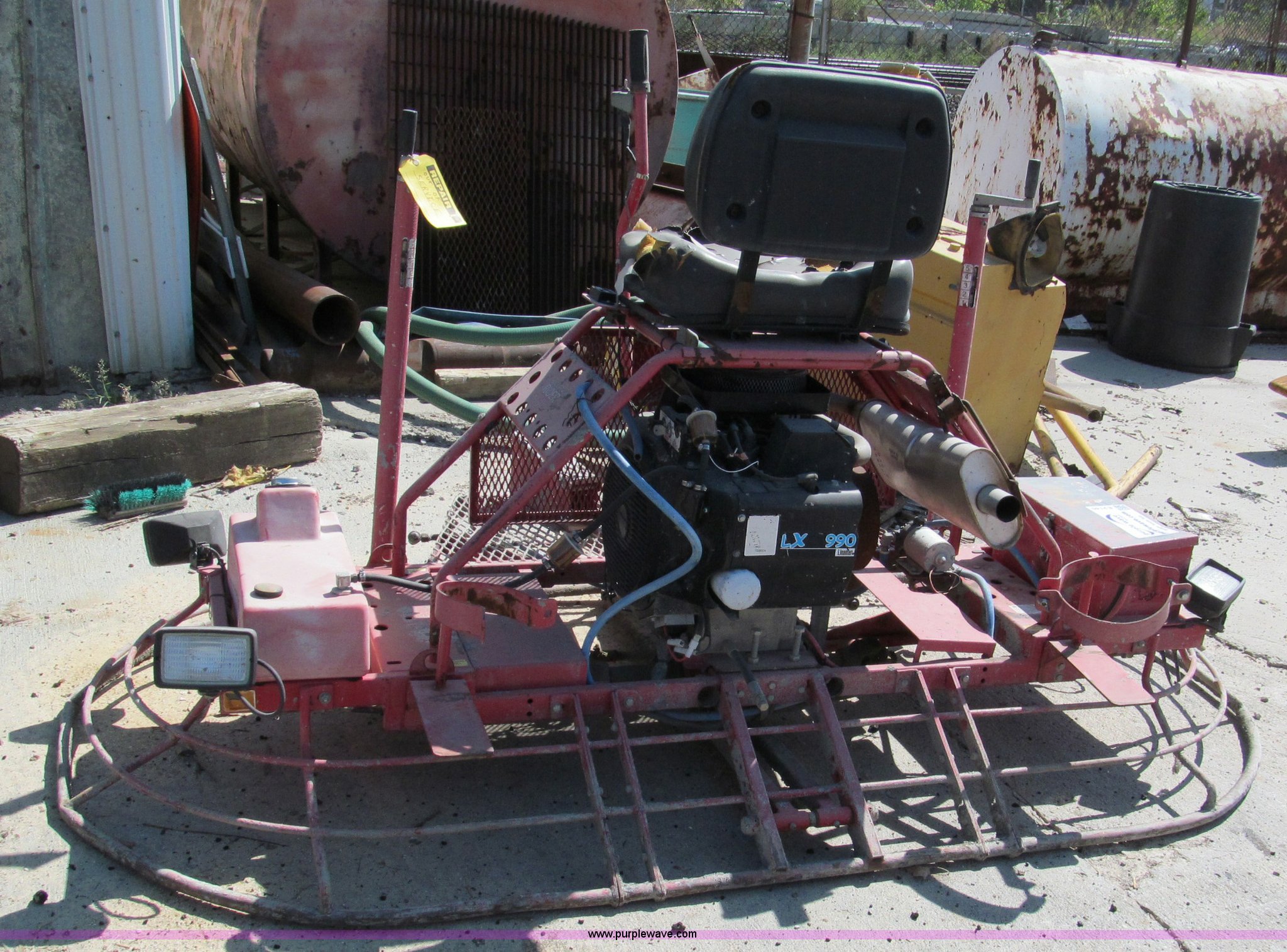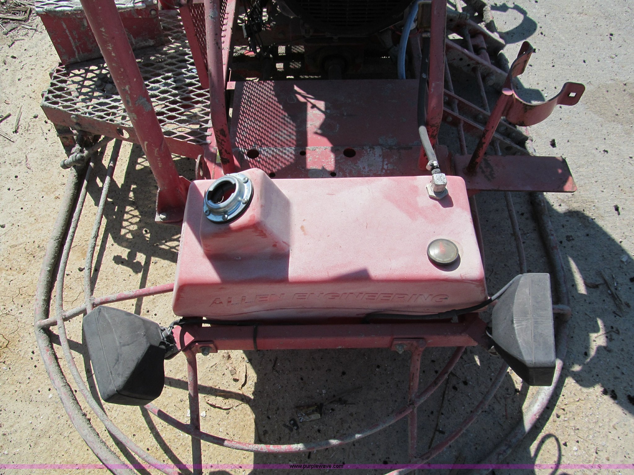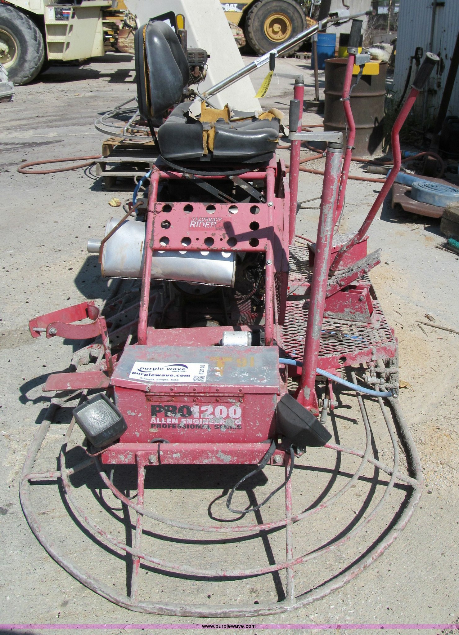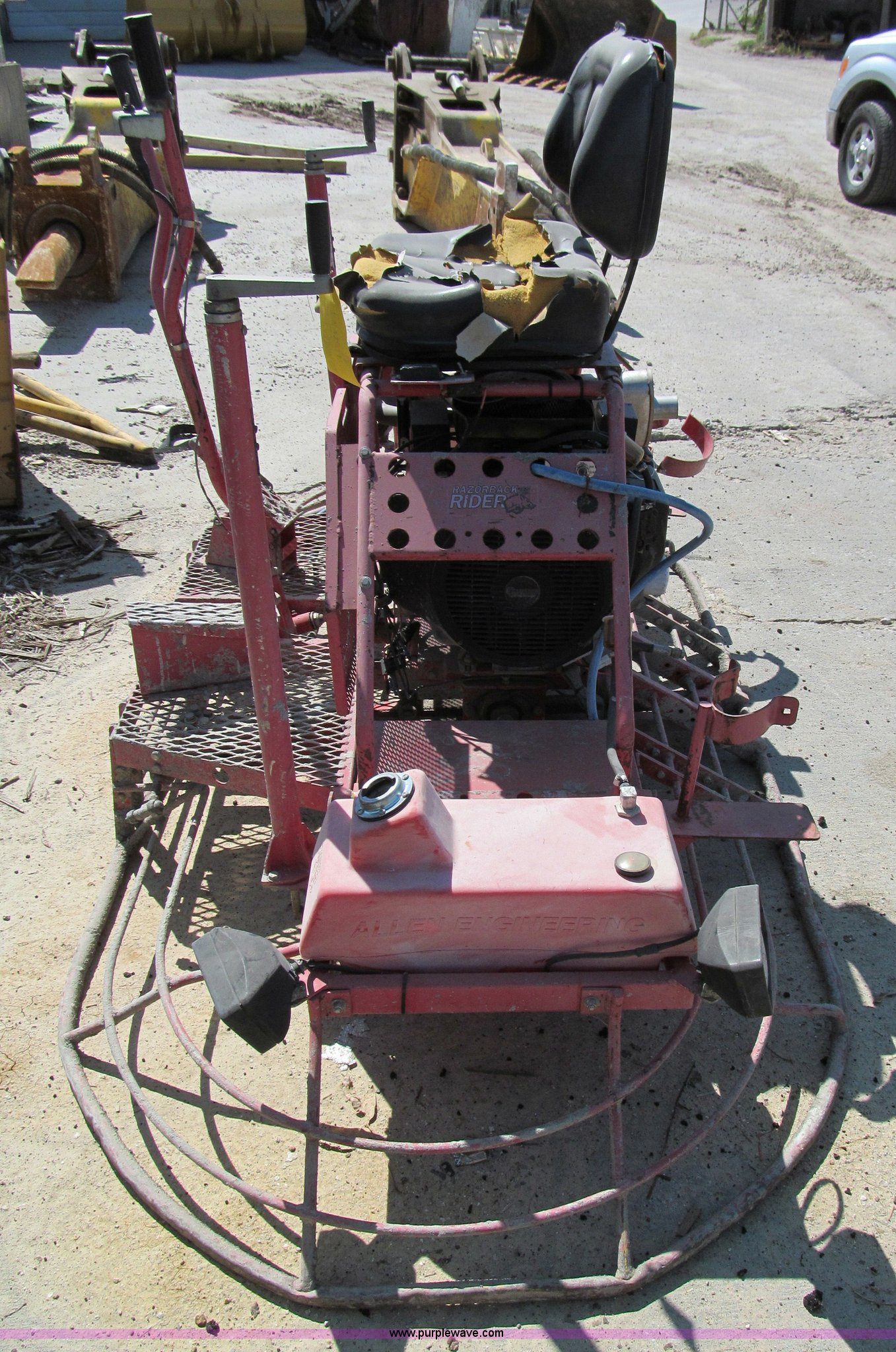 Purple Wave is selling a used Concrete Equip. or Acces. in Missouri. This item is a Allen 8' ride-on power trowel with the following: Hours unknown, Model Pro 1200, Razor Back Rider series, Linamar LX990 two cylinder gas engine, Missing parts, Does not run, parts only
