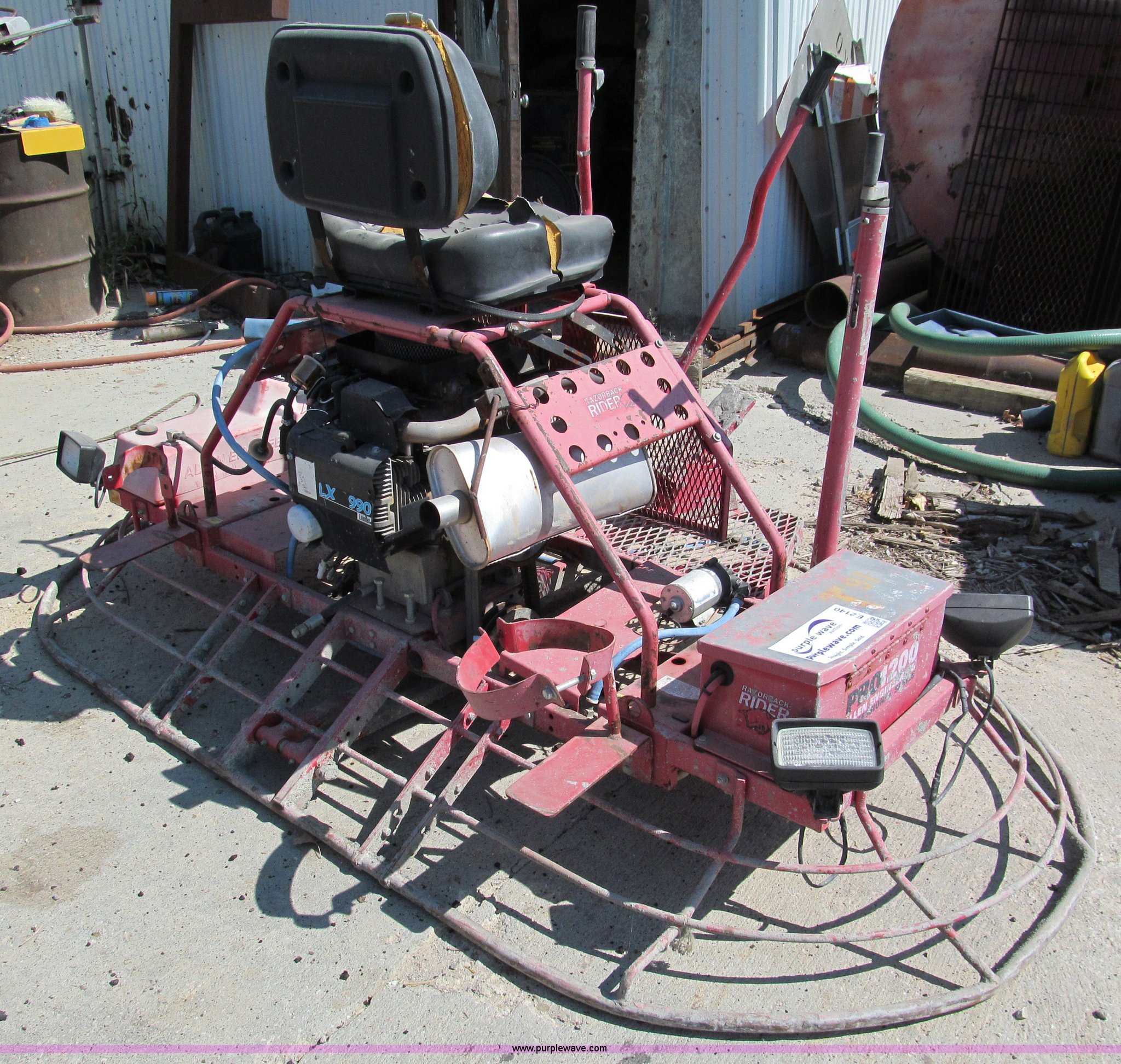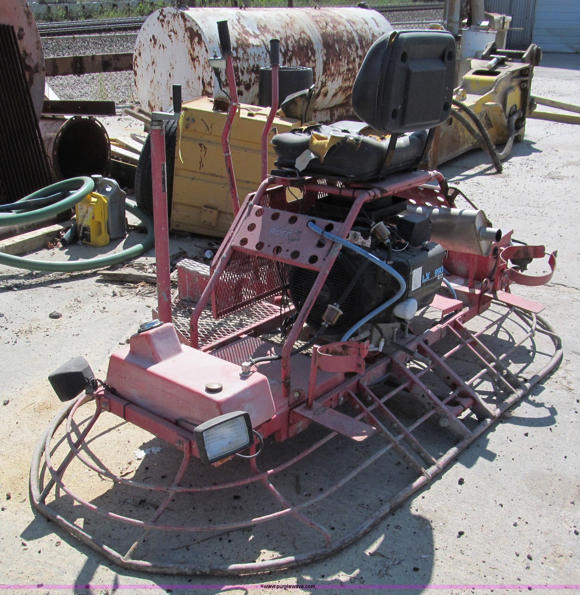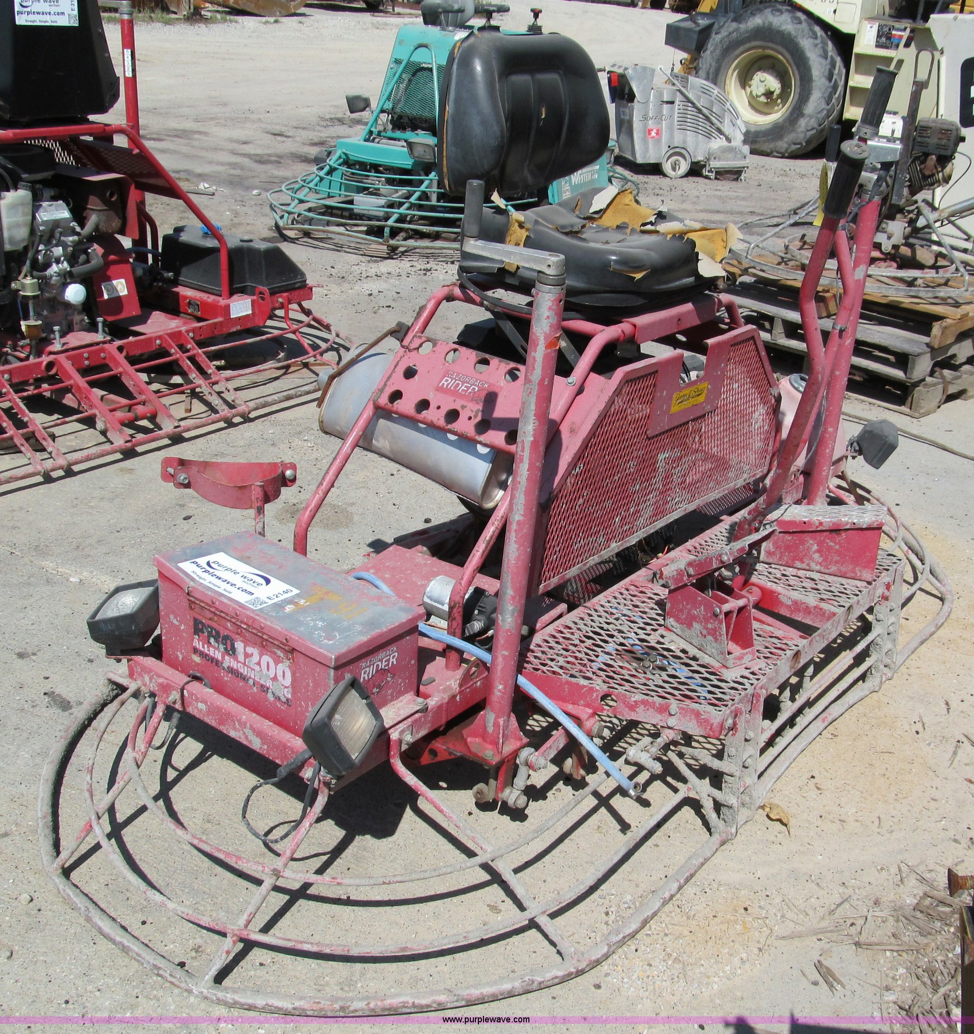 Purple Wave is selling a used Concrete Equip. or Acces. in Missouri. This item is a Allen 8' ride-on power trowel with the following: Hours unknown, Model Pro 1200, Razor Back Rider series, Linamar LX990 two cylinder gas engine, Missing parts, Does not run, parts only