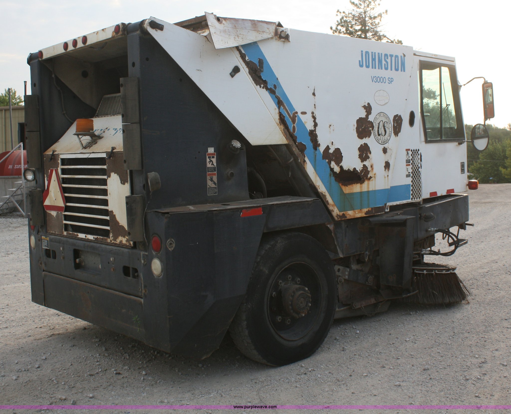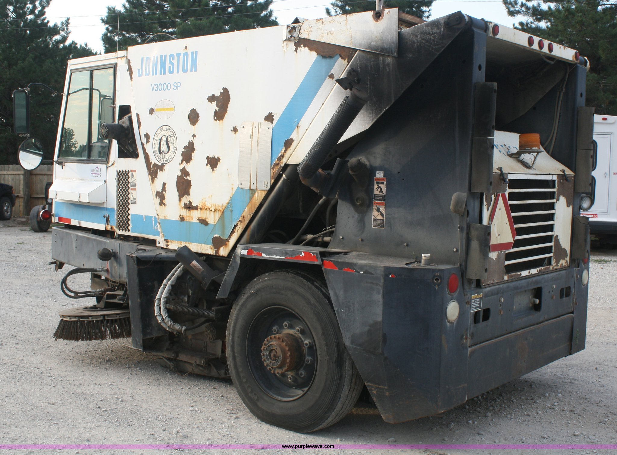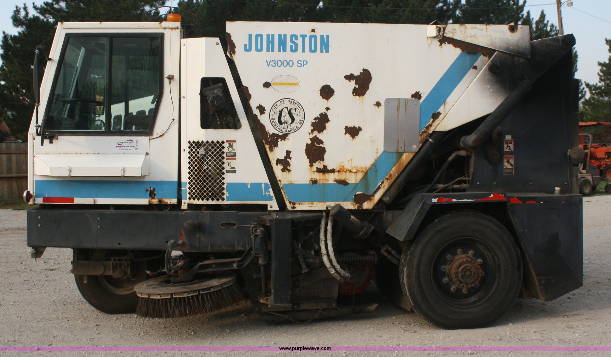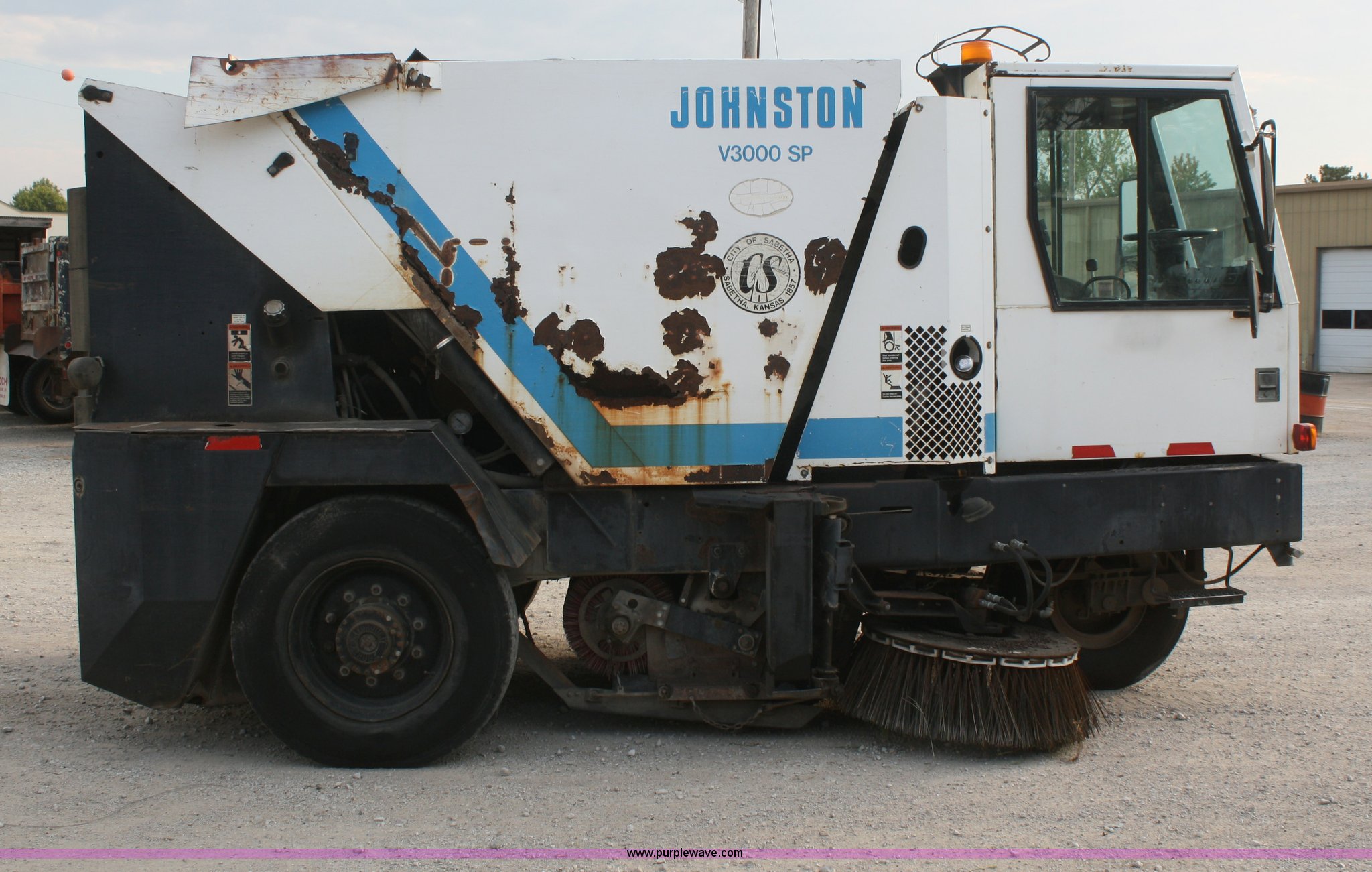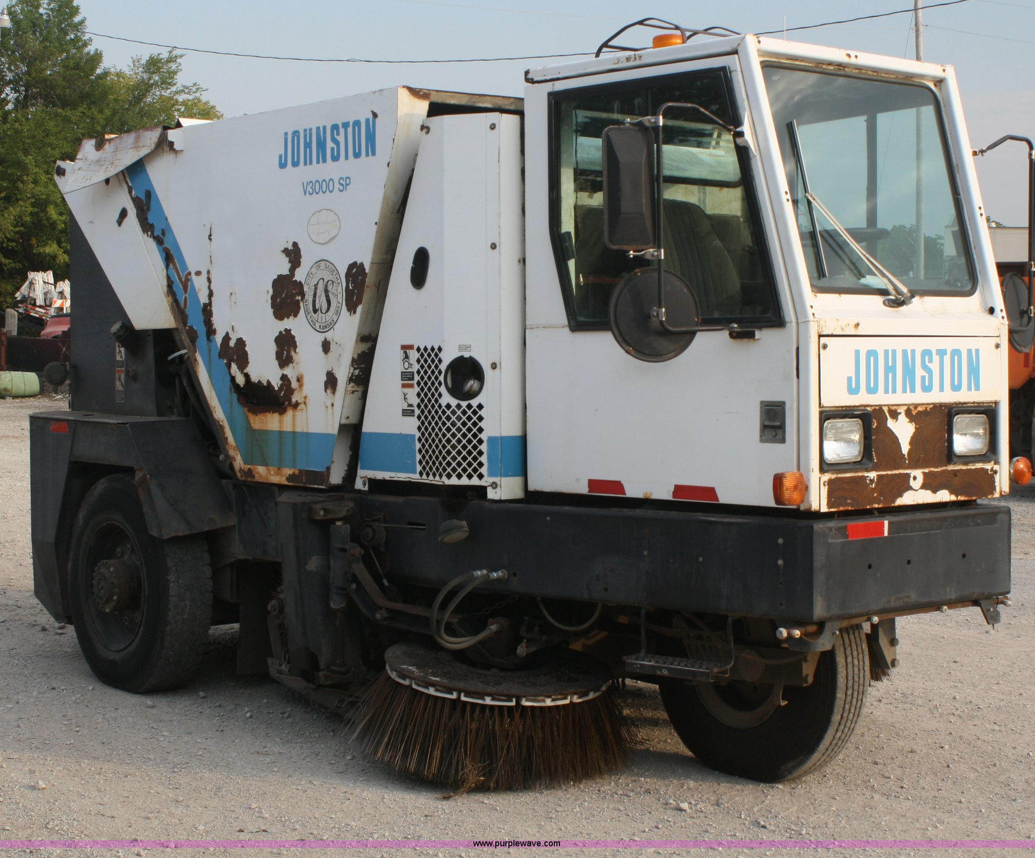 1994 Johnston V3000SP street sweeper. 30,643 miles on odometer, 7,146 hours on meter, John Deere four cylinder turbo diesel engine, Two speed hydrostatic transmission, AC and heat, AM/FM, 4 cu. yd. bin, 60" center broom, 11R22.5 tires, Bin is rusted through. 1JSVM3H41RC041044. Shipping quotes available. City of Sabetha. 700 S 14th. Sabetha, KS 66534