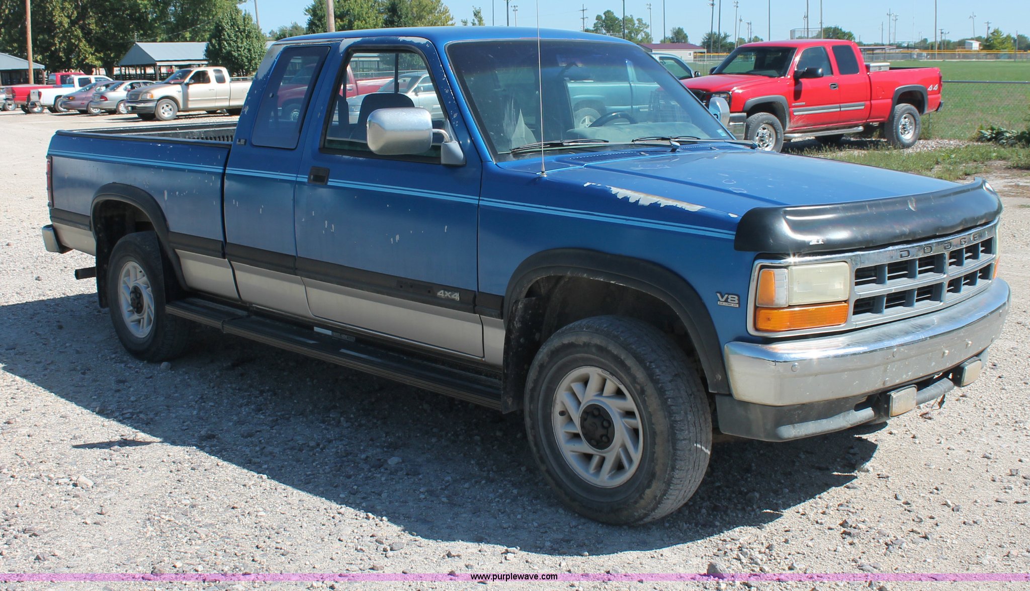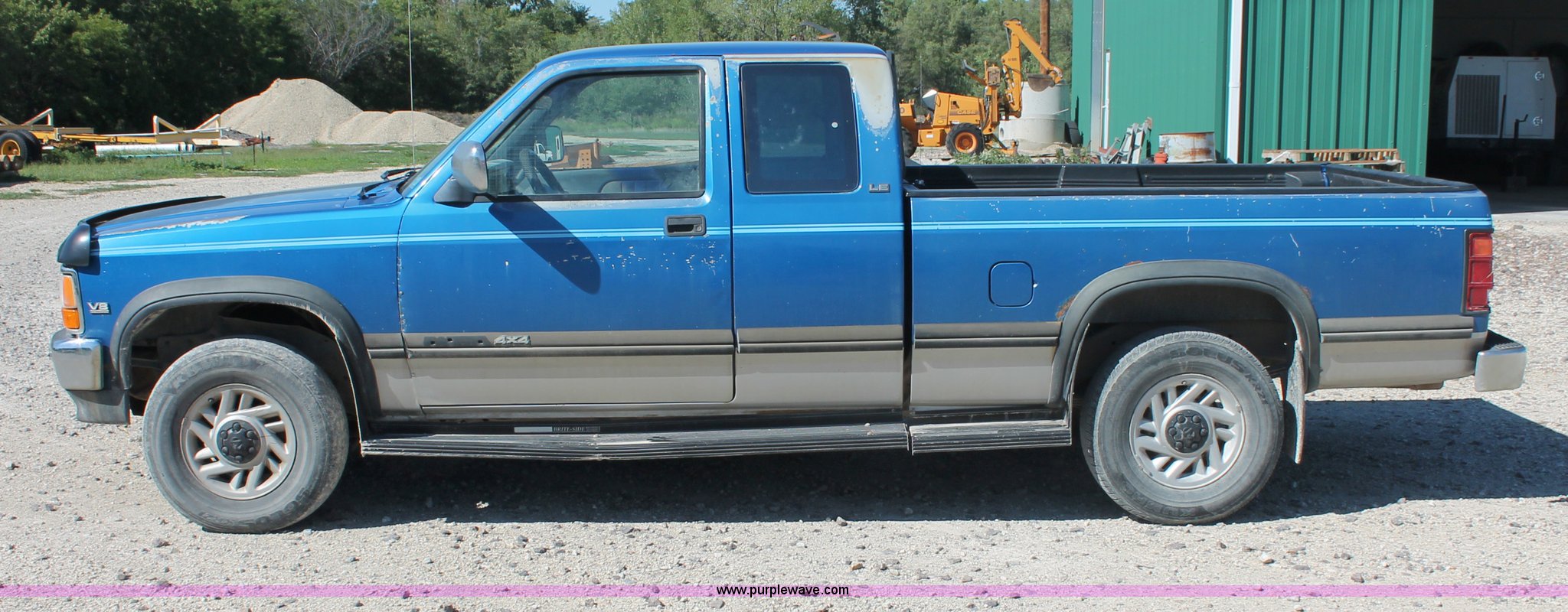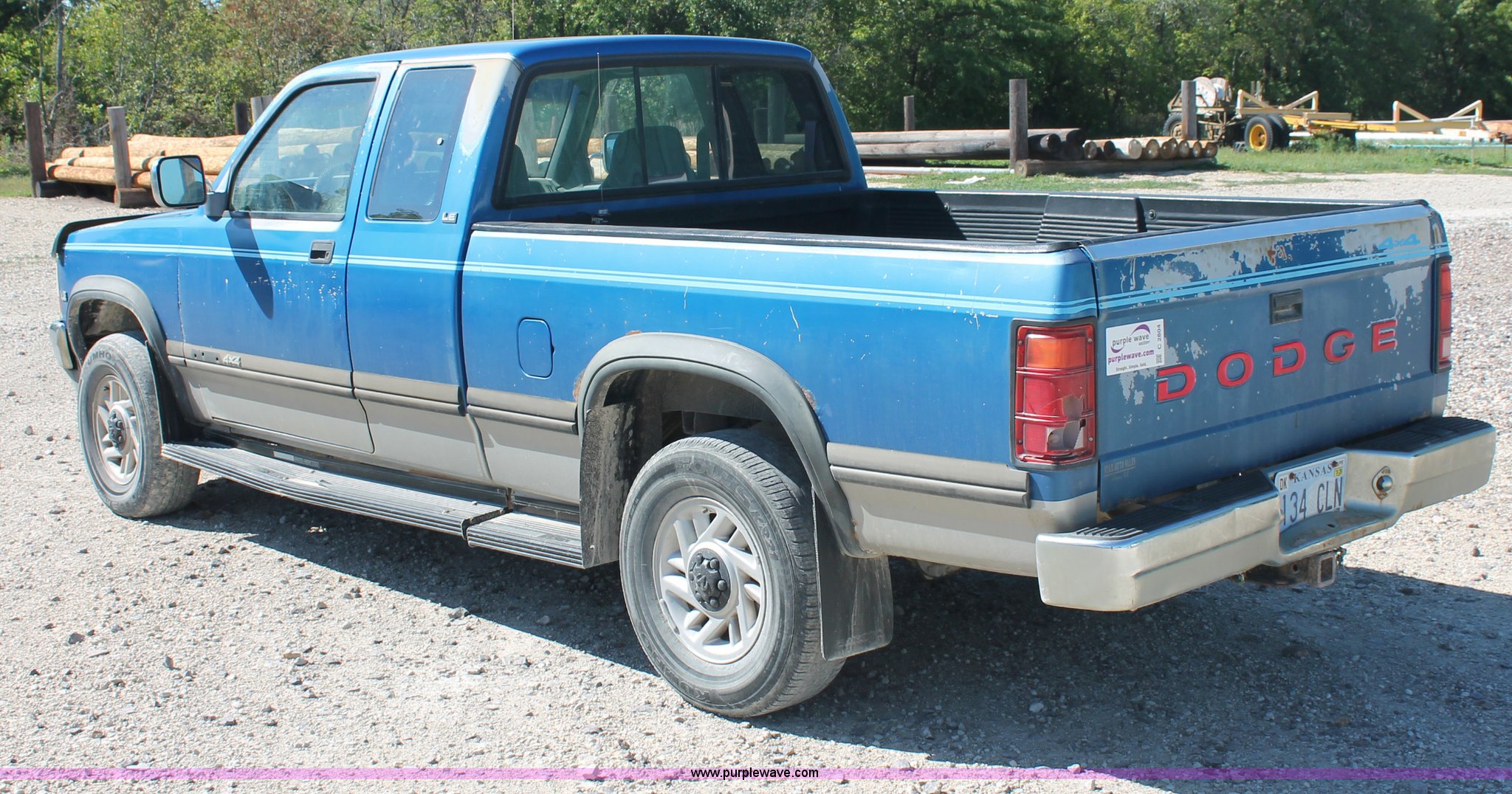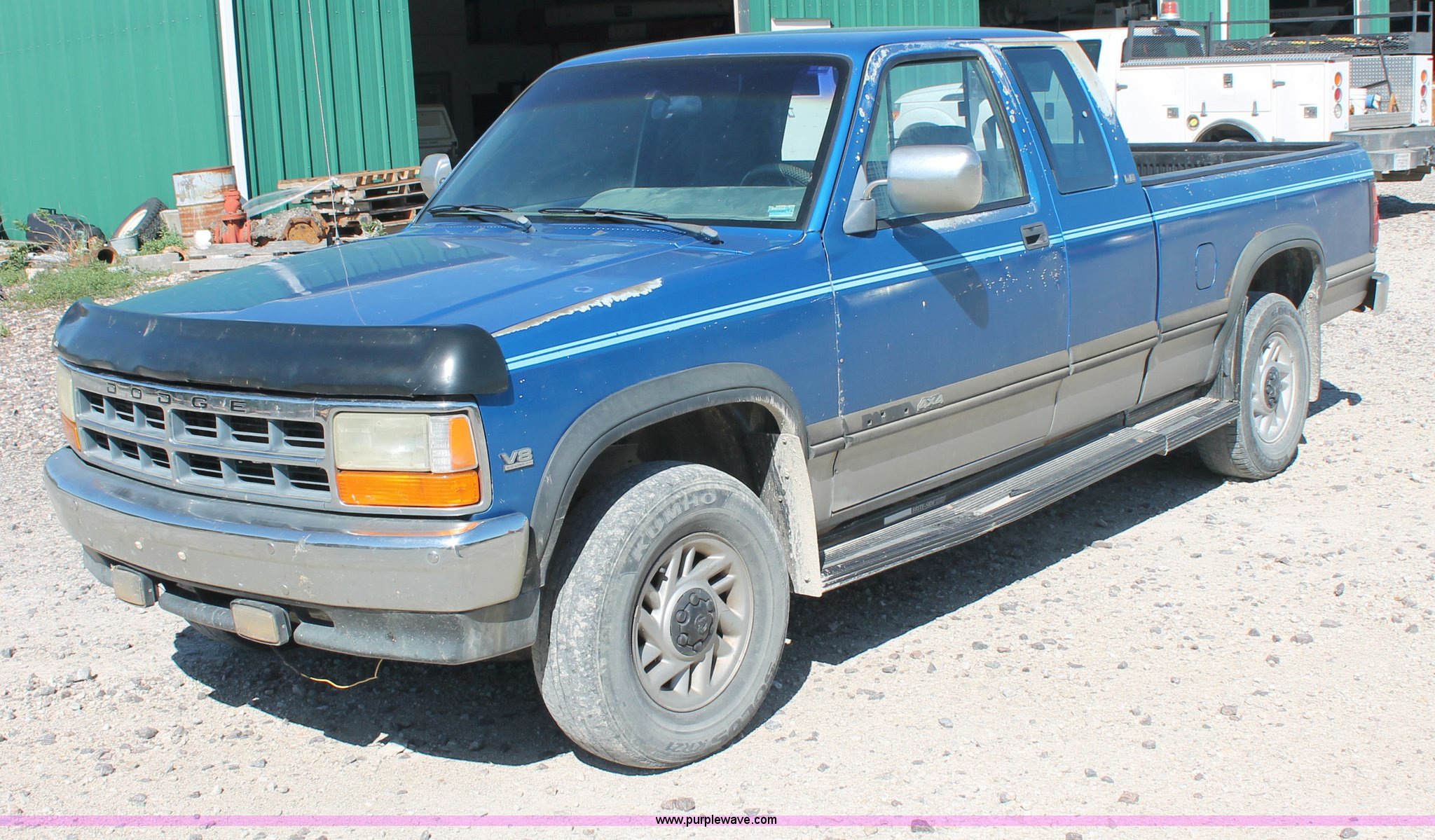 Purple Wave is selling a used Passenger Vehicle in Kansas. This item is a 1993 Dodge Dakota Club Cab pickup truck with the following: 189,559 actual miles, 5.2L V8 MPI gas engine, Automatic transmission, Four wheel drive, AC and heat, Tilt, Cruise, AM/FM/cassette, Power windows, locks, and mirrors, Cloth interior, Plastic bed liner, Running boards, Receiver hitch, 235/75R15 tires, Radiator cracked, Consumes oil, Four wheel drive makes noise