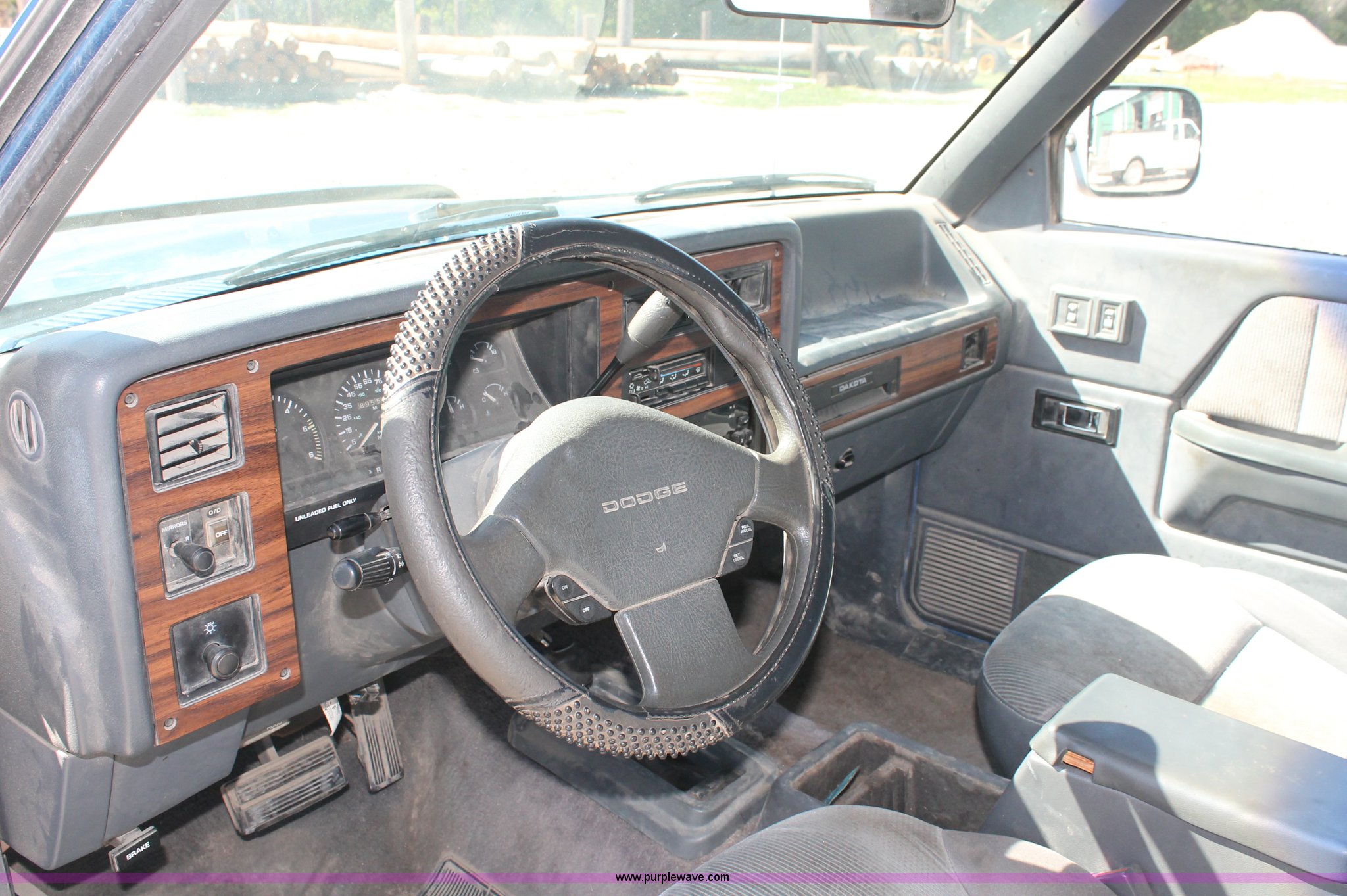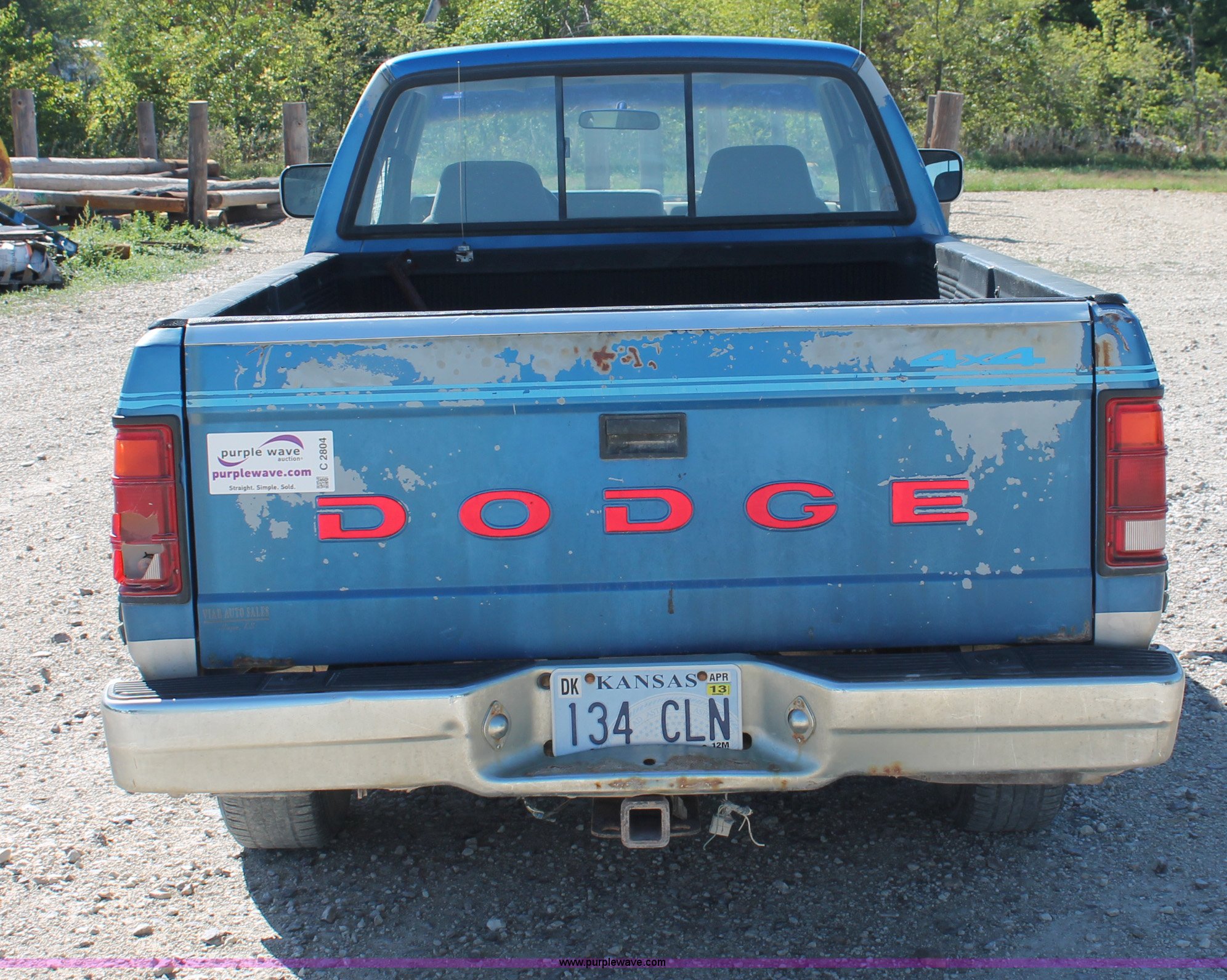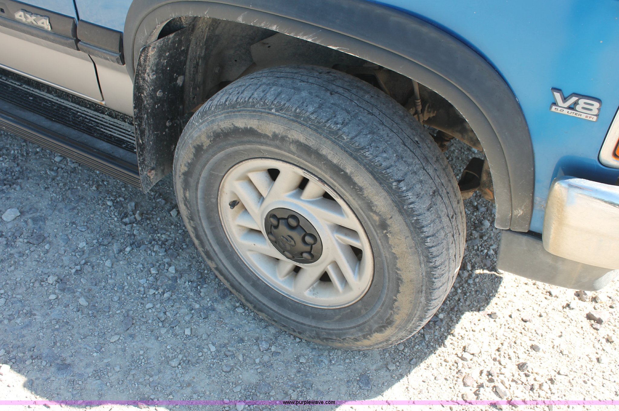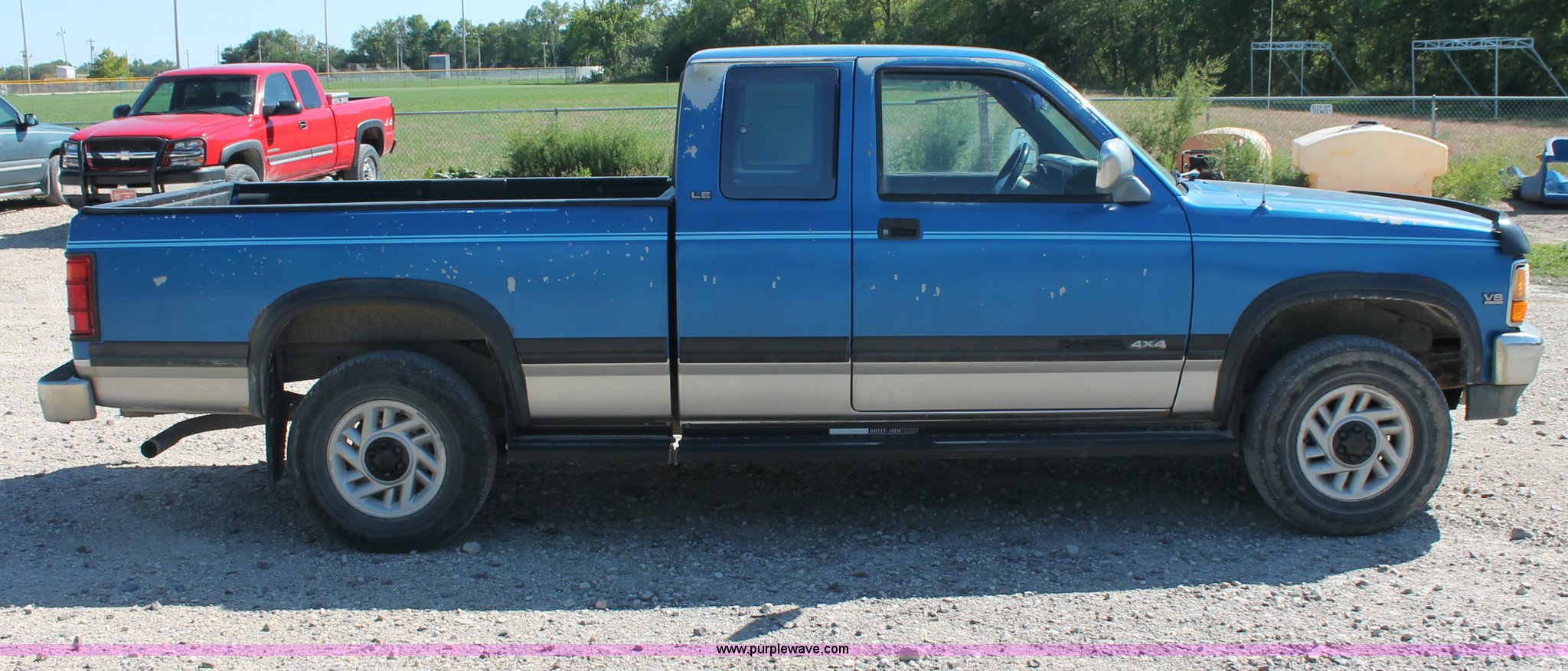 Purple Wave is selling a used Passenger Vehicle in Kansas. This item is a 1993 Dodge Dakota Club Cab pickup truck with the following: 189,559 actual miles, 5.2L V8 MPI gas engine, Automatic transmission, Four wheel drive, AC and heat, Tilt, Cruise, AM/FM/cassette, Power windows, locks, and mirrors, Cloth interior, Plastic bed liner, Running boards, Receiver hitch, 235/75R15 tires, Radiator cracked, Consumes oil, Four wheel drive makes noise