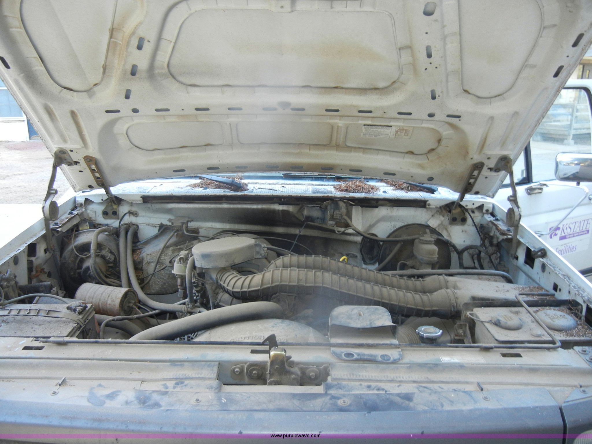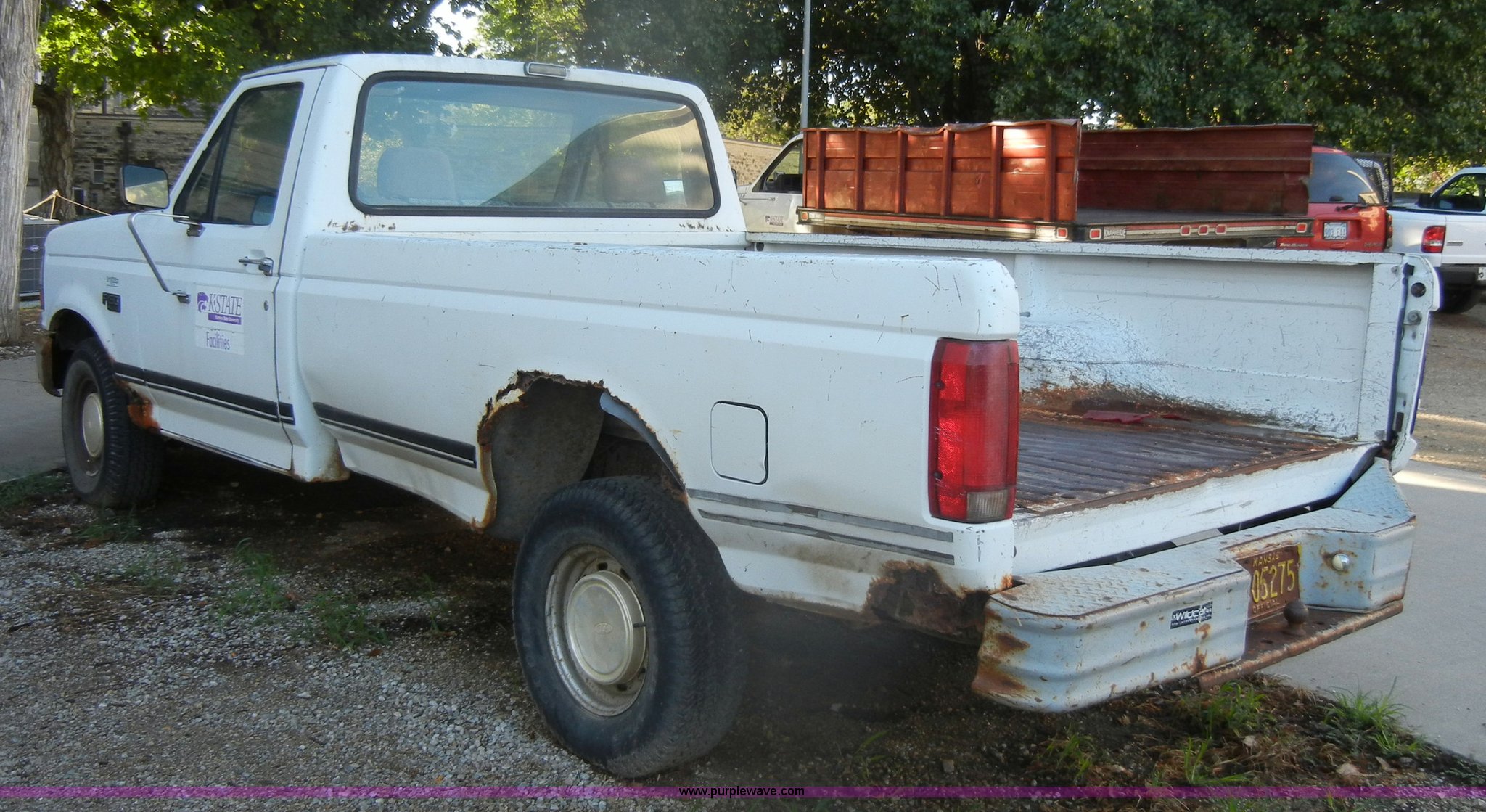 1993 Ford F150 XL pickup truck. 93,452 miles on odometer, 5.0L V8 EFI gas engine, Automatic transmission, Heat, AM/FM, Manual windows, Ball hitch, Trailer wiring, 235/75R15 tires, Maintenance records, Interior/exterior cosmetic damage, Engine leaks oil, Belts need replaced, Dead battery, No brakes lines, rusted through, Body rust, Dents and scratches, Rear taillight broken, Missing tailgate, Cracked dash, Holes in floorboard , Missing rear view mirror, Must be towed, no brakes. 2FTEF15N6PCA67607. Shipping quotes available. KSU Facilities. 226 Dykstra Hall. Manhattan, KS 66506