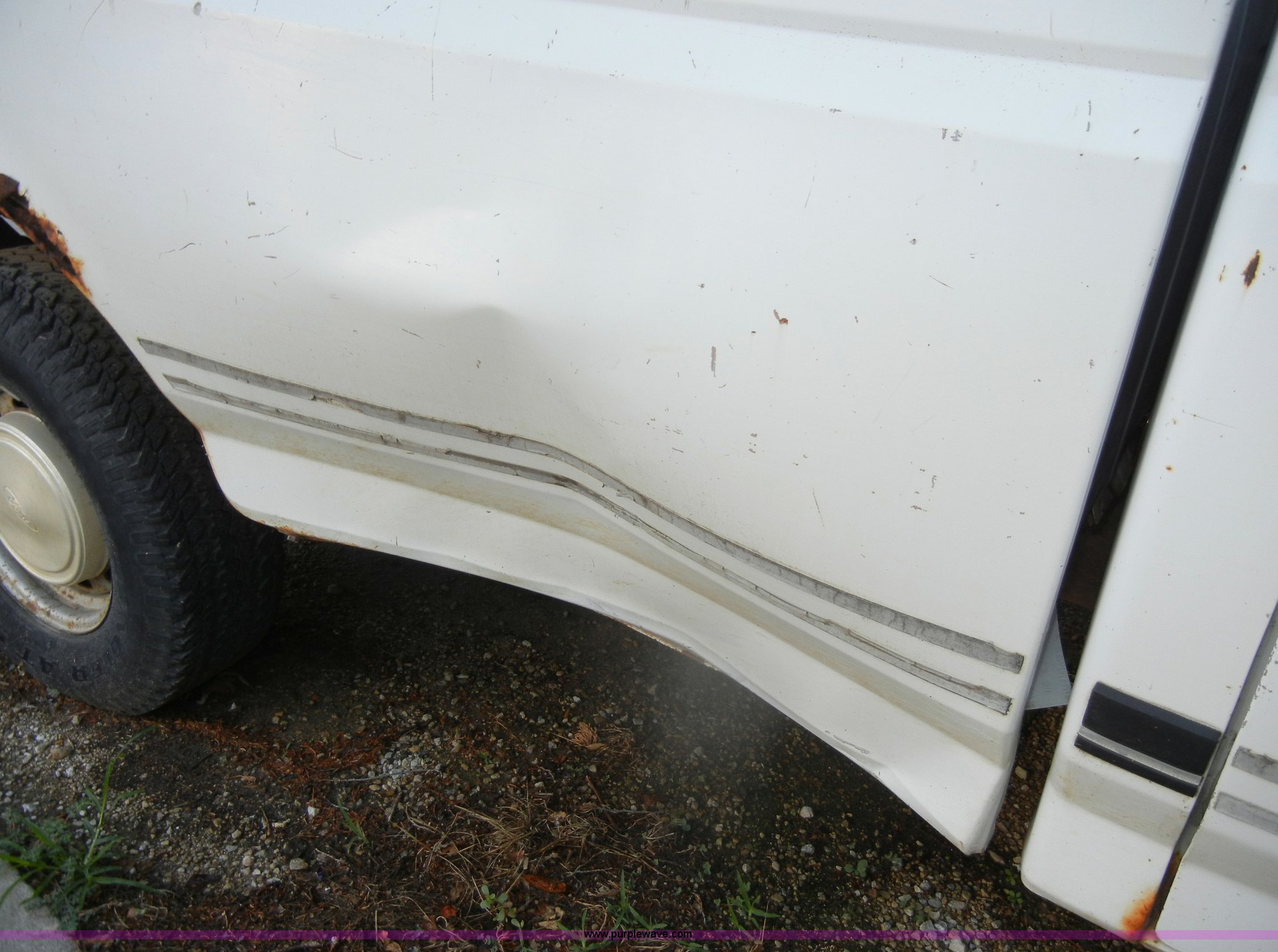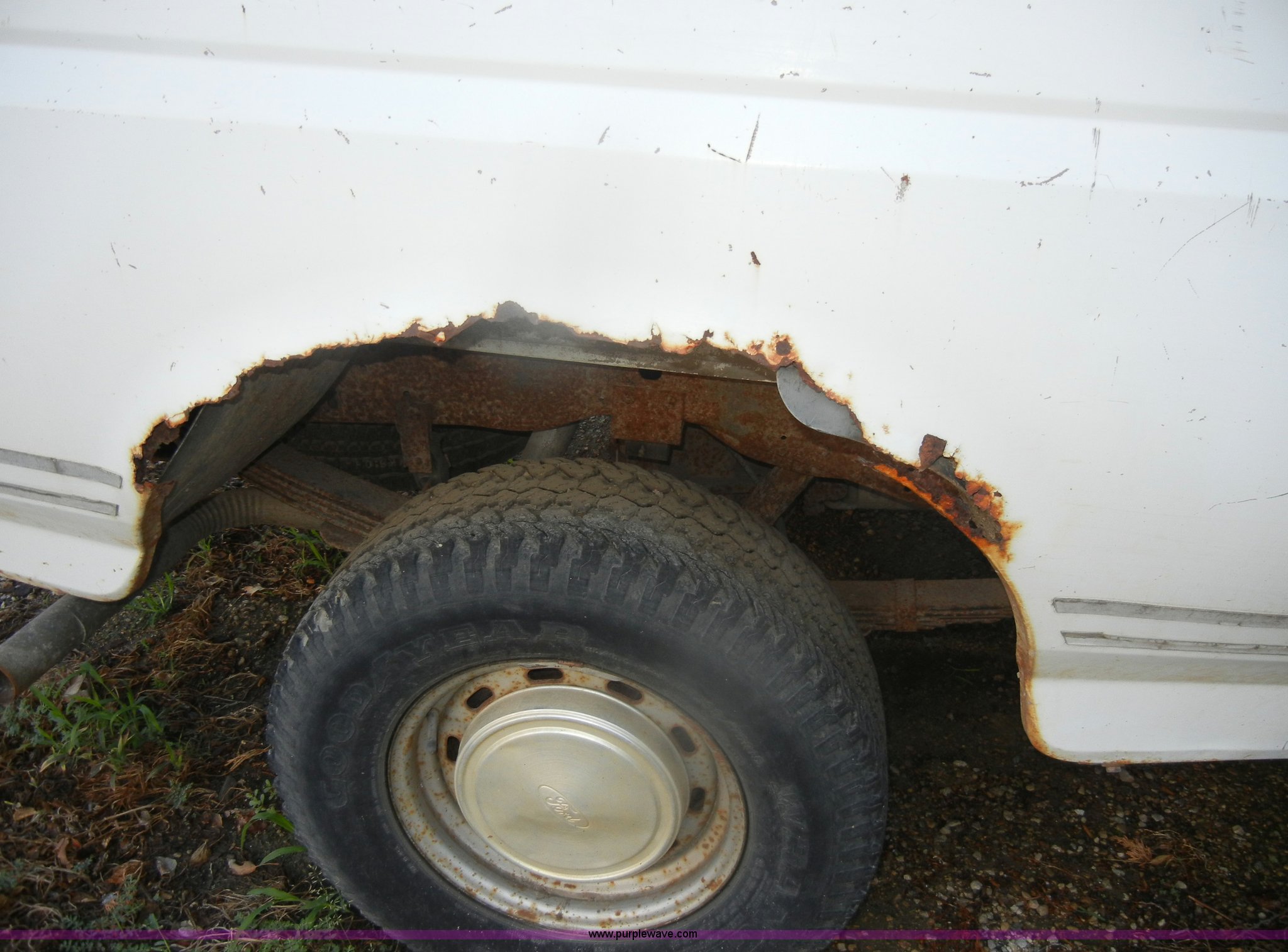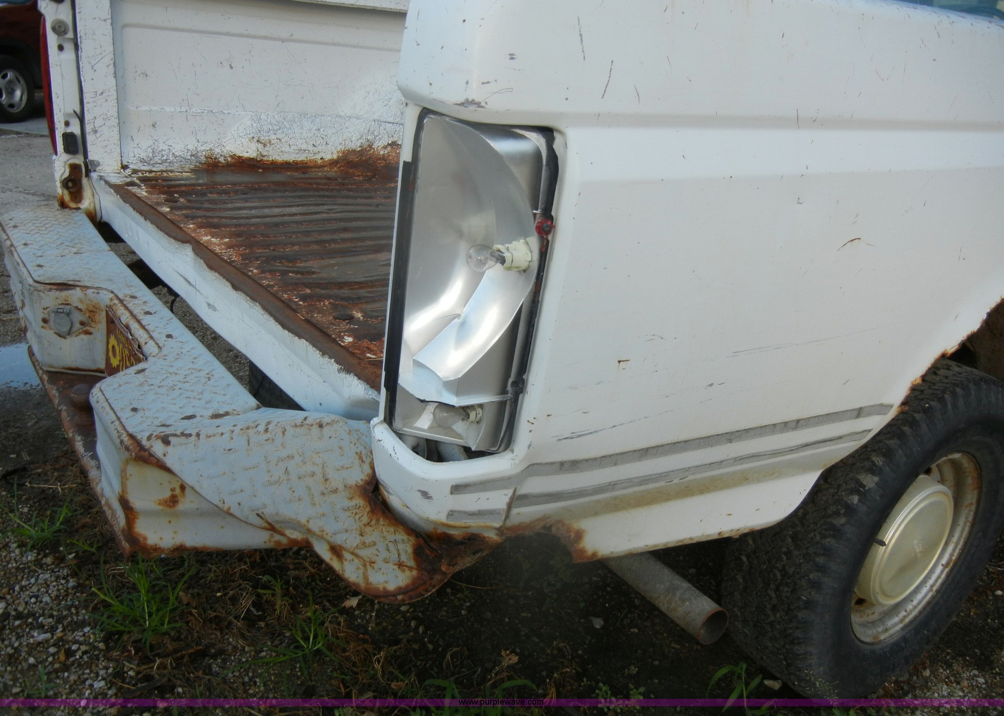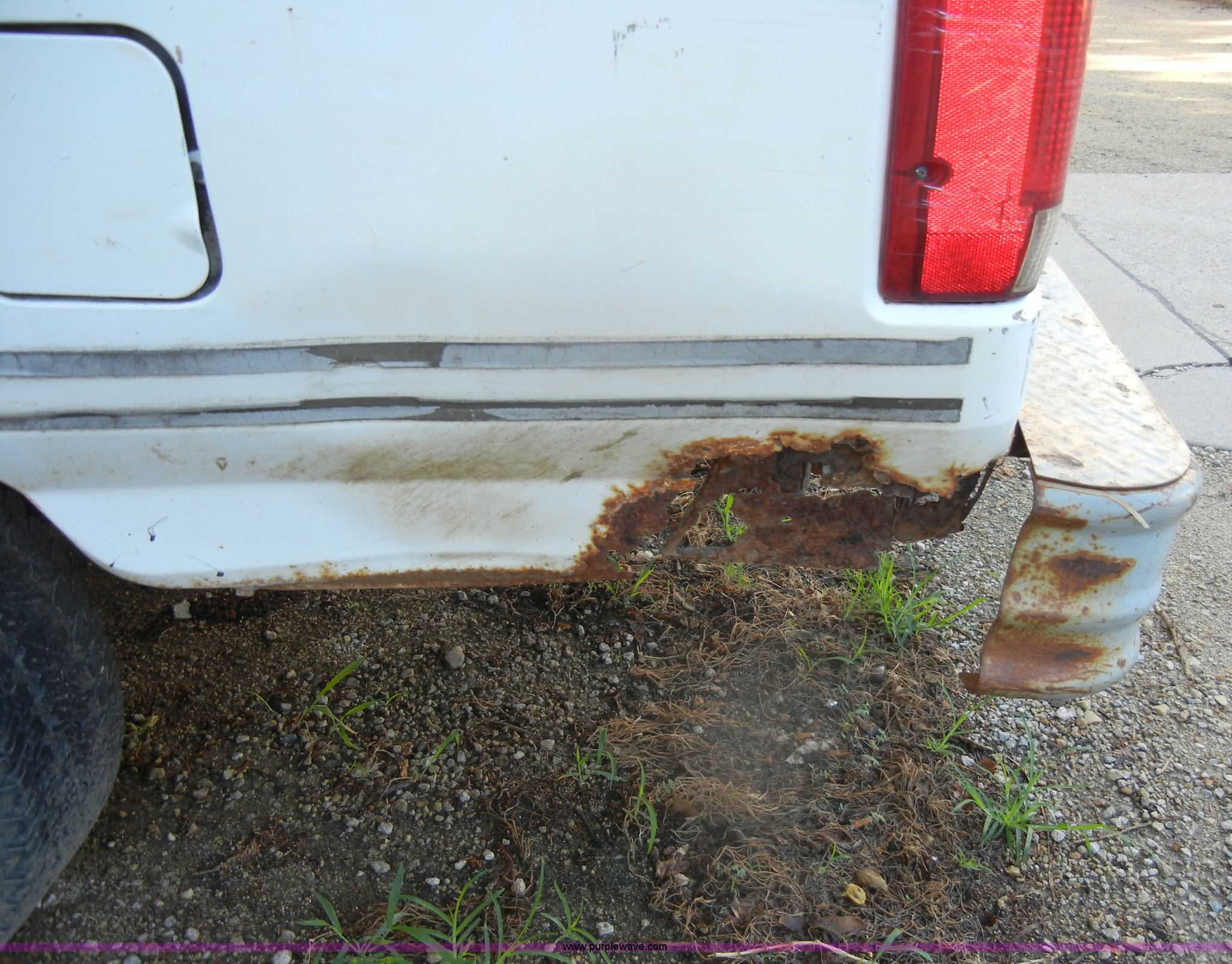 Purple Wave is selling a used Passenger Vehicle in Kansas. This item is a 1993 Ford F150 XL pickup truck with the following: 93,452 miles on odometer, 5.0L V8 EFI gas engine, Automatic transmission, Heat, AM/FM, Manual windows, Ball hitch, Trailer wiring, 235/75R15 tires, Maintenance records, Interior/exterior cosmetic damage, Engine leaks oil, Belts need replaced, Dead battery, No brakes lines, rusted through, Body rust, Dents and scratches, Rear taillight broken, Missing tailgate, Cracked dash, Holes in floorboard, Missing rear view mirror, Must be towed, no brakes