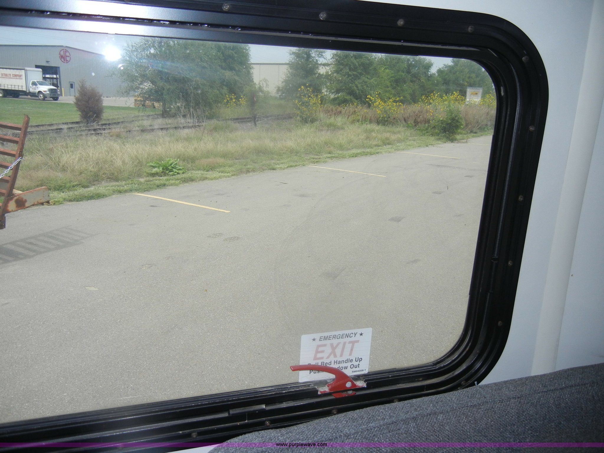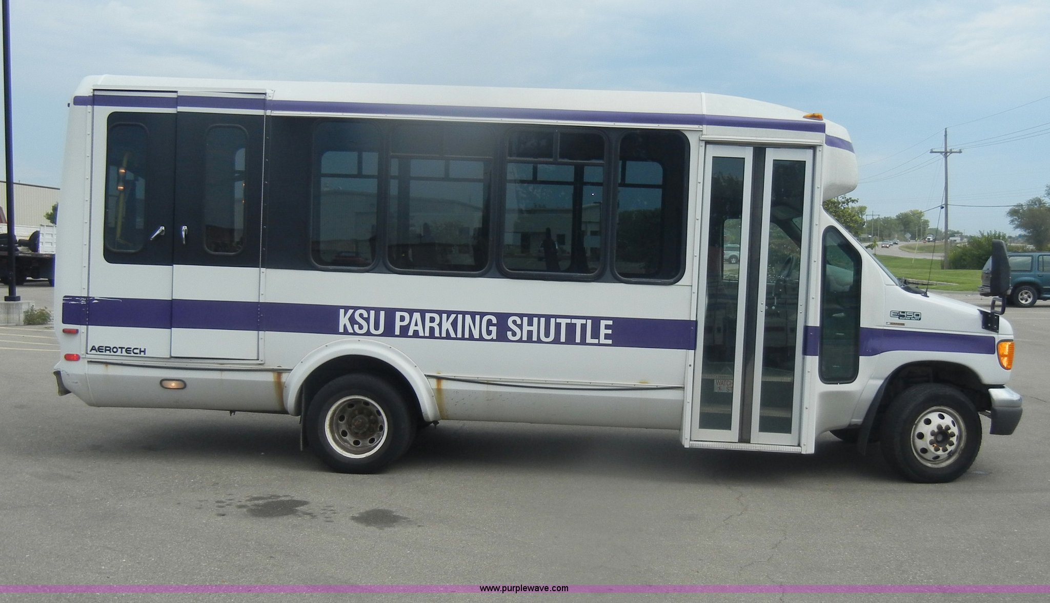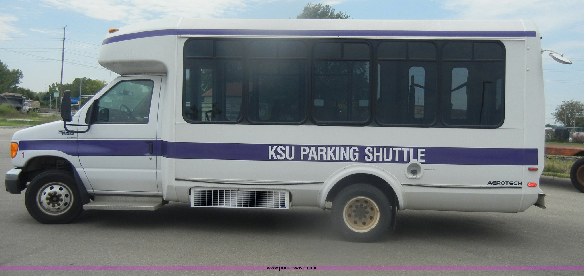 2005 Ford E450 Super Duty shuttle bus. 51,329 miles on odometer, 6.8L V10 EFI gas engine, Automatic transmission, AC and heat, Tilt, Cruise, AM/FM, Manual windows and locks, Cloth interior, Carrier rear AC and heat unit, Thor-Aerotech body, 2005 Ricon S Series wheelchair lift Model K5005-F1020000A, Serial 00181031, 17 passenger (16) seats, One wheelchair, Extra seat cushion, Parts for wheelchair lift and straps, Manual and video, 225/75R16 tires, GVWR 14,050 lbs, Body rust. 1FDXE45SX5HA46506. Shipping quotes available. KSU Parking Services. 825 Levee Dr.. Manhattan, KS 66502