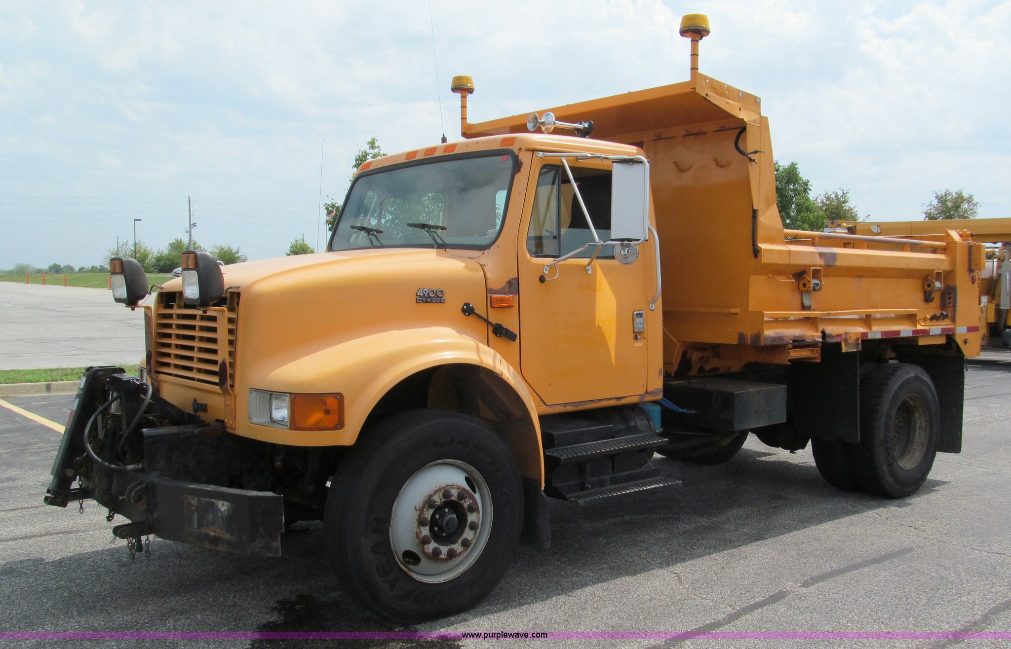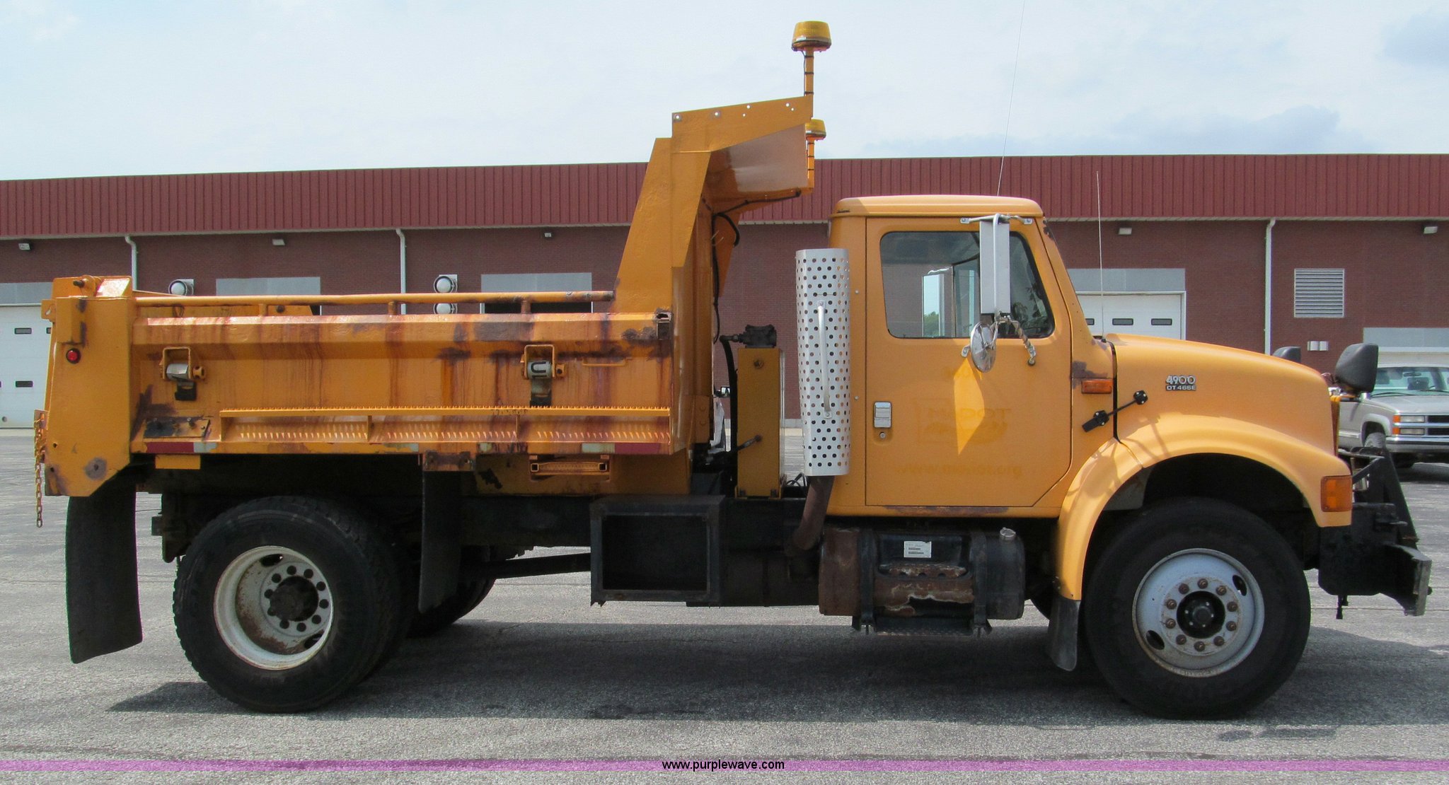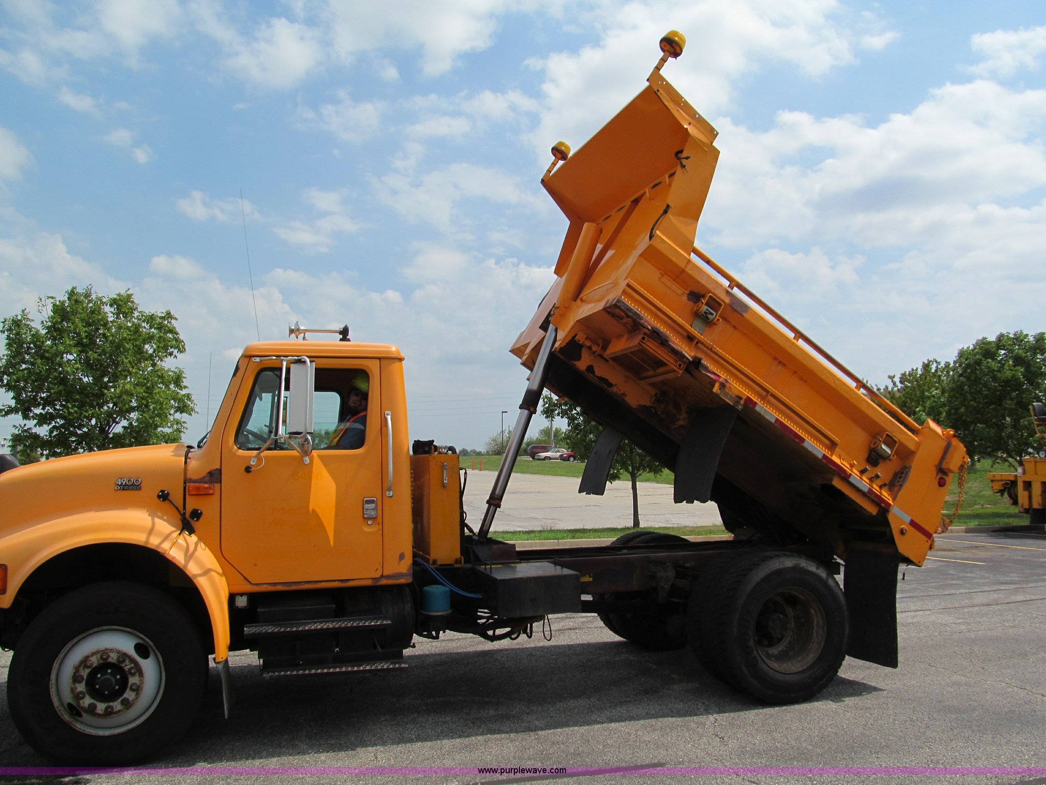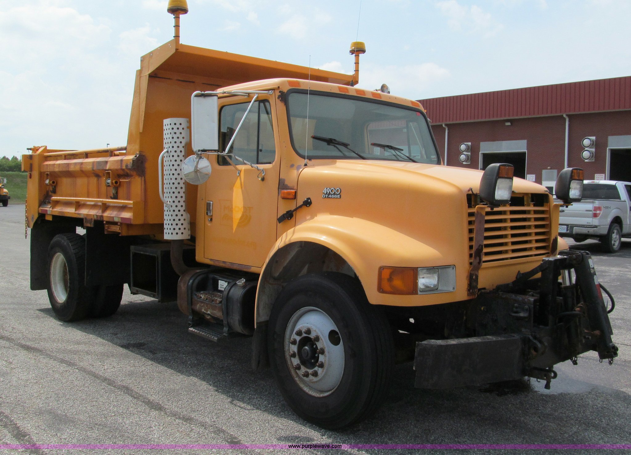 Purple Wave is selling a used Construction Dump Truck in Missouri. This item is a 2001 International 4900 dump truck with the following: 134,671 miles on odometer, 10,926 hours on meter, International DT466E 7.6L L6 diesel engine, Automatic transmission, Heat, Cruise, AM/FM, Air suspension seat, Heated mirrors, In-cab plow controls, 10'L dump bed, Bumper, Trailer wiring, Toolboxes, Pintle hitch, 50 gallon fuel tank, Trailer air brake hookups, (2) sets of auxiliary hydraulics for plows, PTO, Front mount PTO, Mudflaps, (2) bed mounted yellow warning lights, Rear tow hooks, (2) front mounted flood lights, Spring suspension, Air brakes, 170" wheelbase, 11R22.5 tires, MoDOT ID 6408