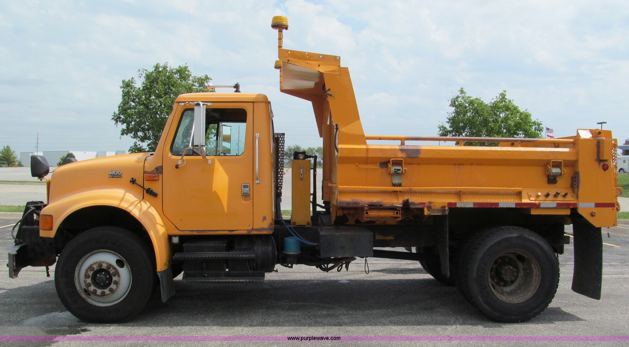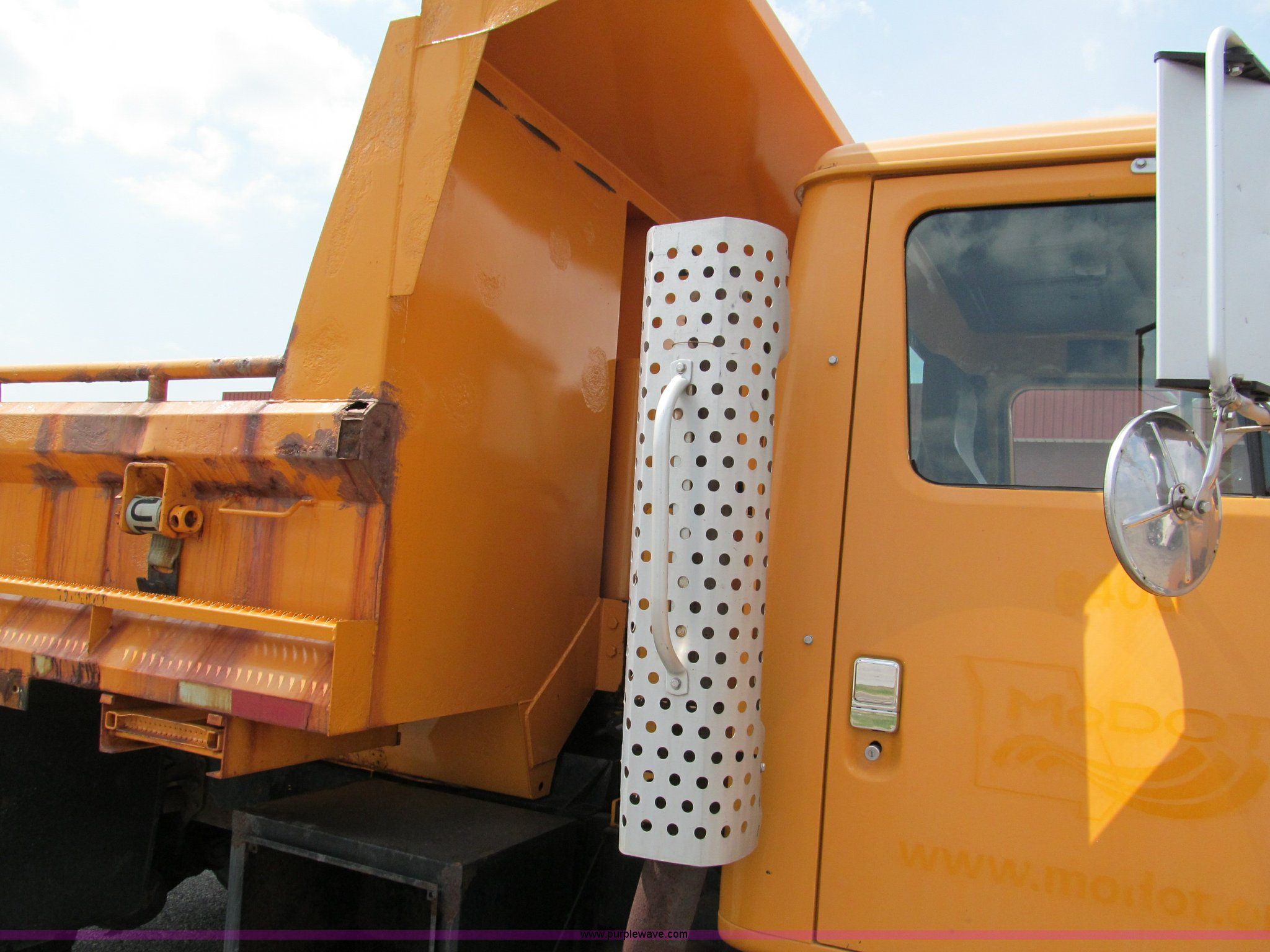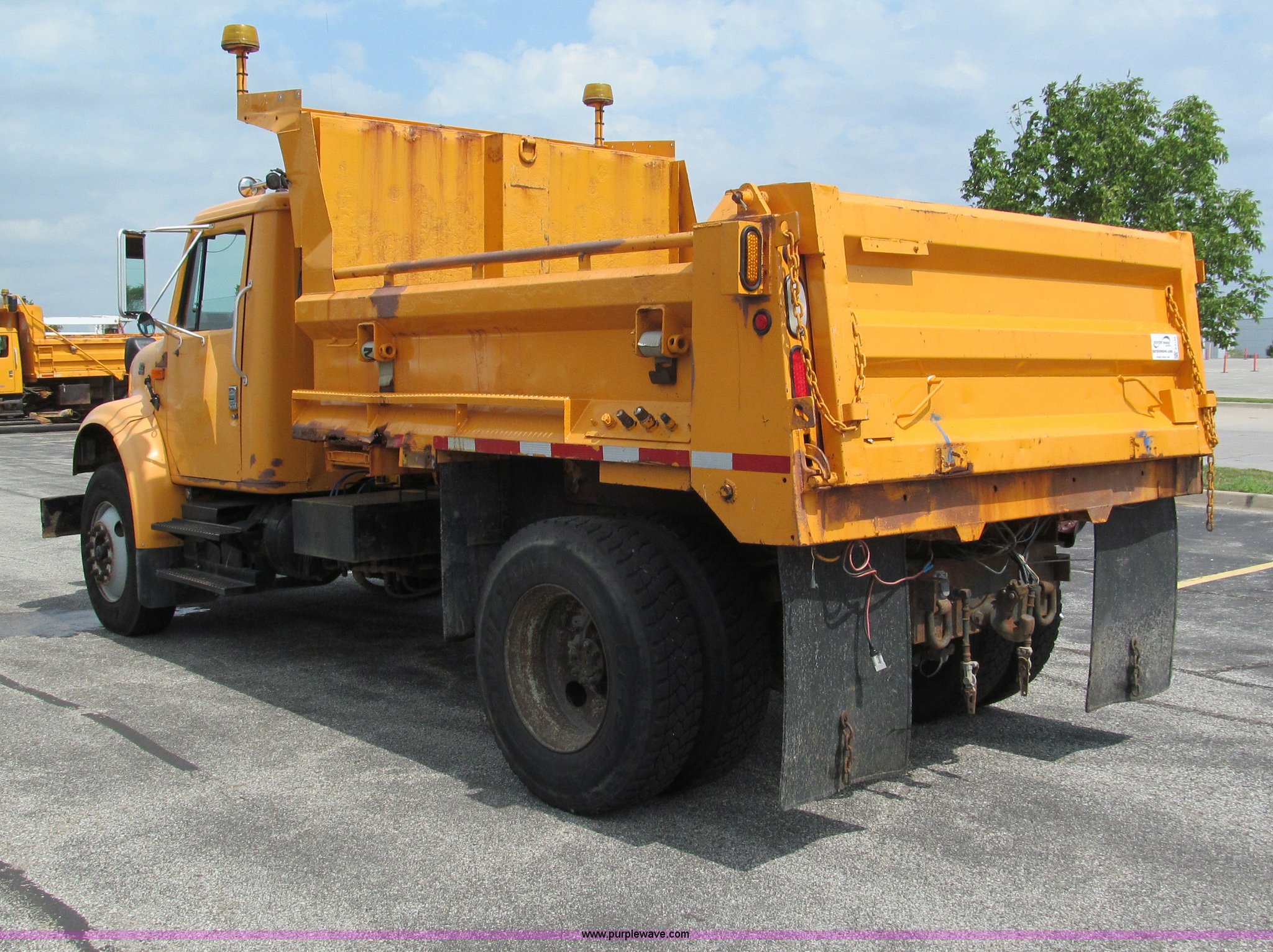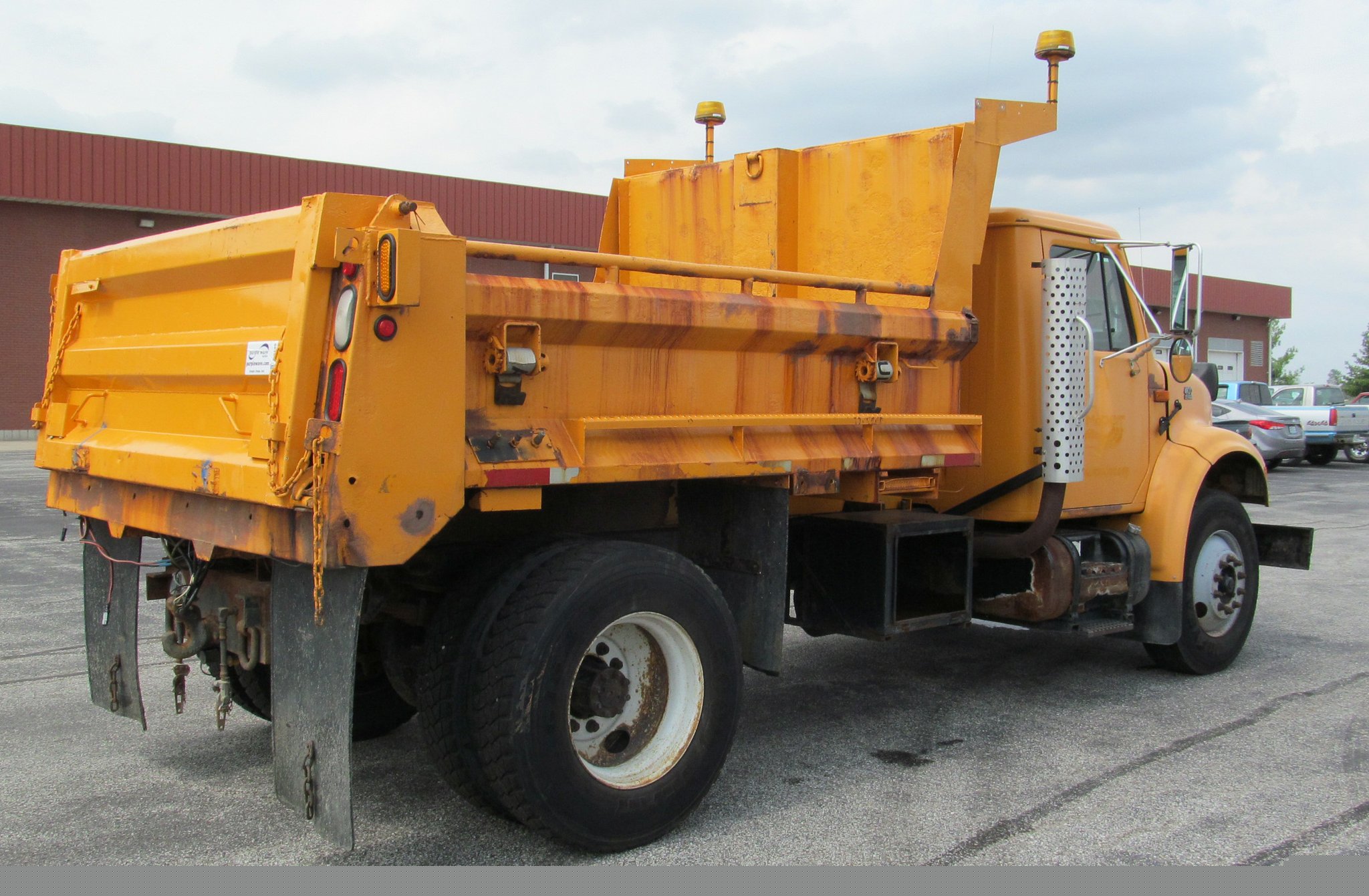Purple Wave is selling a used Construction Dump Truck in Missouri. This item is a 2001 International 4900 dump truck with the following: 134,671 miles on odometer, 10,926 hours on meter, International DT466E 7.6L L6 diesel engine, Automatic transmission, Heat, Cruise, AM/FM, Air suspension seat, Heated mirrors, In-cab plow controls, 10'L dump bed, Bumper, Trailer wiring, Toolboxes, Pintle hitch, 50 gallon fuel tank, Trailer air brake hookups, (2) sets of auxiliary hydraulics for plows, PTO, Front mount PTO, Mudflaps, (2) bed mounted yellow warning lights, Rear tow hooks, (2) front mounted flood lights, Spring suspension, Air brakes, 170" wheelbase, 11R22.5 tires, MoDOT ID 6408