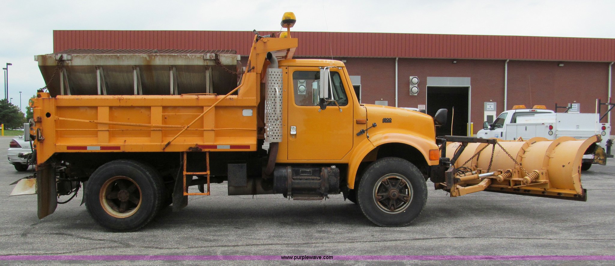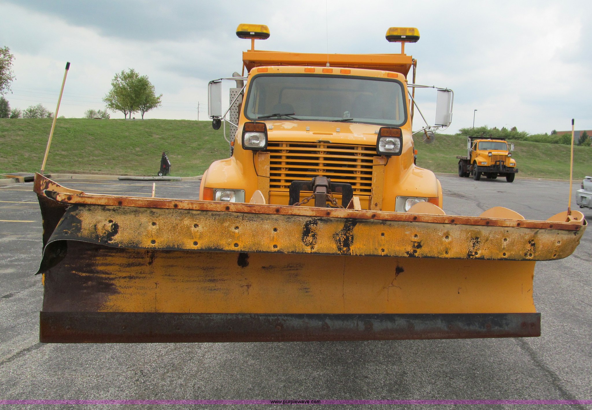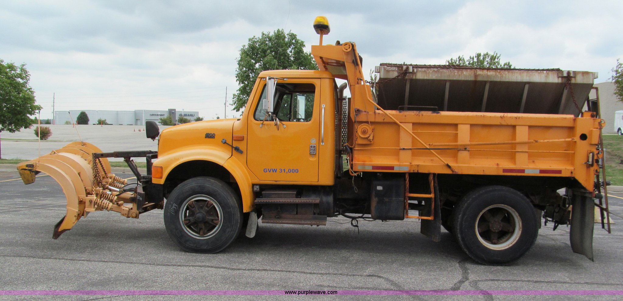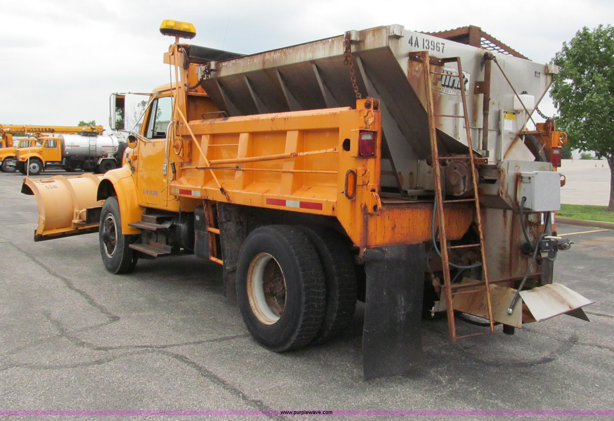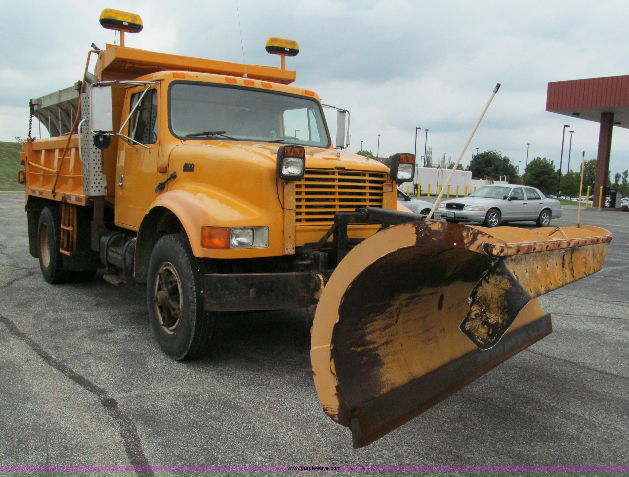 Purple Wave is selling a used Construction Dump Truck in Missouri. This item is a 1996 International 4900 dump truck with the following: 179,296 miles on odometer, International DT466 7.6L L6 diesel engine, Automatic transmission, Heat, Cruise, AM/FM, Air suspension seats, Heated mirrors, Galion 402E 10' dump bed, 5.4 to 8.4 cu. yd. capacity, Air end gate, Rollover tarp, Serial 965426, Flink 9' spreader box, Model 8609SS, Unit# 4A13967, Serial 5973, Stainless steel, Poly spreader fins, 11'W snow plow, Trailer wiring, Pintle hitch, 50 gallon fuel tank, Single rear exhaust stack, PTO, Front mount PTO, Spring suspension, Air brakes, (2) yellow flashing lights, (2) front mounted flood lights, Rear hydraulics, 152" wheelbase, 11R22.5 tires, Unattached tailgate pictured is included, MoDOT ID 5510