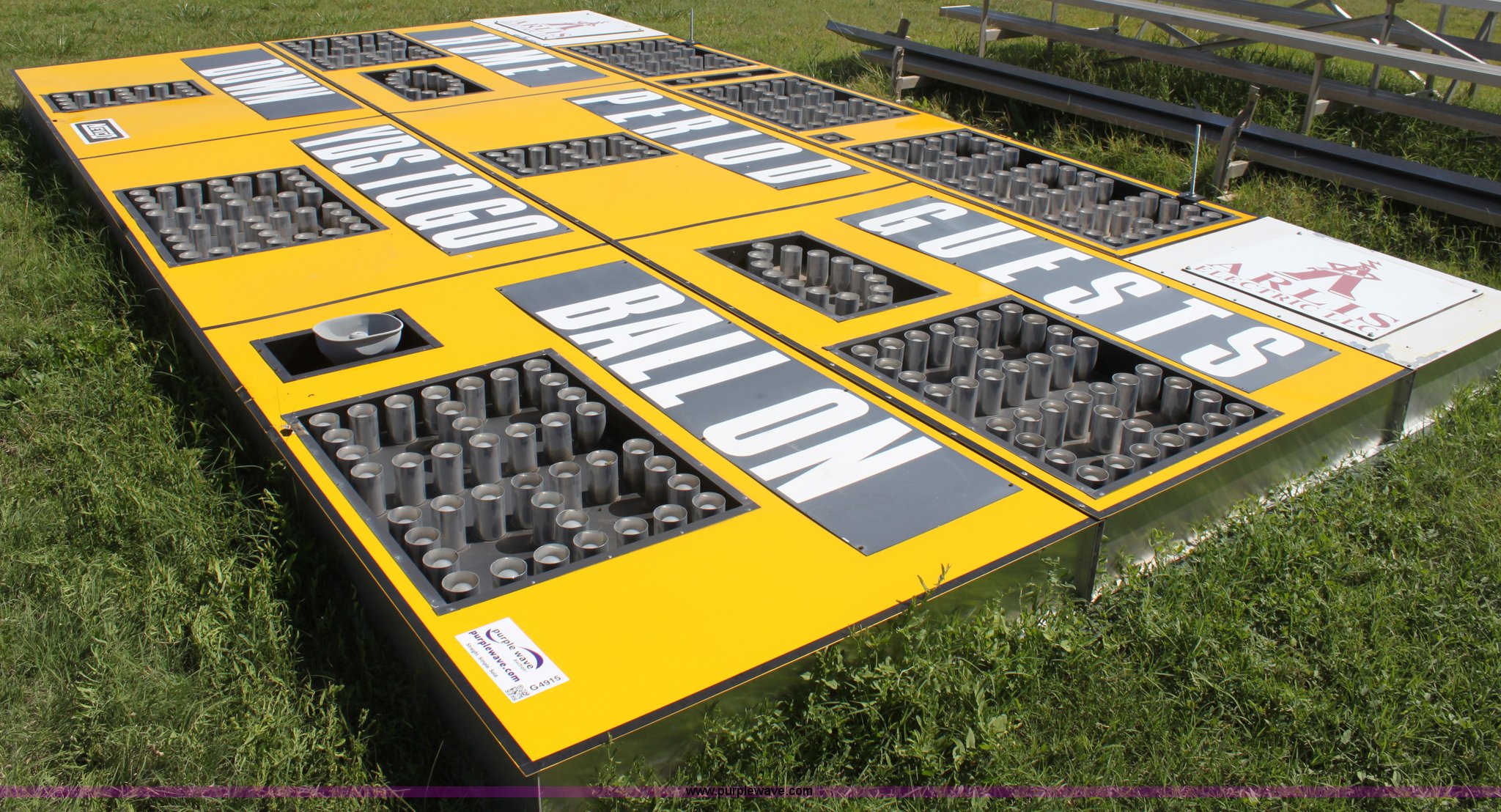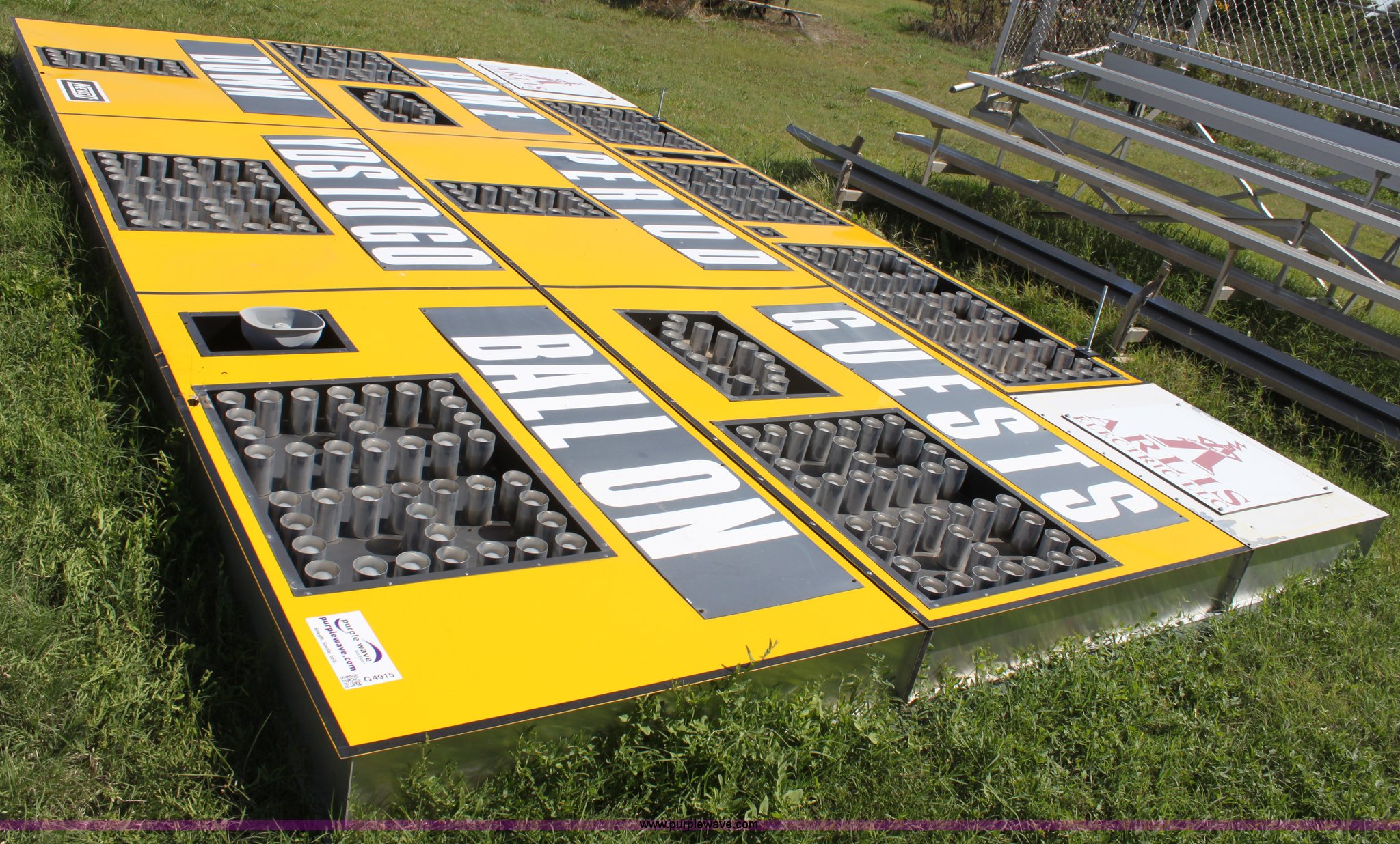 Purple Wave is selling a used Sporting Goods in Kansas. This item is a Nevco scoreboard with the following: 18'L x 124.75"H, Down, Yards To Go, Ball On, and Period lights, Aluminum construction, No controller