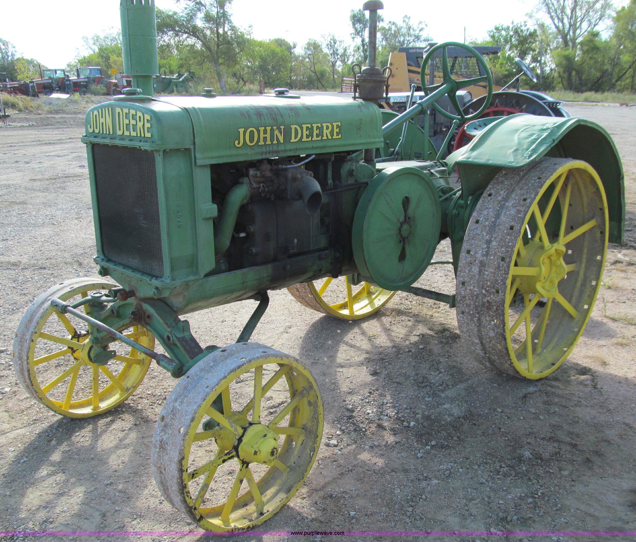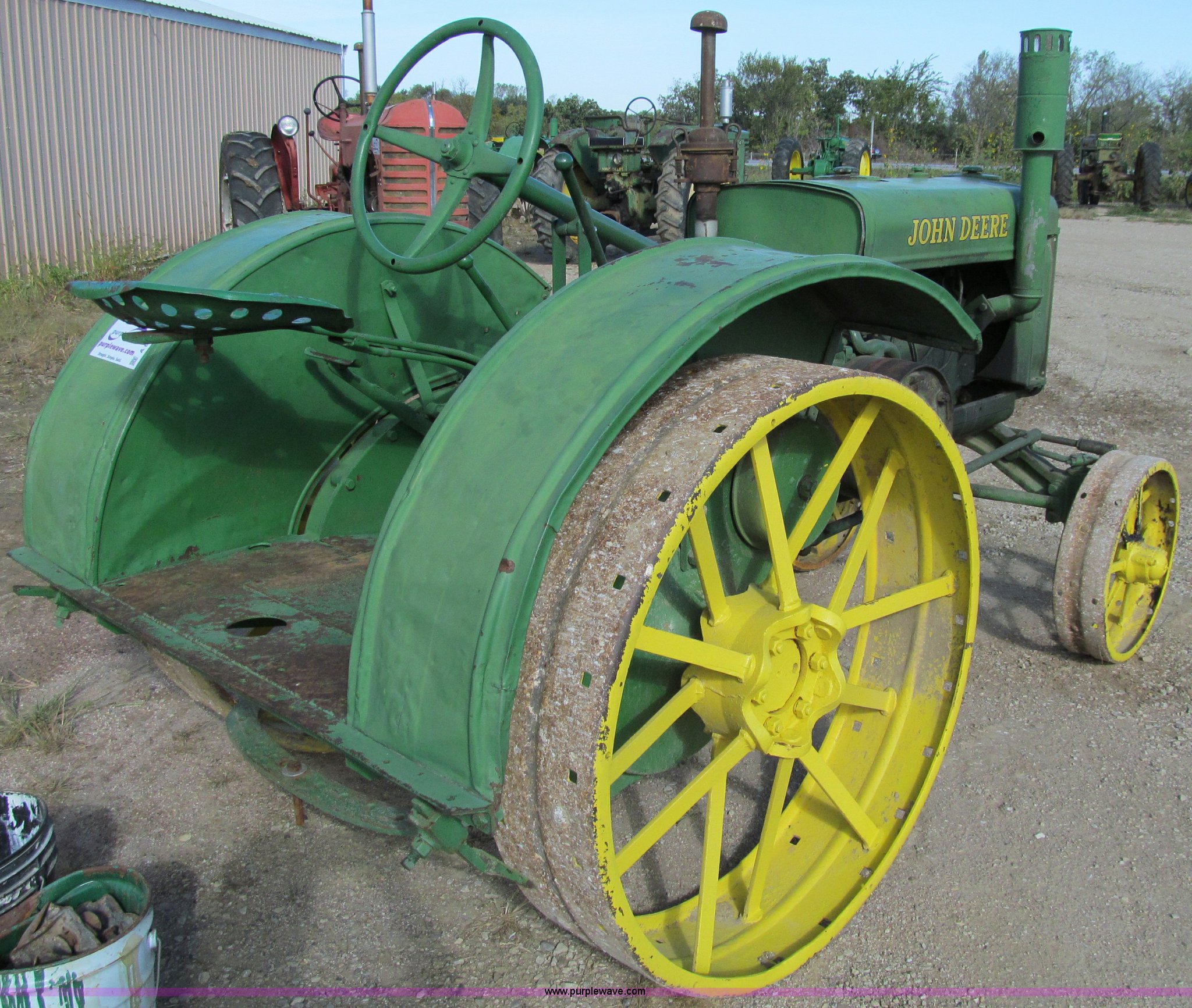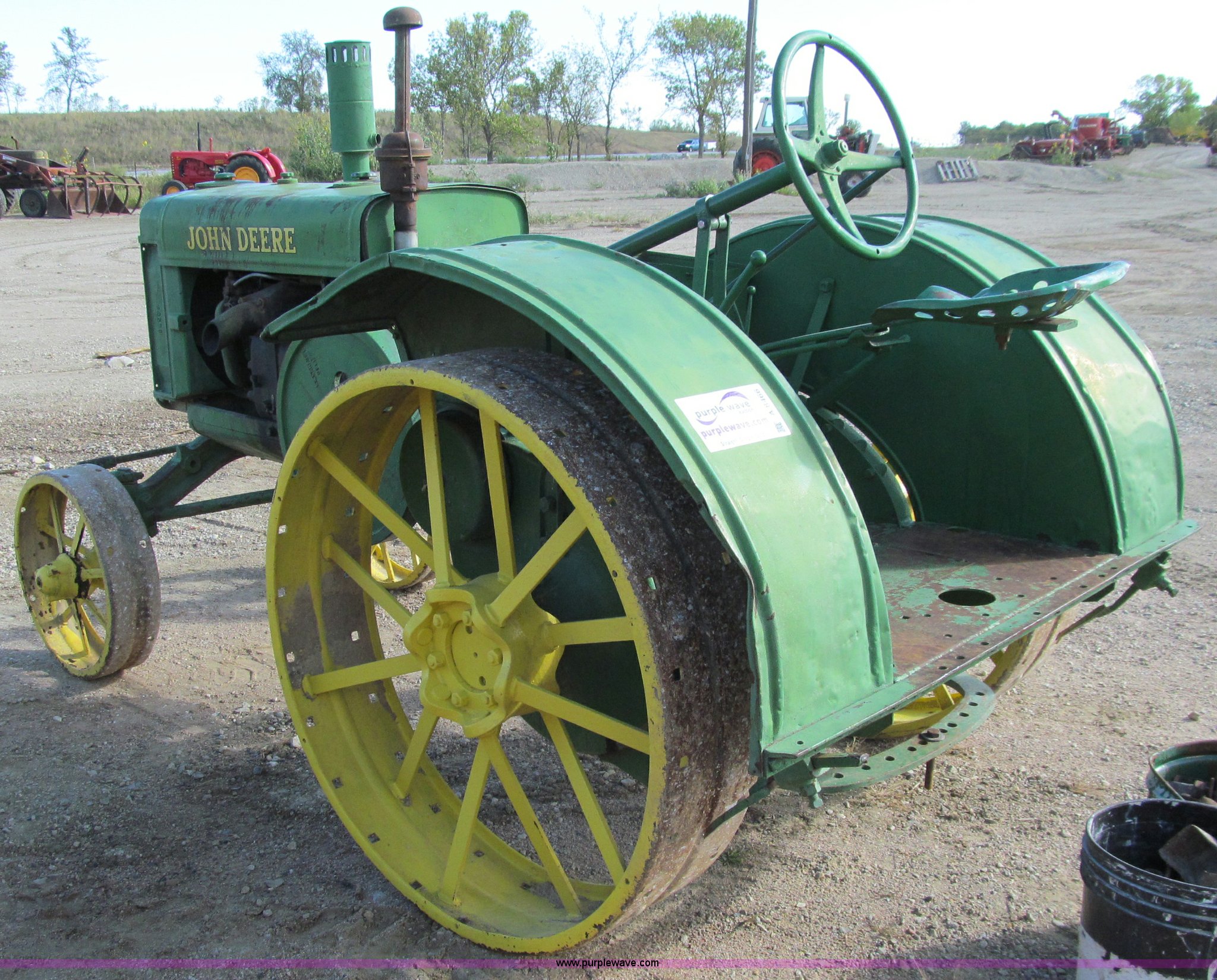 Purple Wave is selling a used Tractor in Iowa. This item is a 1929 John Deere GP tractor with the following: John Deere two cylinder gas engine, Manual transmission, 3F-1R gears, Spring seat, Wheel lugs included, unattached, Serial 208332