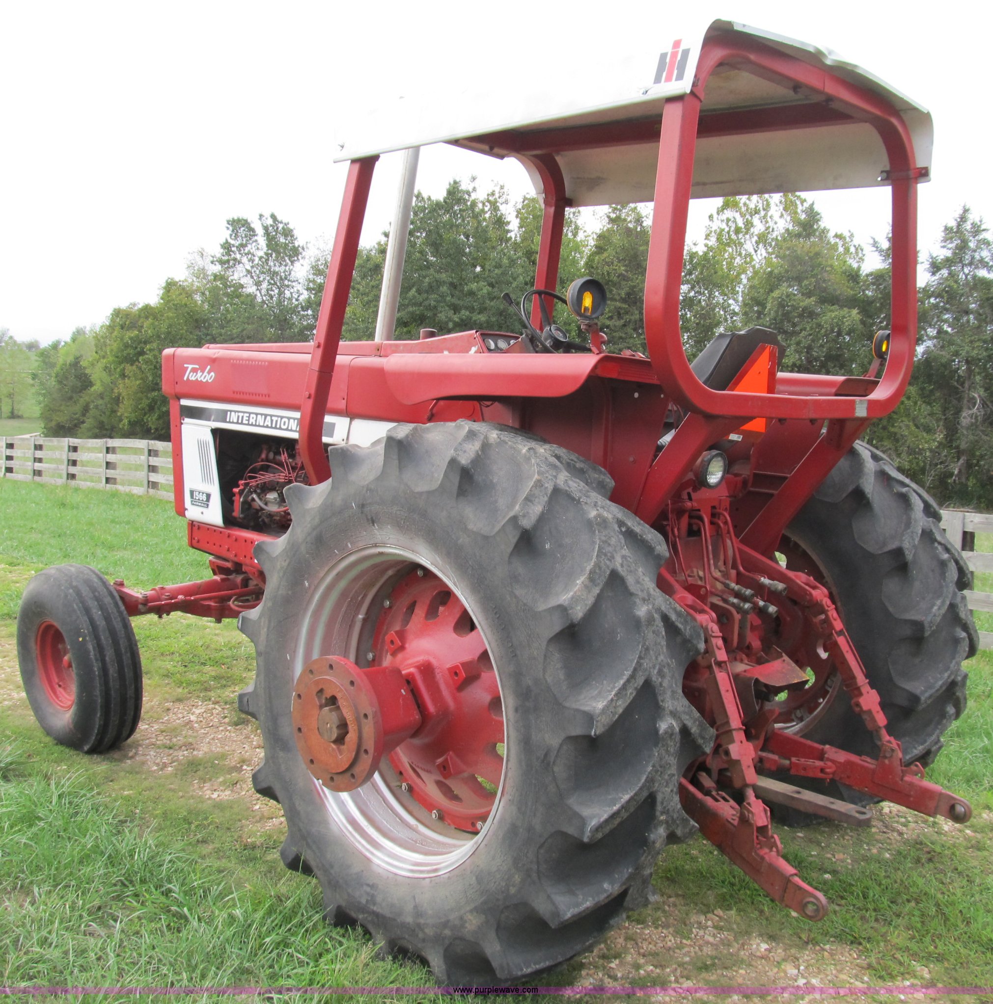 Purple Wave is selling a used Tractor in Missouri. This item is a 1975 International Farmall 1566 tractor with the following: Hours unknown, International six cylinder diesel engine, 156 HP, Manual transmission, 6F-2R gears, Canopy, Spring seat, Three point, Draw bar, Auxiliary outlet, 1000 PTO, (2) rear hydraulic remote sets, Rear work light, 9.00-20 front tires, 20.8-38 rear tires, Recently replaced alternator, batteries, and cables, Rear hubs for dual wheels not included, Piston in cylinder #1 is bad, Tractor runs and drives, Serial 2650125U011462