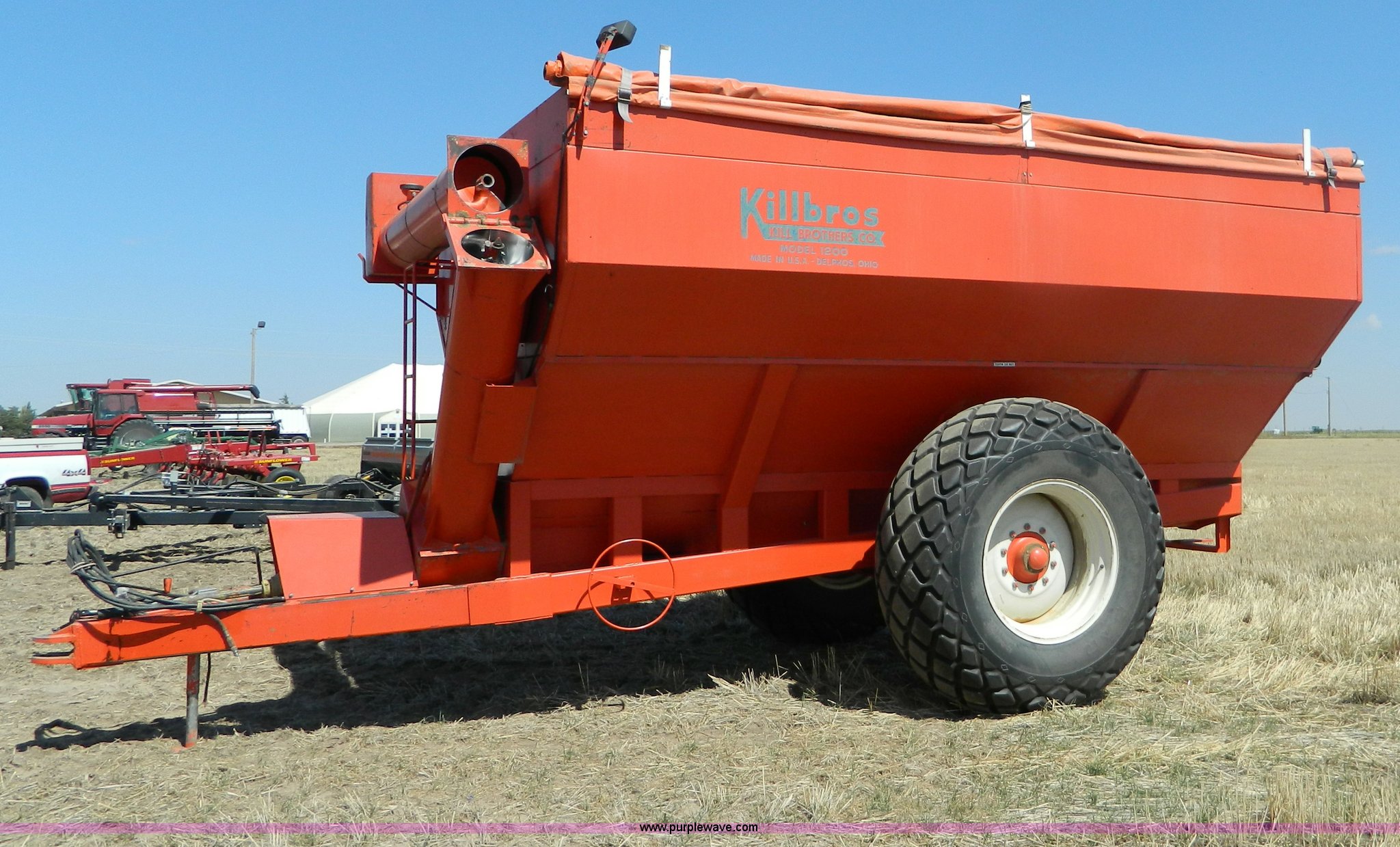 Purple Wave is selling a used Grain Cart or Gravity Wagon in Kansas. This item is a Killbros 600 bushel grain cart with the following: 12" unloading auger, Roll over tarp, 1000 PTO, 24.5-32 tires, Stored inside