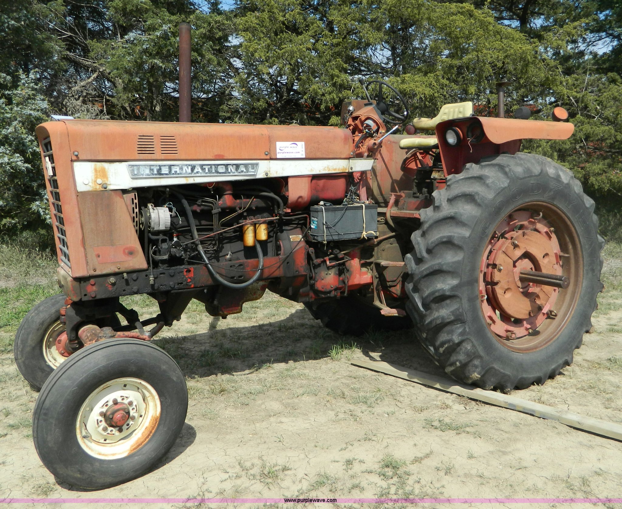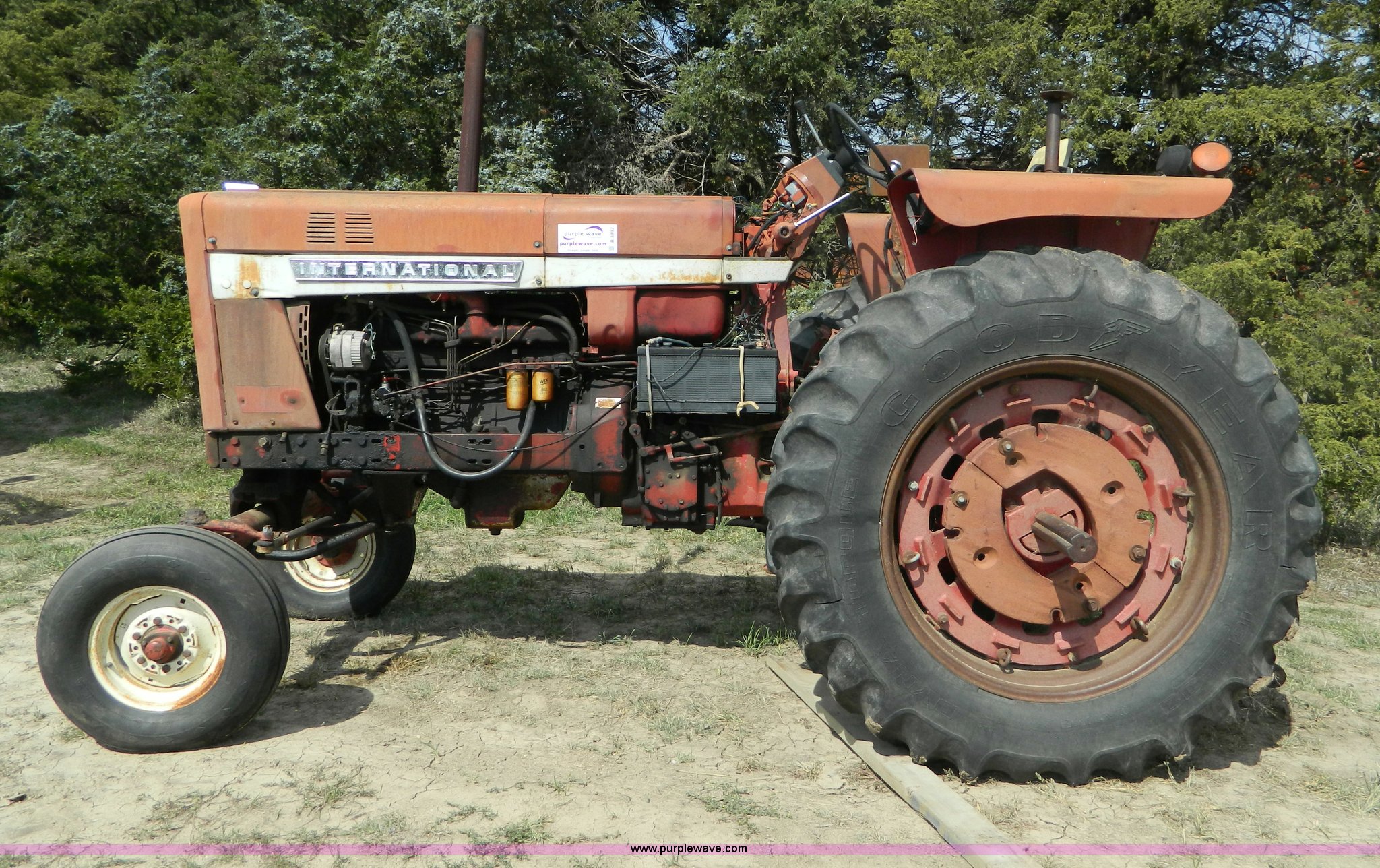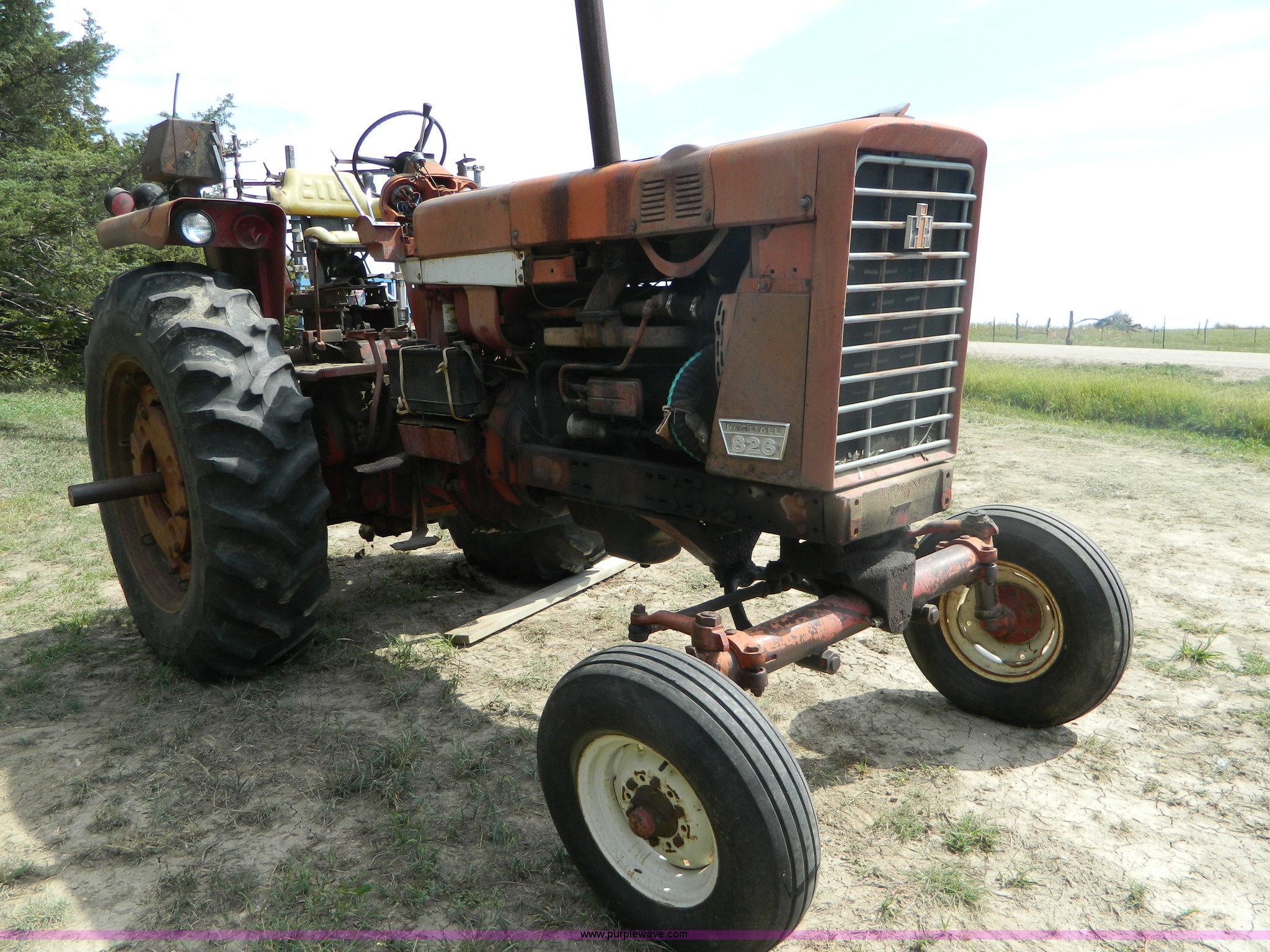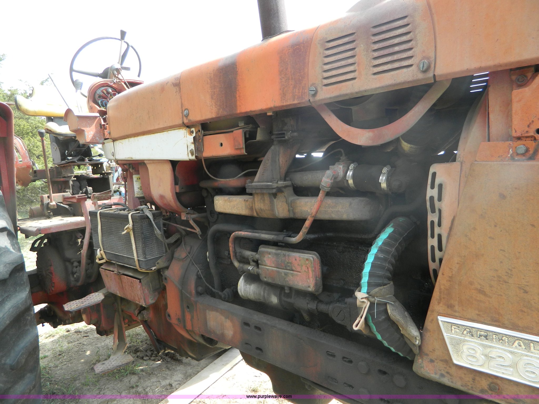 Purple Wave is selling a used Tractor in Kansas. This item is a 1970 International Farmall 826 tractor with the following: 6,535 hours on meter, Six cylinder diesel engine, Hydrostatic transmission, 16F-8R gears, Hi-Lo shifting issues, Spring seat, Three point, Draw bar, 540/1000 PTO, (2) rear hydraulic remotes, 8.5L14 front tires, 16.9-38 rear tires, Oil leaks, Cosmetic damage, Hood cover missing, Hi-Lo shifting issues, Serial 2510148U012689