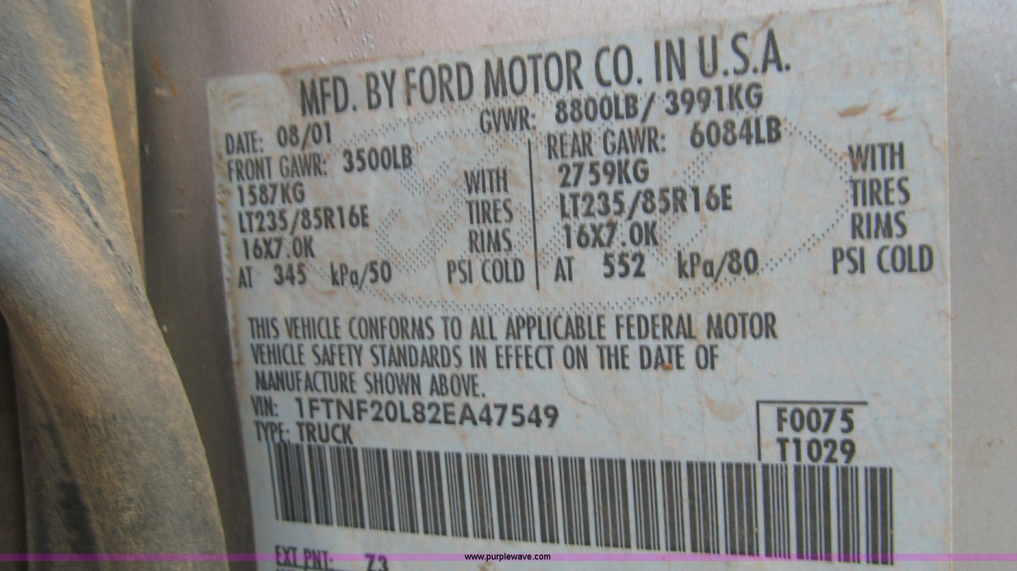 Purple Wave is selling a used Passenger Vehicle in Texas. This item is a 2002 Ford F250 pickup truck with the following: 199,659 miles on odometer, Triton 5.4L V8 EFI gas engine, Automatic transmission, AC and heat, Tilt, Cruise, AM/FM/cassette, Manual windows and locks, Cloth interior, Long bed, 235/85R16 tires, Rear end needs repairs