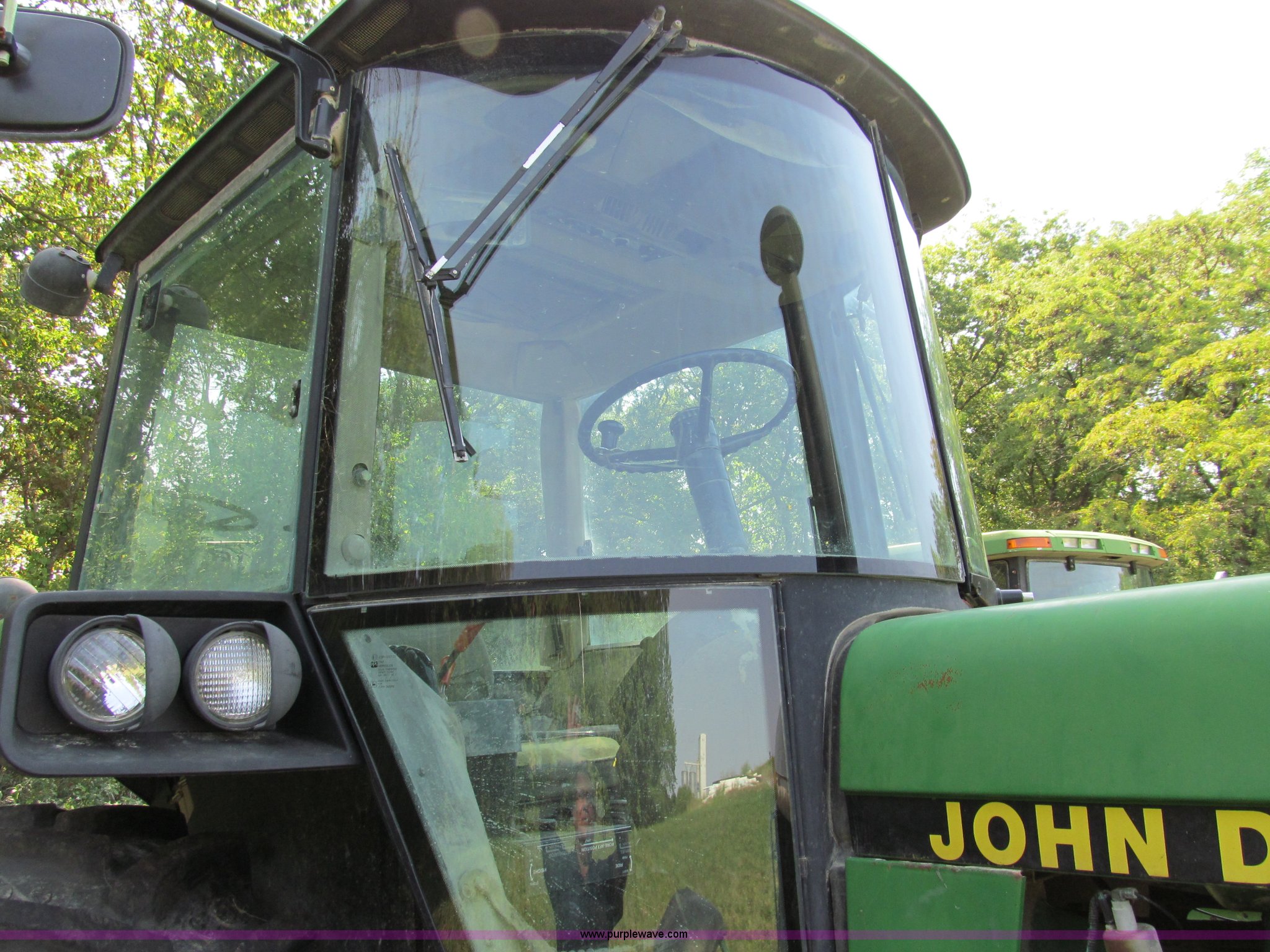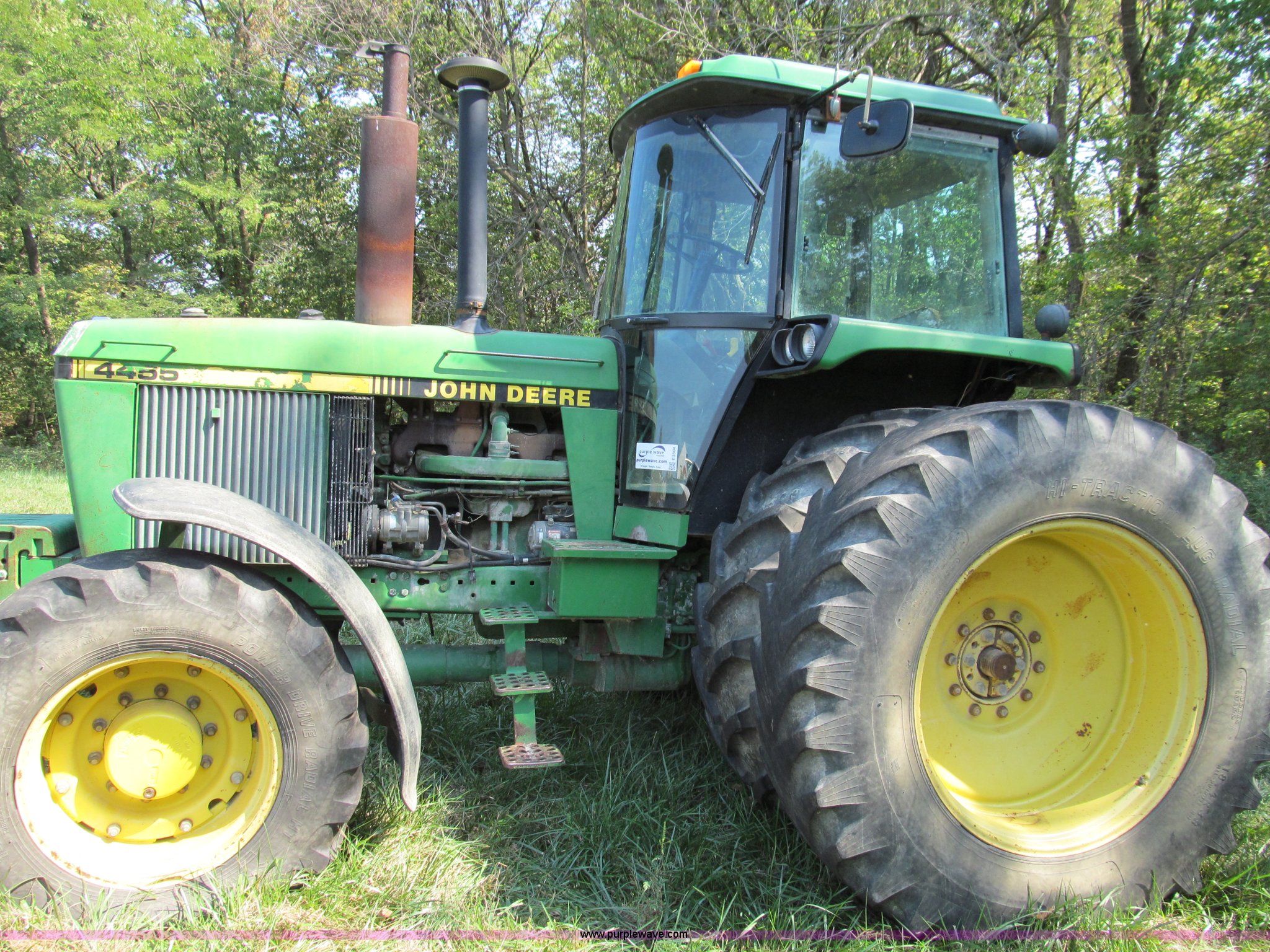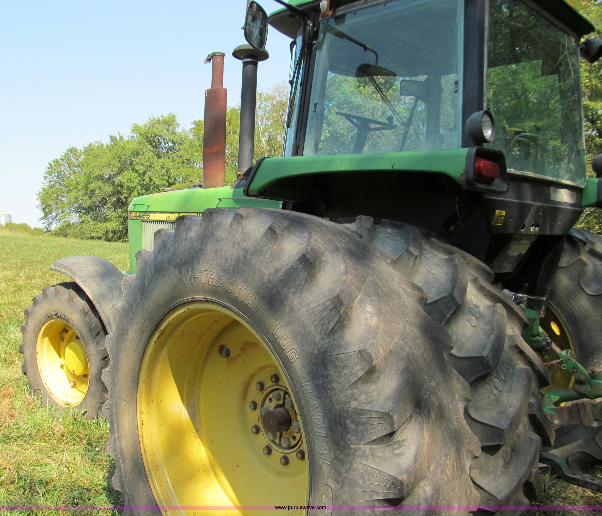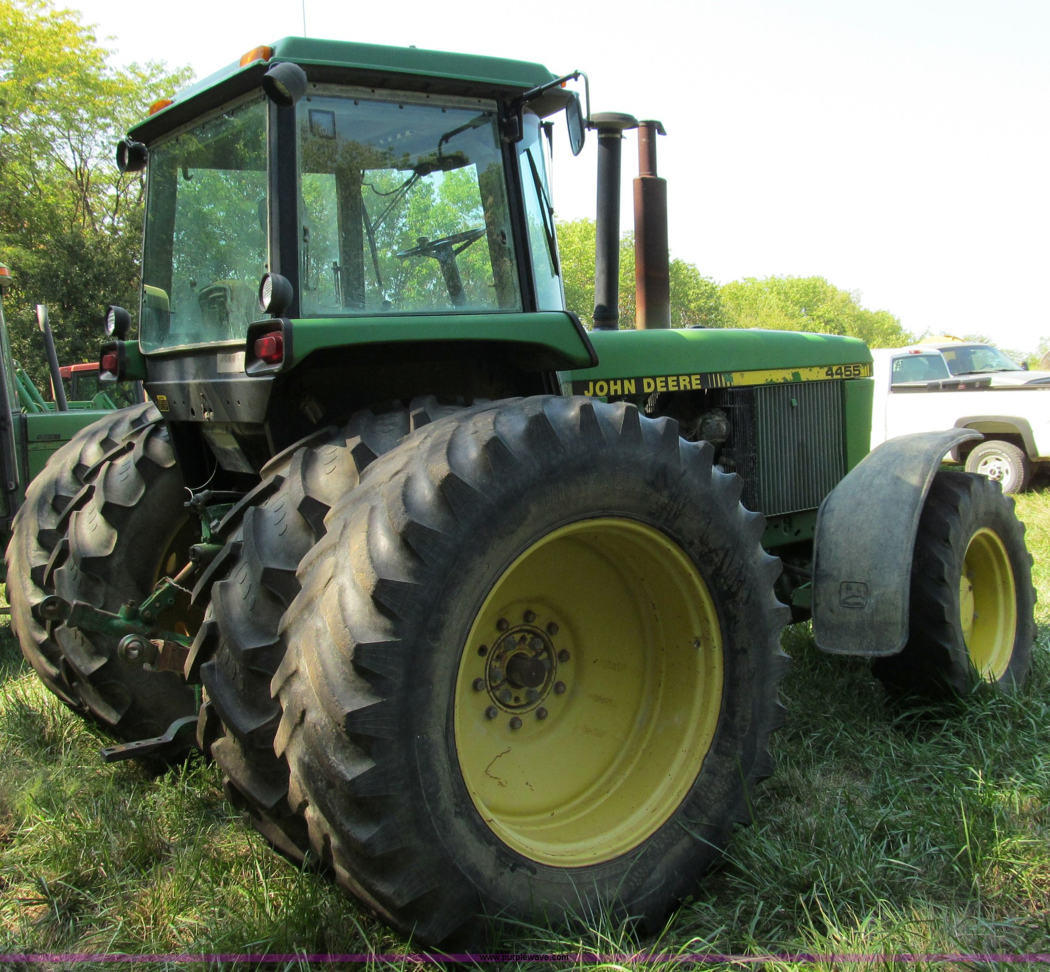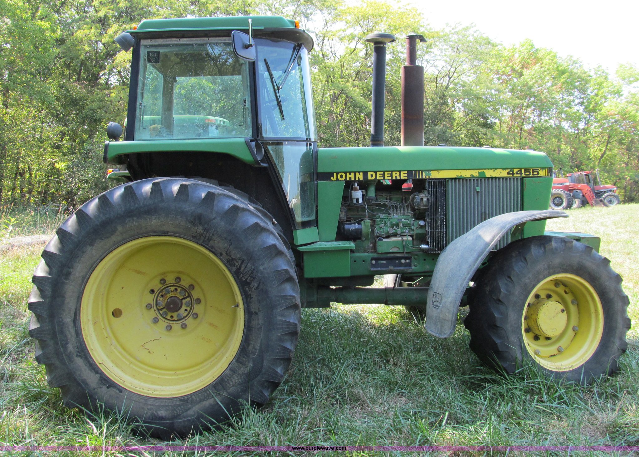 Purple Wave is selling a used Tractor in Missouri. This item is a 1989 John Deere 4455 MFWD tractor with the following: 7,985 hours on meter, John Deere six cylinder diesel engine, 150 HP, Model 6076TRW04, Serial RG6076T168501, Powershift transmission, 15F-4R gears, AC and heat, AM/FM, Air seat, Tilt steering wheel, Front fenders, Three point, Draw bar, Auxiliary outlet, 540/1000 PTO, (2) rear hydraulic remote sets, 38 gallon fuel tank, (14) suitcase weights, 14.9R16 front tires, 18.4R38 rear tires, duals, Serial RW4455P020467, Unit# 10