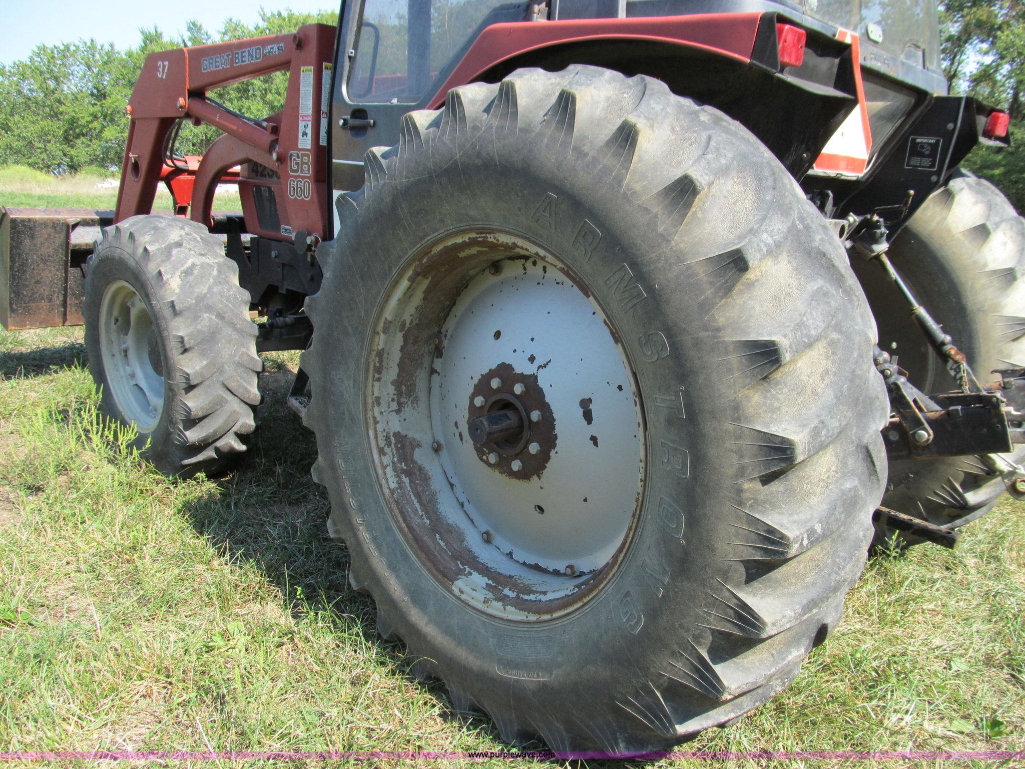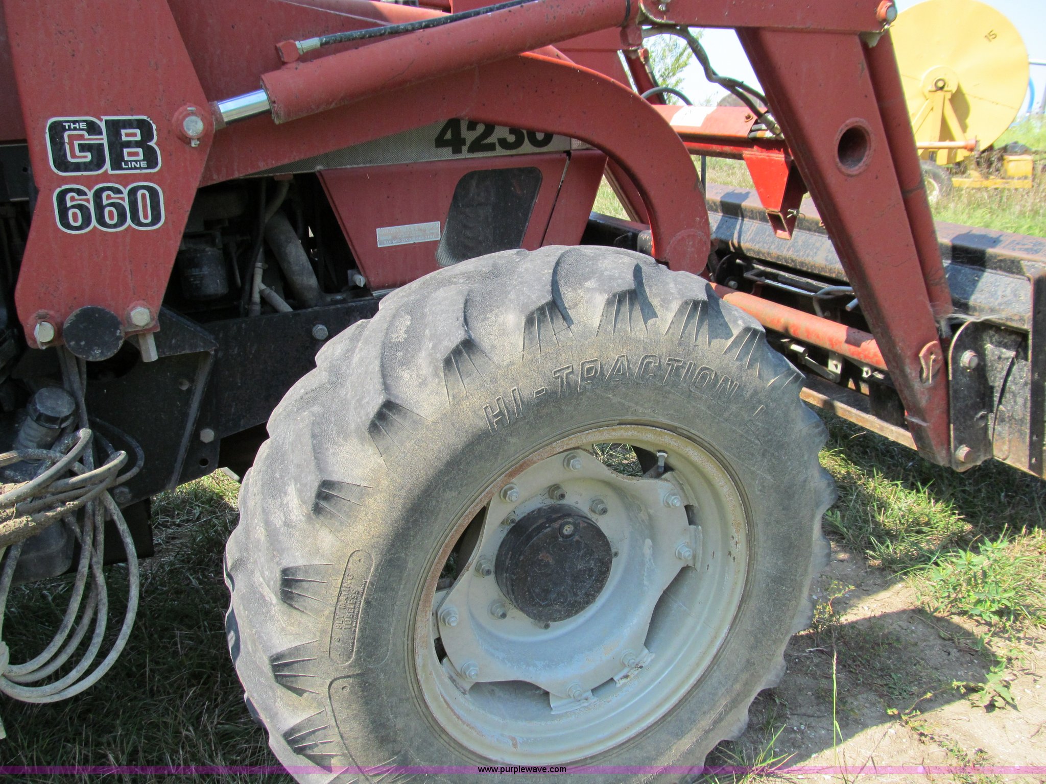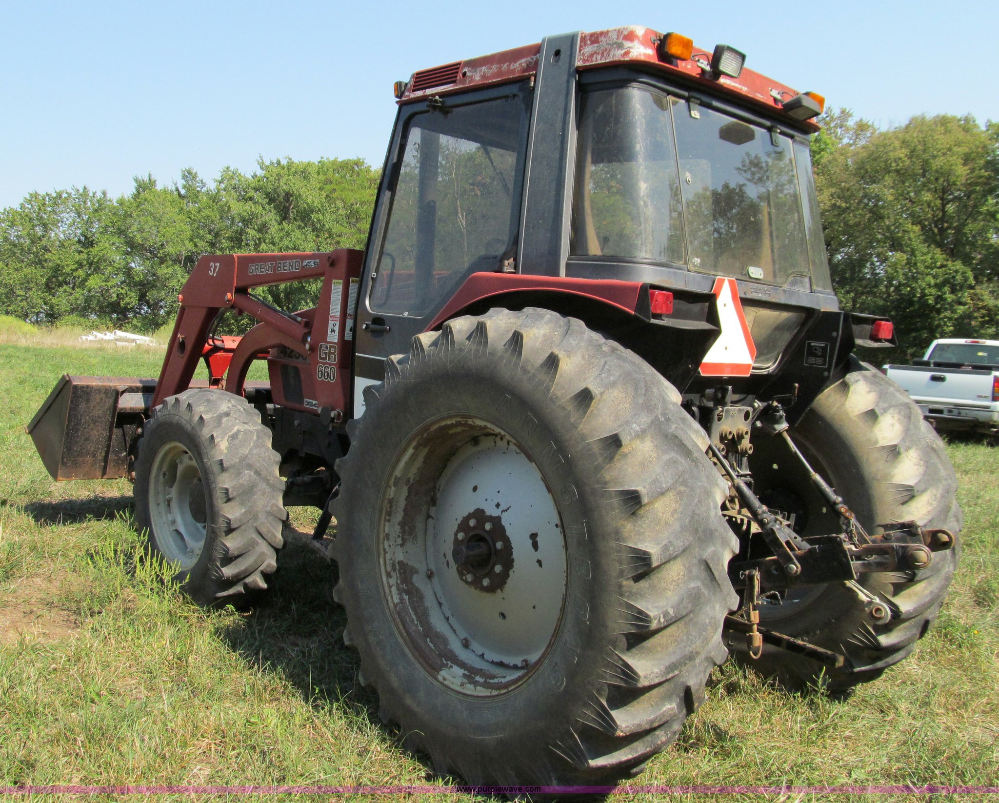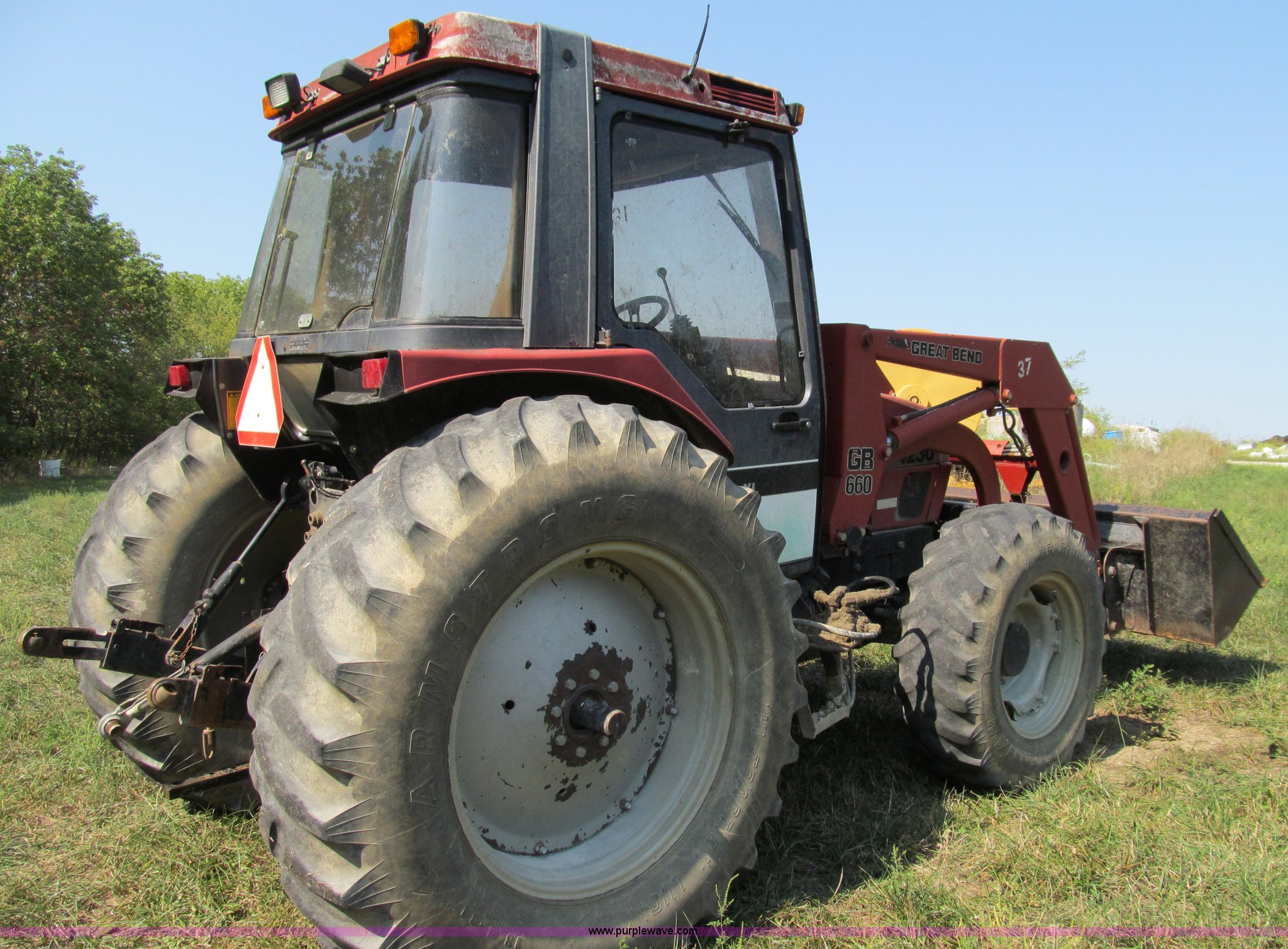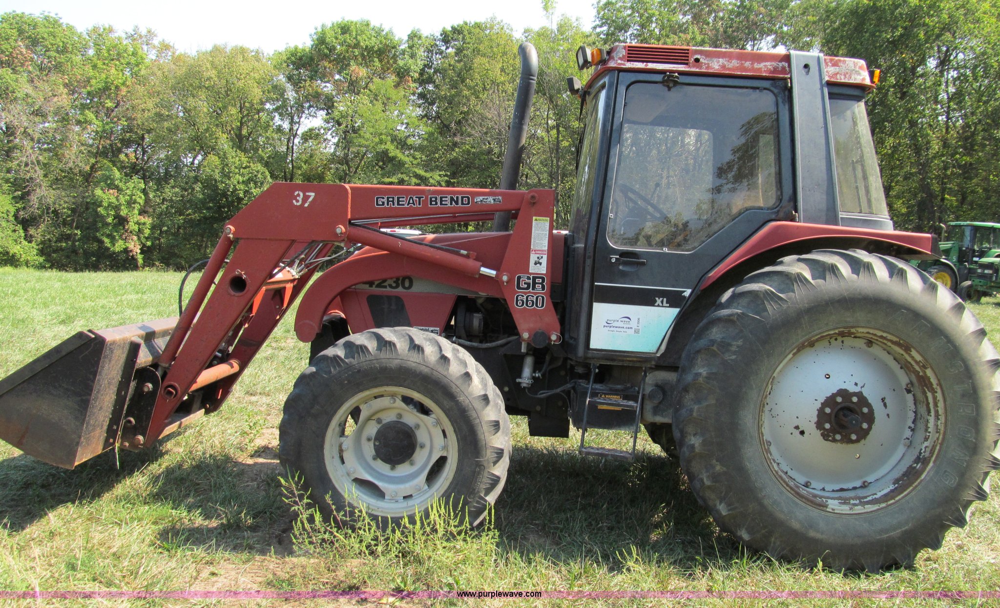 Purple Wave is selling a used Tractor in Missouri. This item is a 1996 Case IH 4230 MFWD tractor with the following: Four cylinder diesel engine, 84 HP, Serial 295920, Manual transmission, Modified shift forward and reverse, AC and heat, Spring seat, Great Bend 6600 loader, 84"W, Joystick control, Unit# 37, Three point, Draw bar, 540/1000 PTO, (2) sets of rear hydraulic remotes, 13.6-24 front tires, 18.4-34 rear tires, Missing stereo, Serial 4230AXLJJE0918902, Unit# 18