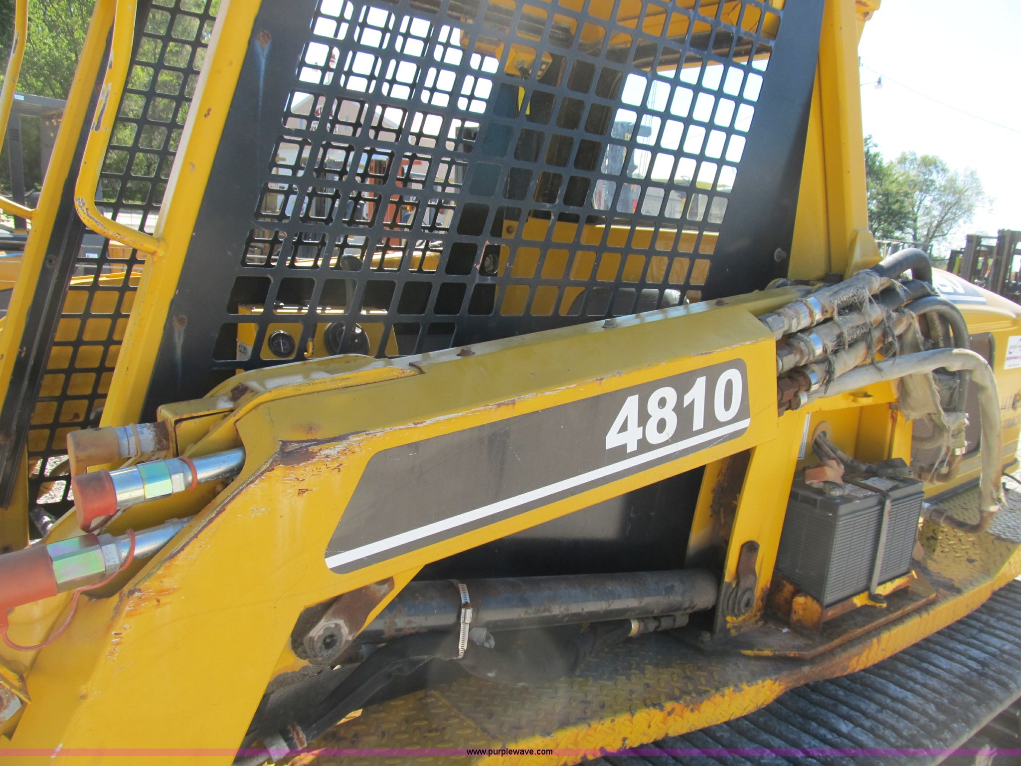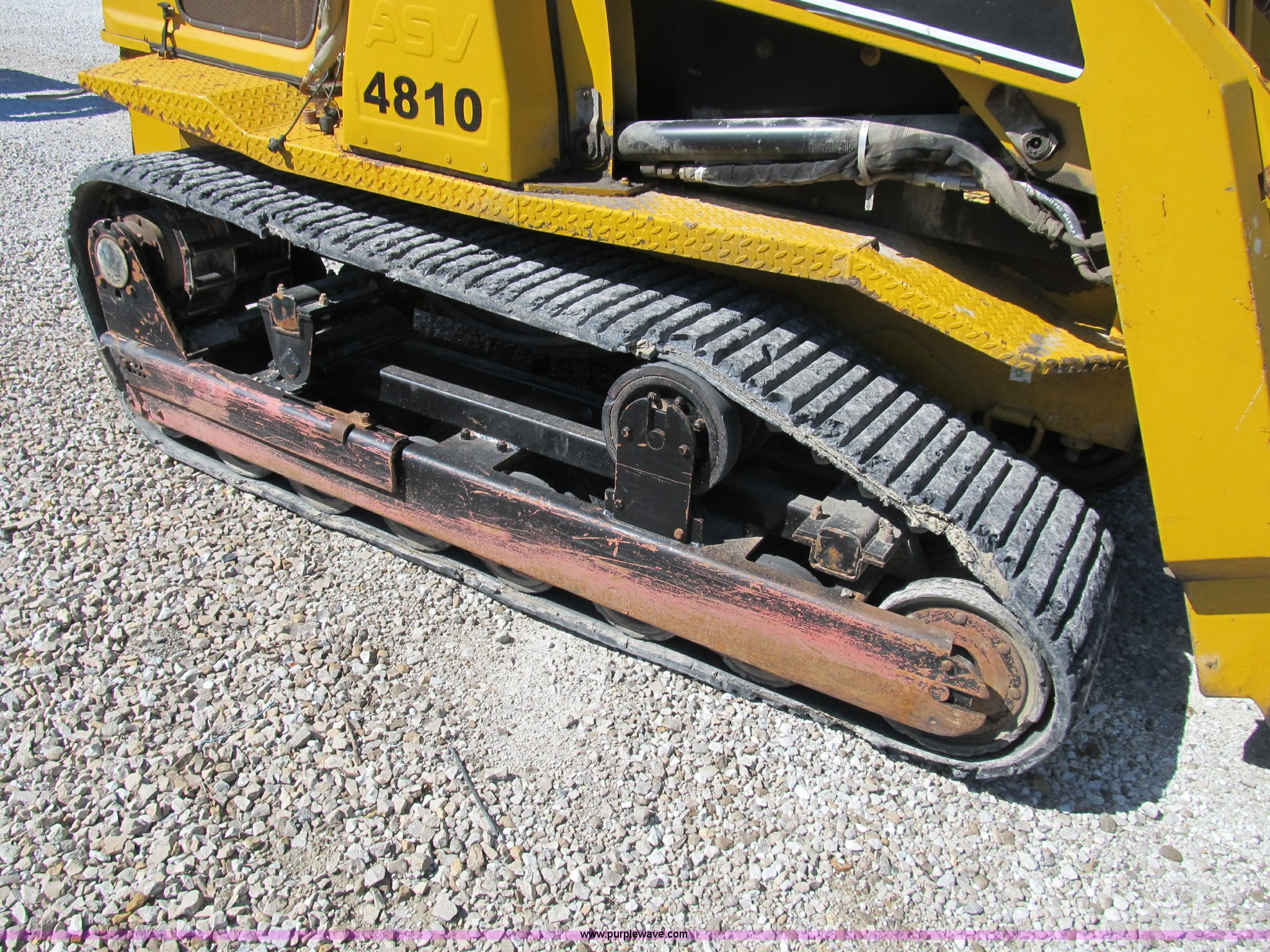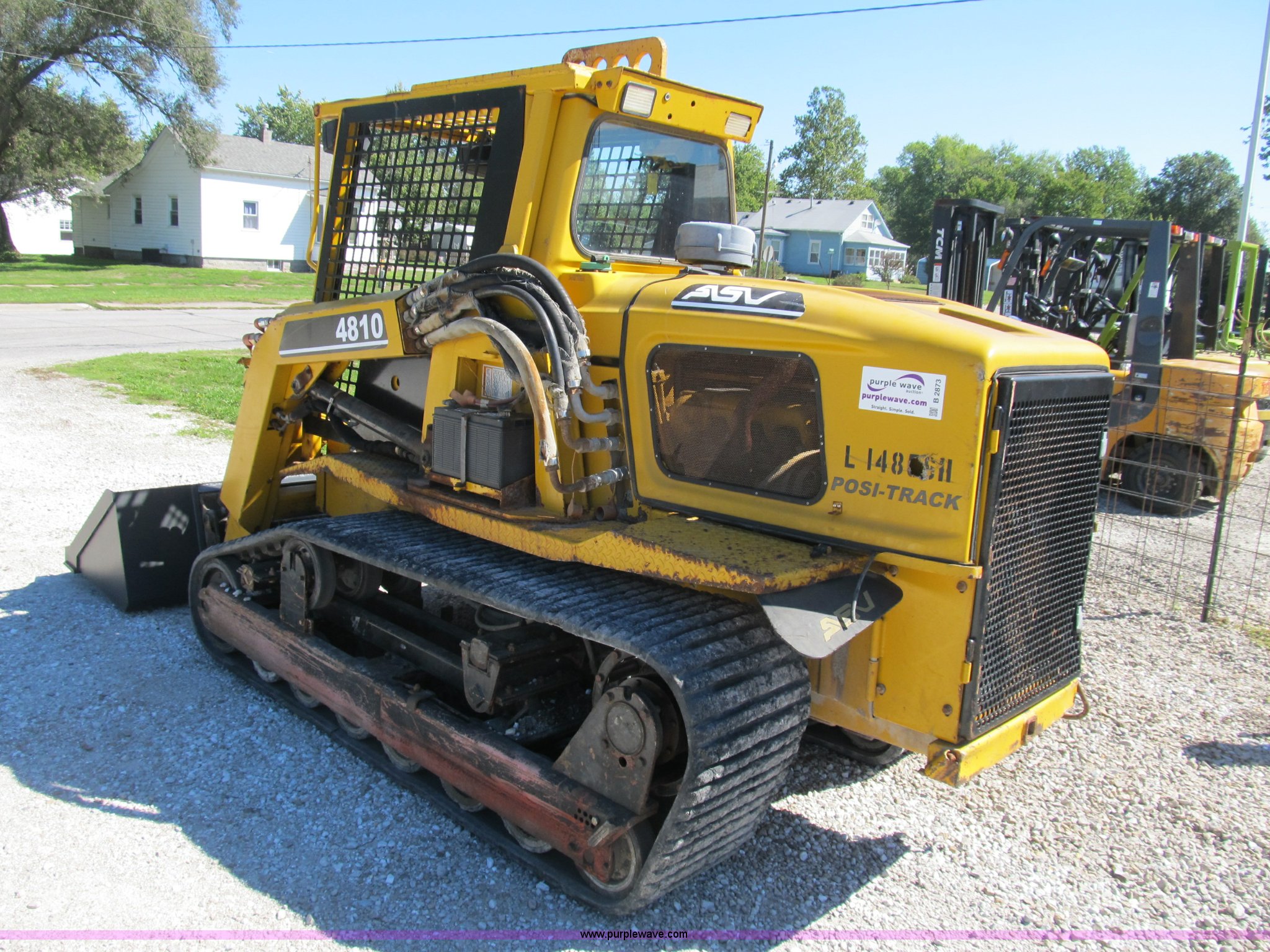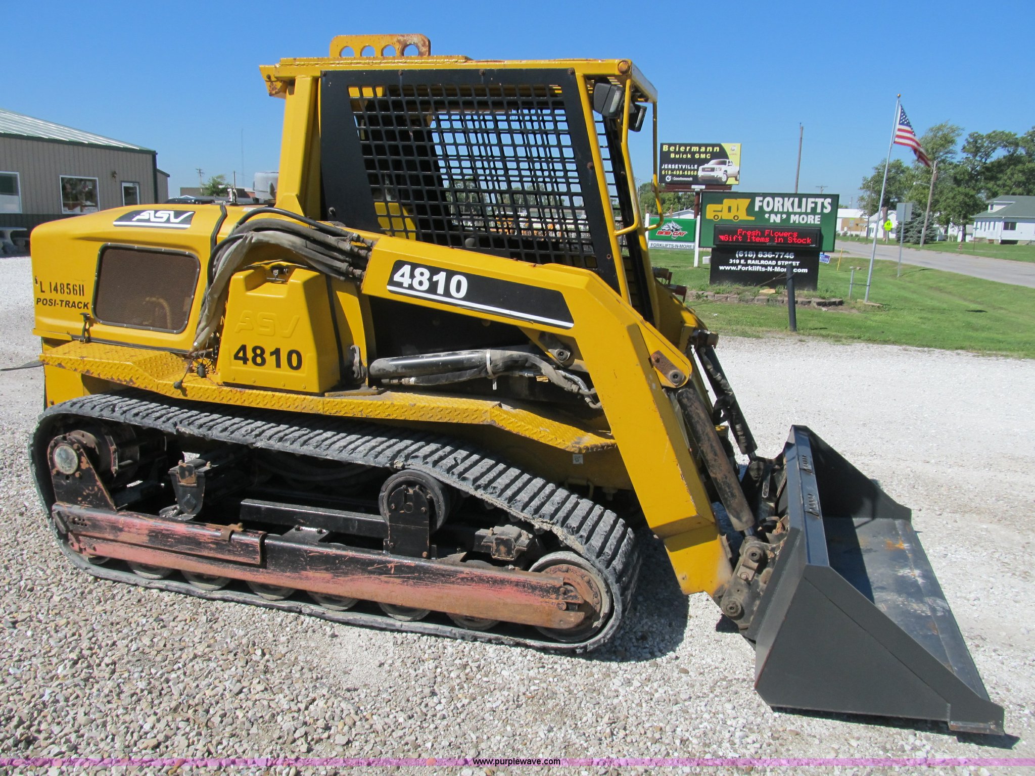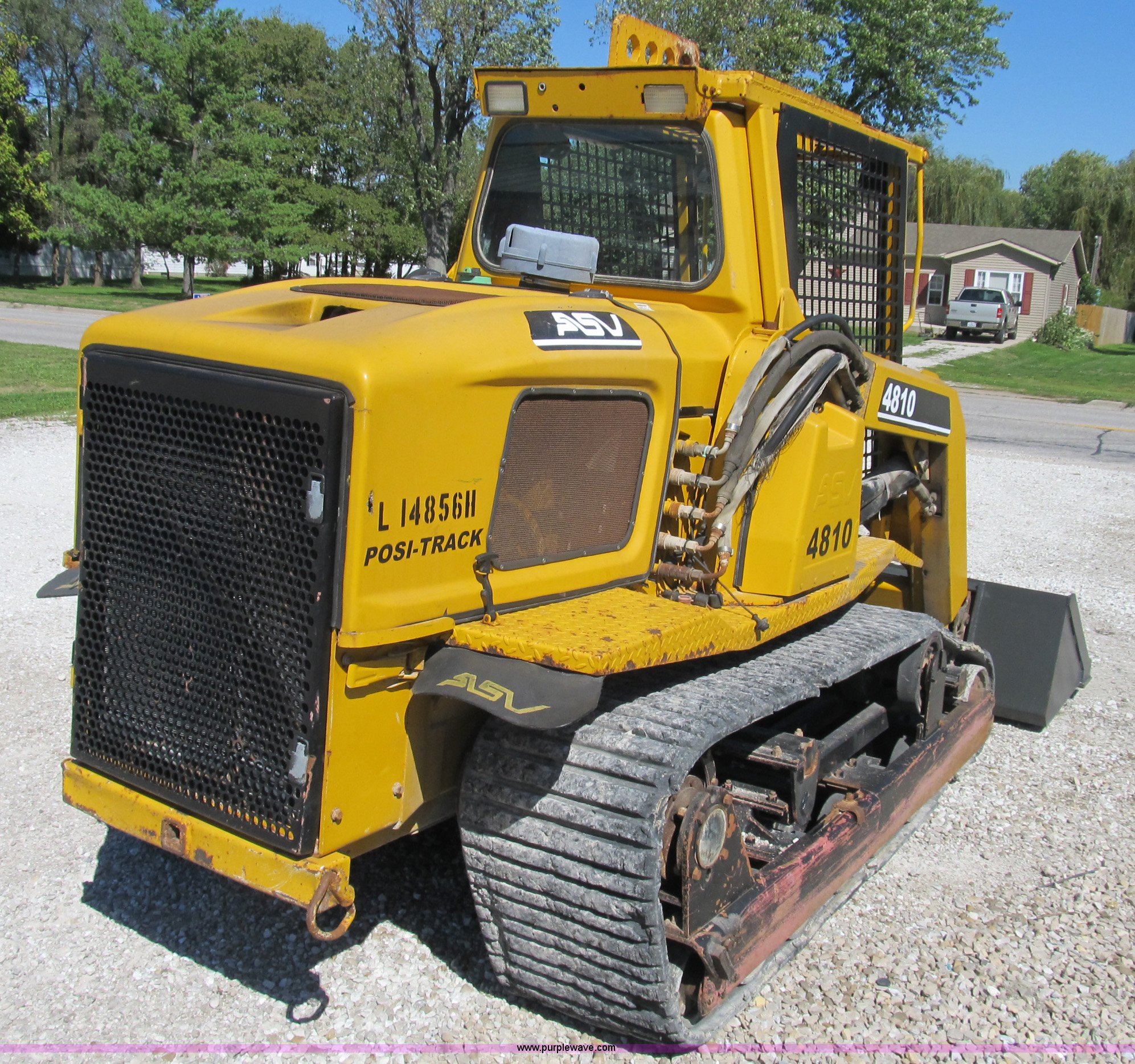 Purple Wave is selling a used Tracked Skid Steer Loader in Illinois. This item is a ASV 4810 Posi-Track track skid steer with the following: 220 hours on meter, Caterpillar 3054T four cylinder turbo diesel engine, 105 HP, Joystick controls, OROPS, (5) front auxiliary hydraulics, Loflin 72" low profile smooth bucket, Model 72LFLP, Serial 0412093, Universal quick attach, Receiver hitch, 18"W rubber tracks, Recently replaced drive components on left side, Planetary gear, bearings, and more, Right side tracks are torn, Serial ANC00408