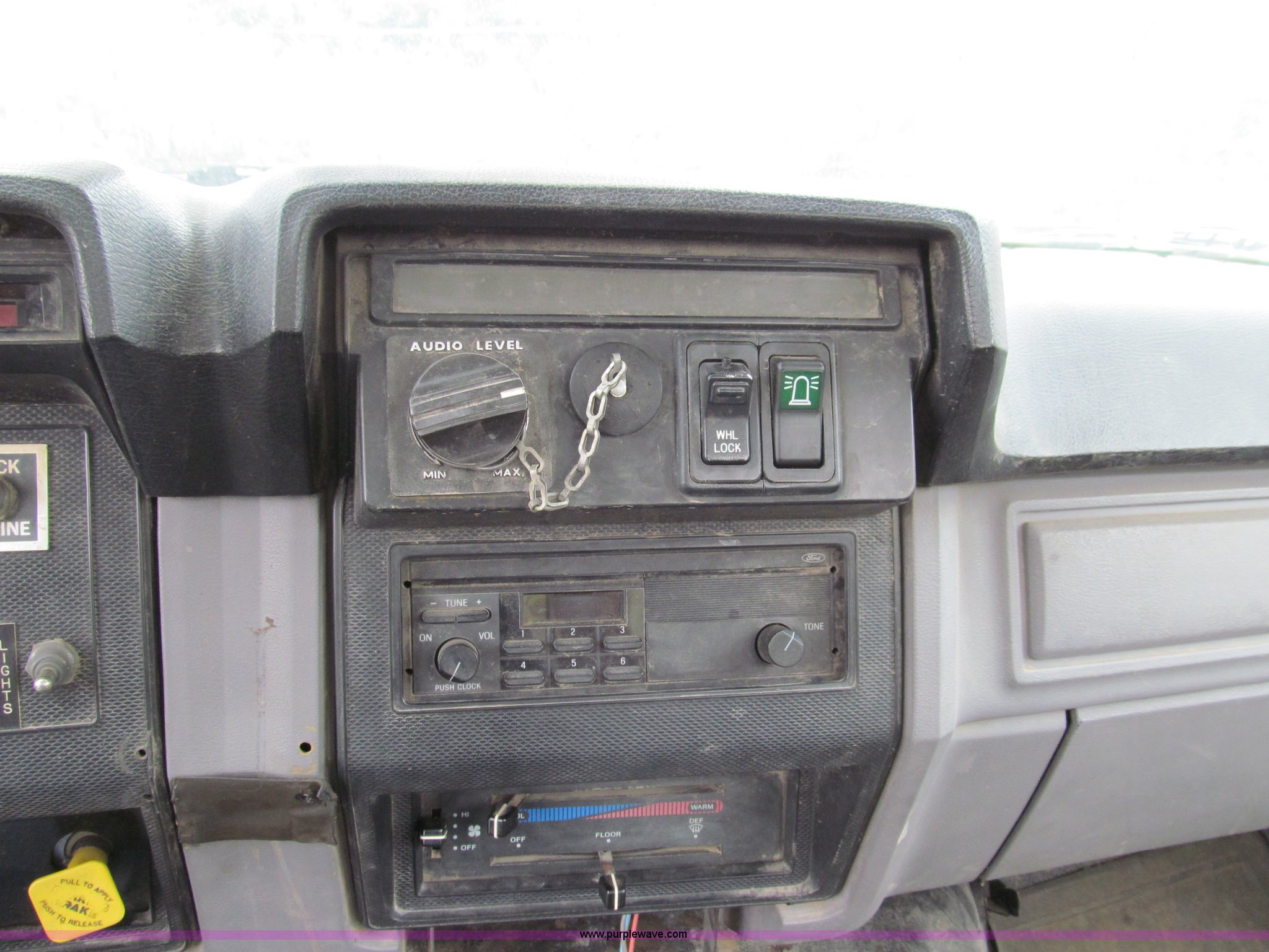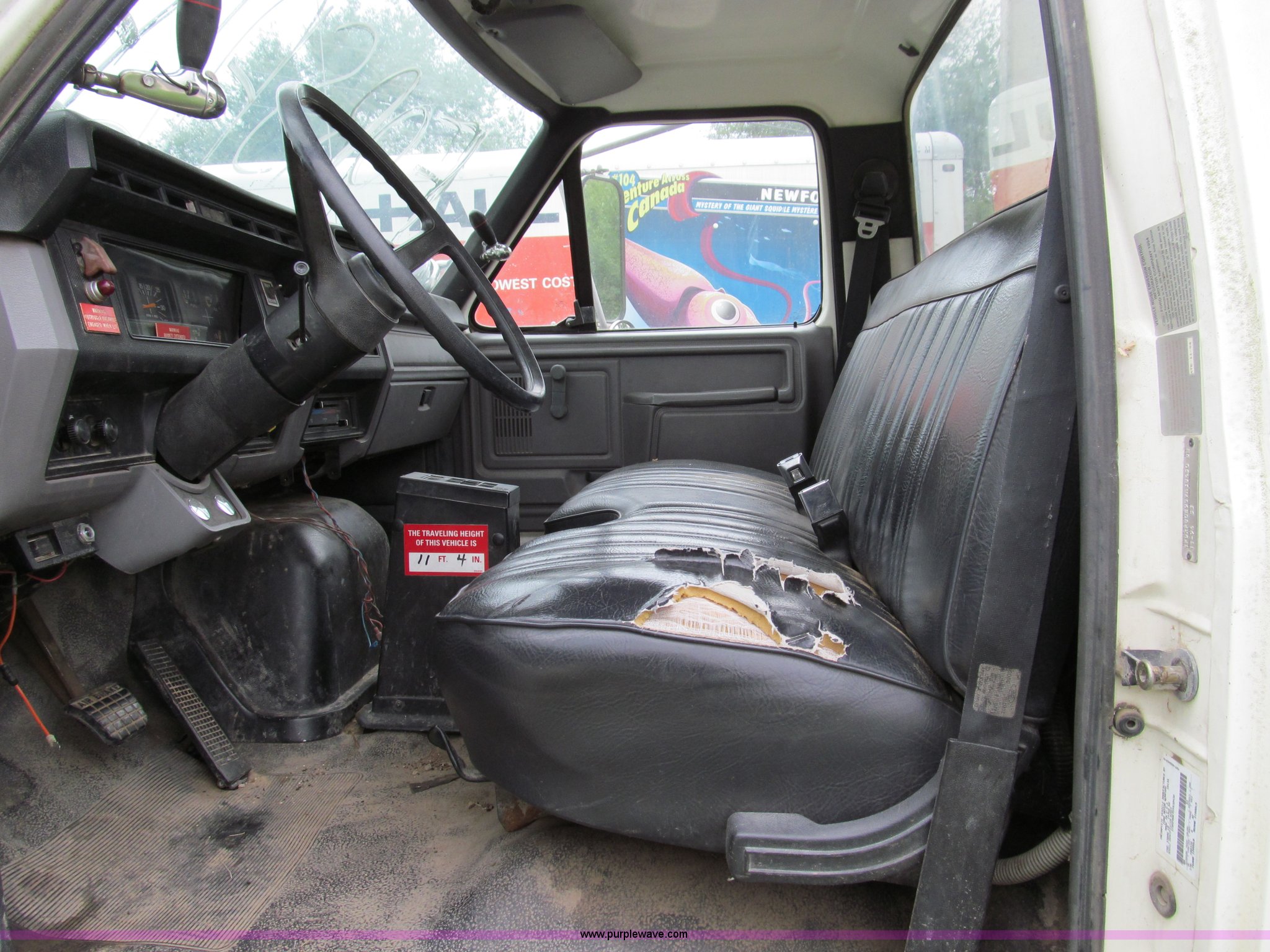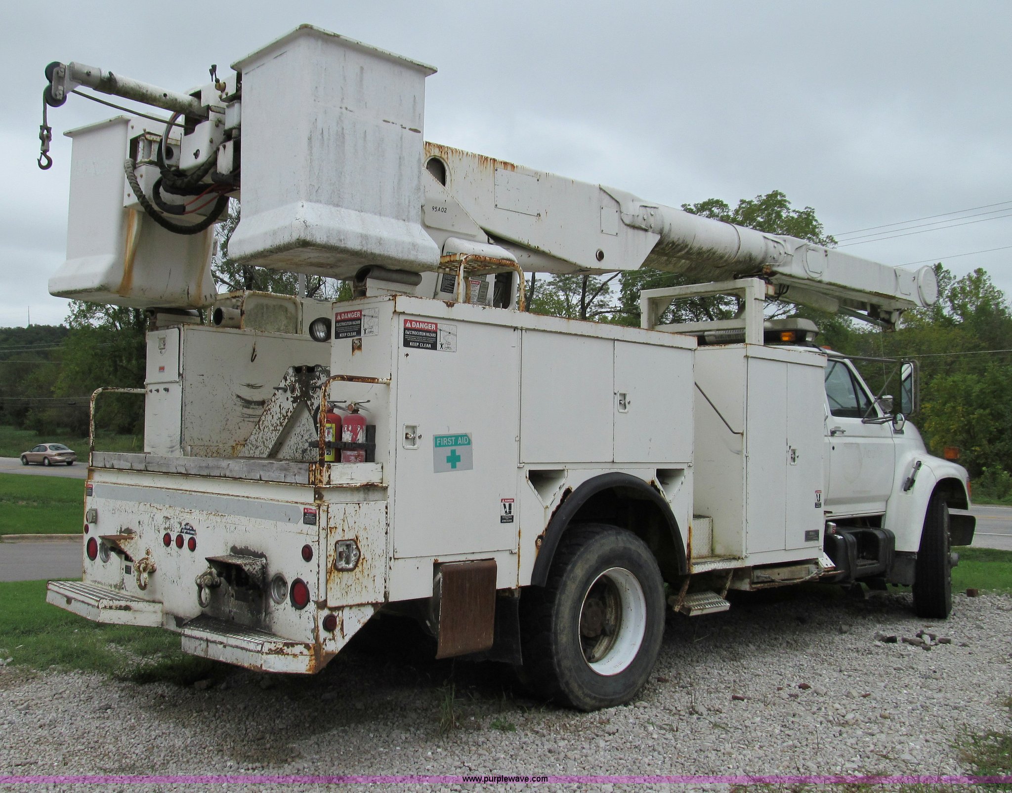 Purple Wave is selling a used Bucket Truck in Missouri. This item is a 1995 Ford F800 bucket truck with the following: 93,770 miles on odometer, 1,466 hours on meter, Ford six cylinder diesel engine, Allison automatic transmission, AC and heat, AM/FM, Manual windows and locks, Vinyl interior, (2) spotlights, 1995 Altec utility bed, Serial 37-64743, Cab mounted emergency lights, Outriggers, External speaker system, 11R22.5 tires