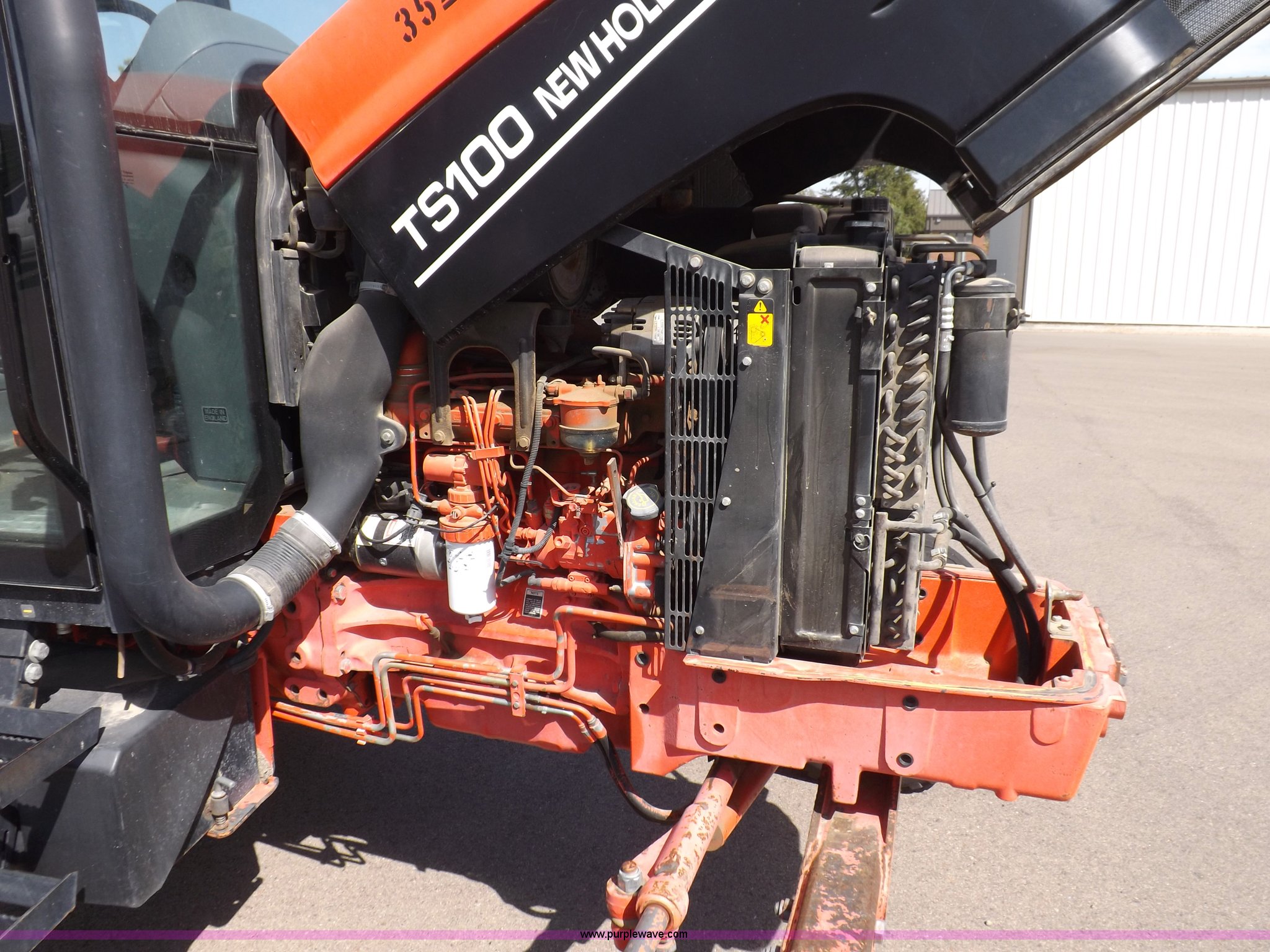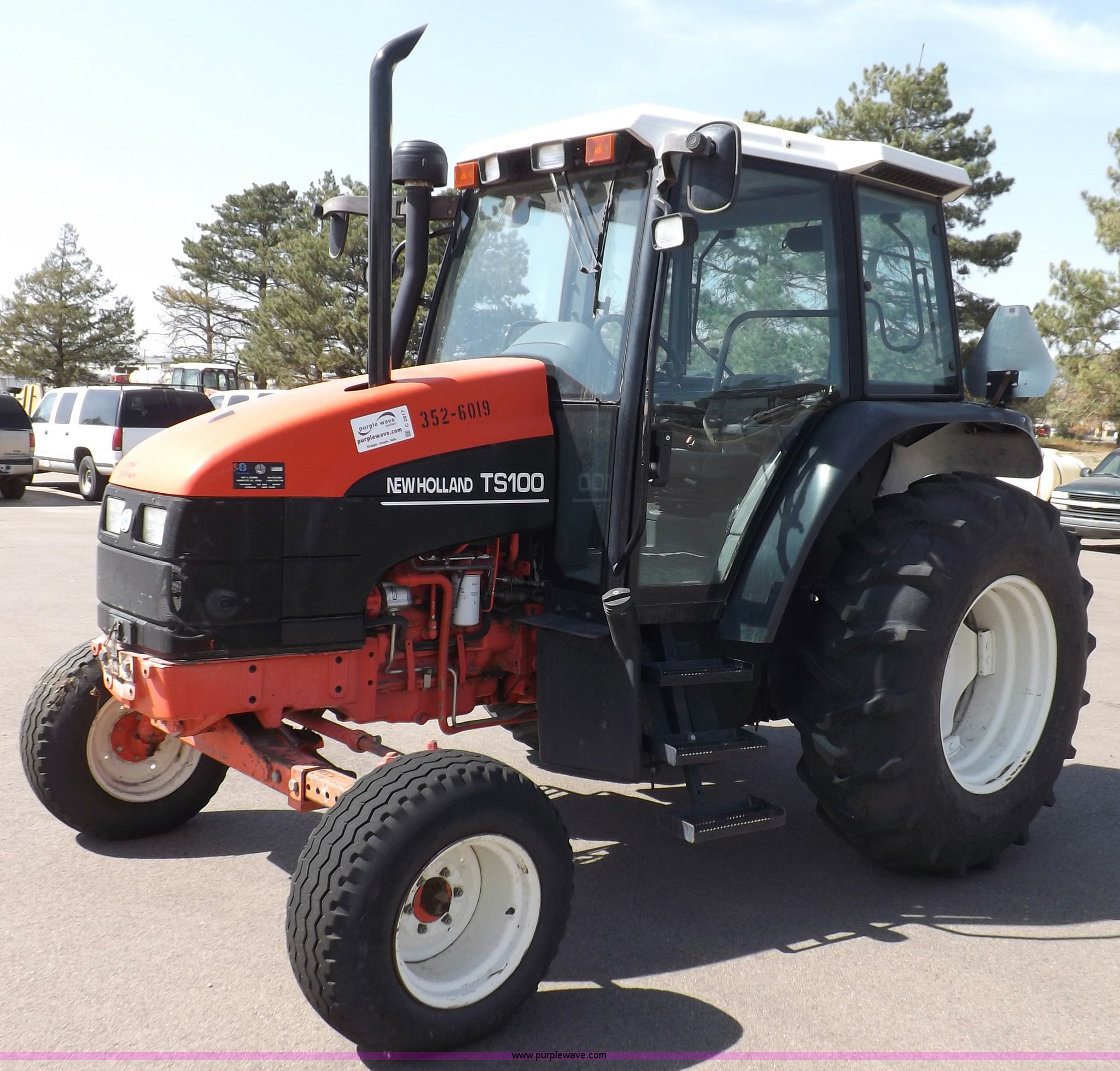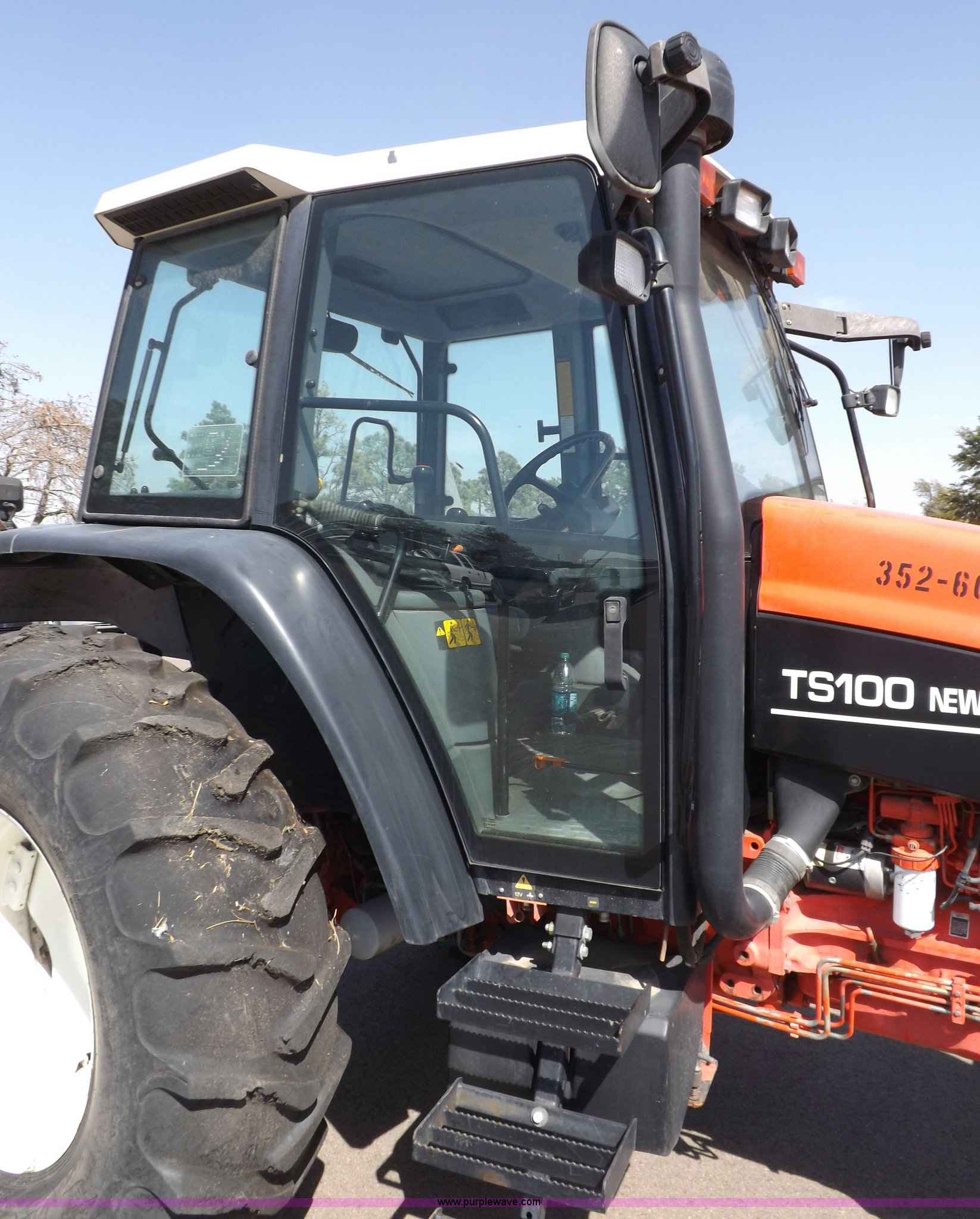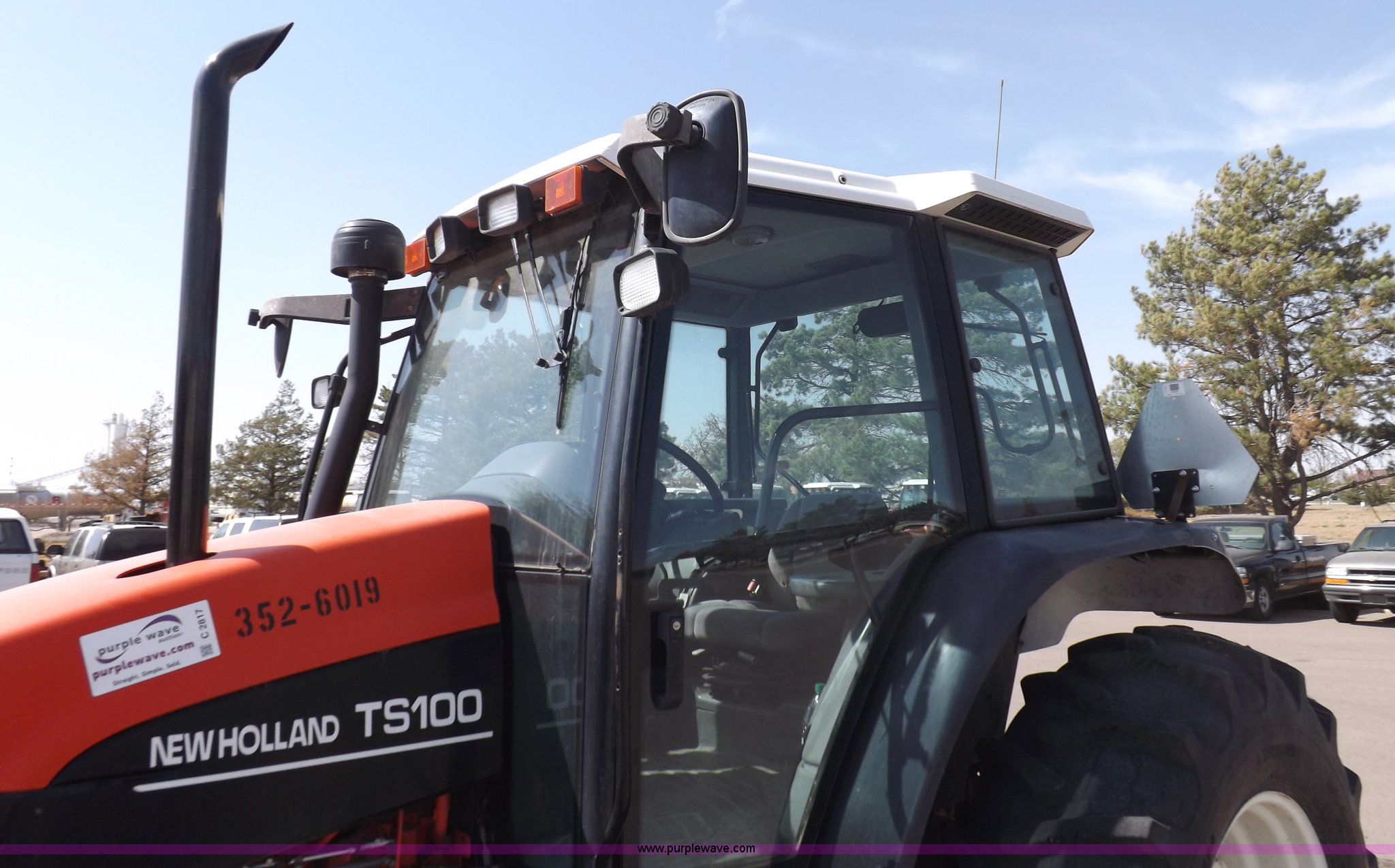Purple Wave is selling a used Tractor in Kansas. This item is a 1999 New Holland TS100 tractor with the following: 4,985 hours on meter, Four cylinder turbo diesel engine, 80hp, 12 speed transmission, 12F-12R gears, Enclosed cab, AC and heat, AC inoperable, AM/FM, Tilt steering wheel, Suspension seat, Three point, 540 PTO, Draw bar, (4) sets of rear hydraulic remotes, Front and rear windshield wipers, Front and rear work lights, 92" wheelbase, 11L-16 tires, 18.4-30 rear tires, 8,664 lbs. base operating weight, Weak batteries, must be jump started, Serial 135568B, KDOT ID 352-6019