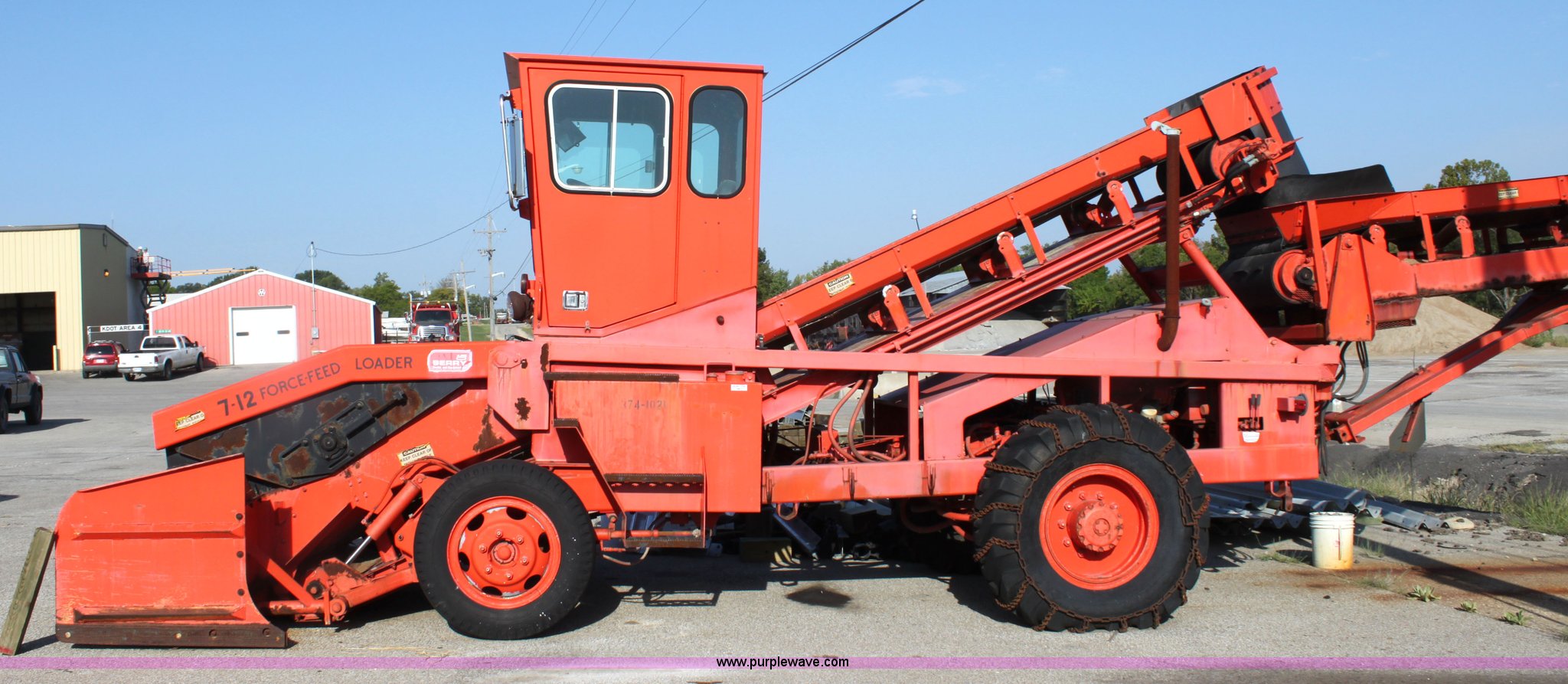 1991 Athey 7-125 force feed loader. 192 hours on meter, John Deere four cylinder diesel engine, Two speed hydrostatic transmission, 17'L x 30" rear swivel conveyor, 20' x 30" front conveyor, Dual front augers, 37"L x 6"H front paddles, Heat, Front and rear work lights, Front windshield wiper, 8.25-20 front tires, 14-24 rear tires, Not ran in two years, Batteries need replaced, Serial 722816K, KDOT ID 374-1021. Shipping quotes available. KDOT - Topeka. 101 Gage Blvd. Topeka, KS 66606