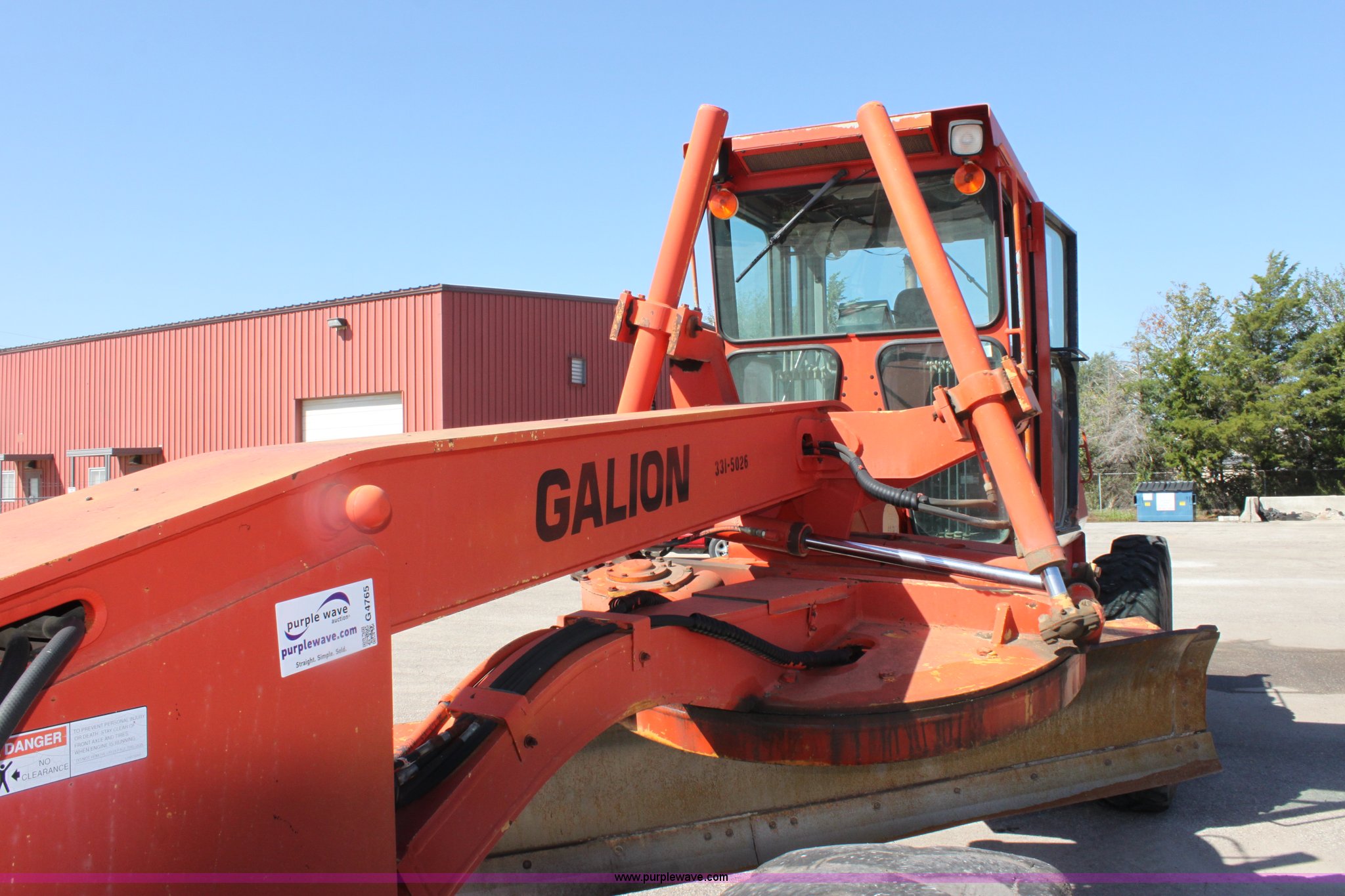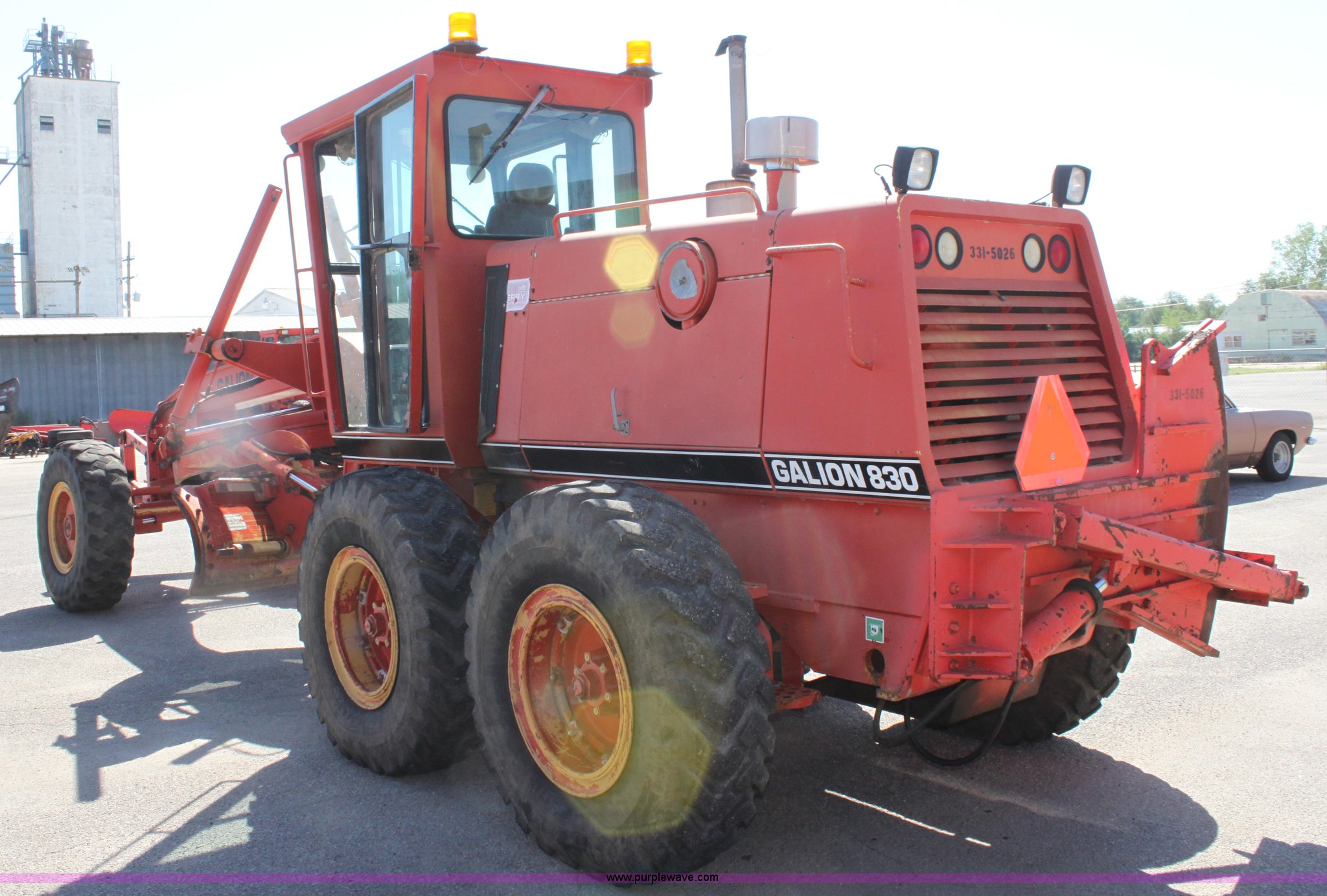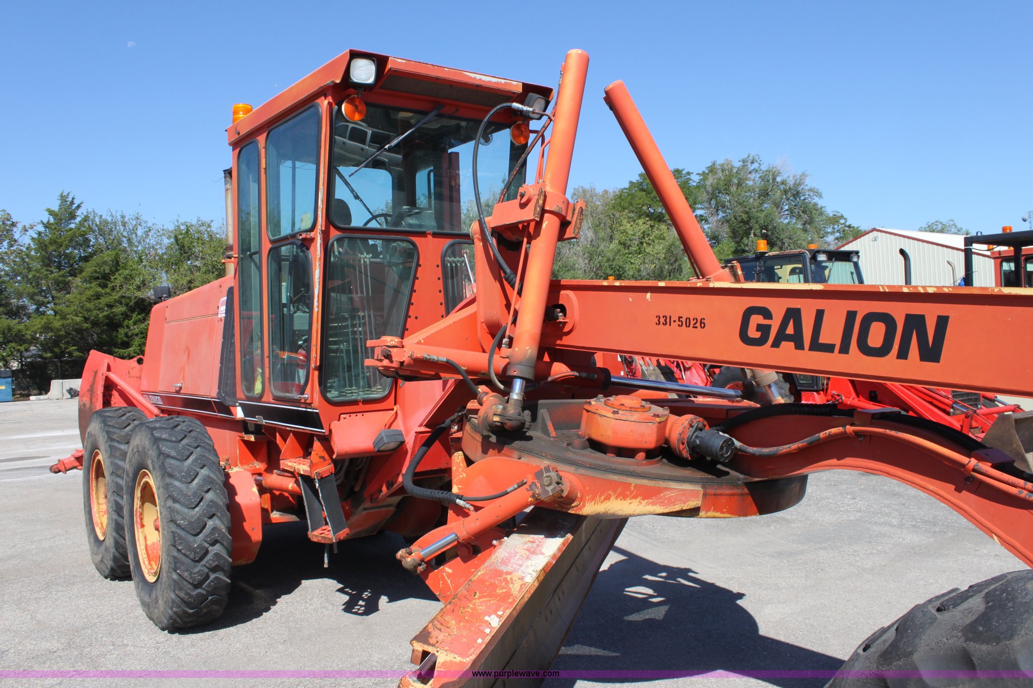 Purple Wave is selling a used Motor Grader in Kansas. This item is a 1996 Galion 830B motor grader with the following: 2,884 hours on meter, Cummins 5.9L diesel engine, Serial 45387556, Manual transmission, 6F-3R gears, AC and heat, AM/FM, Suspension seat, Tilt stick, Front and rear windshield wipers, Front and rear work lights, 12' moldboard with snow wing, Snow wing not attached, Dymax DES-MG nine tooth front scarifier, Missing teeth, 14.00-24 tires, Serial G380020U202903, KDOT ID 331-5026
