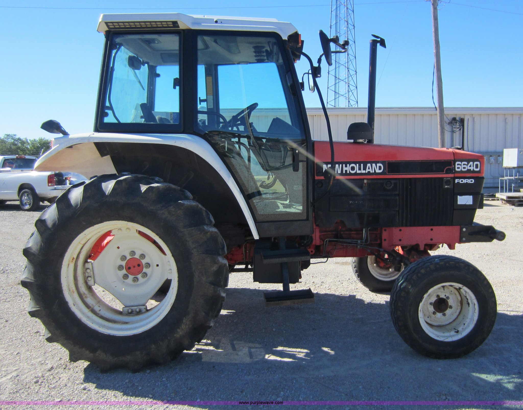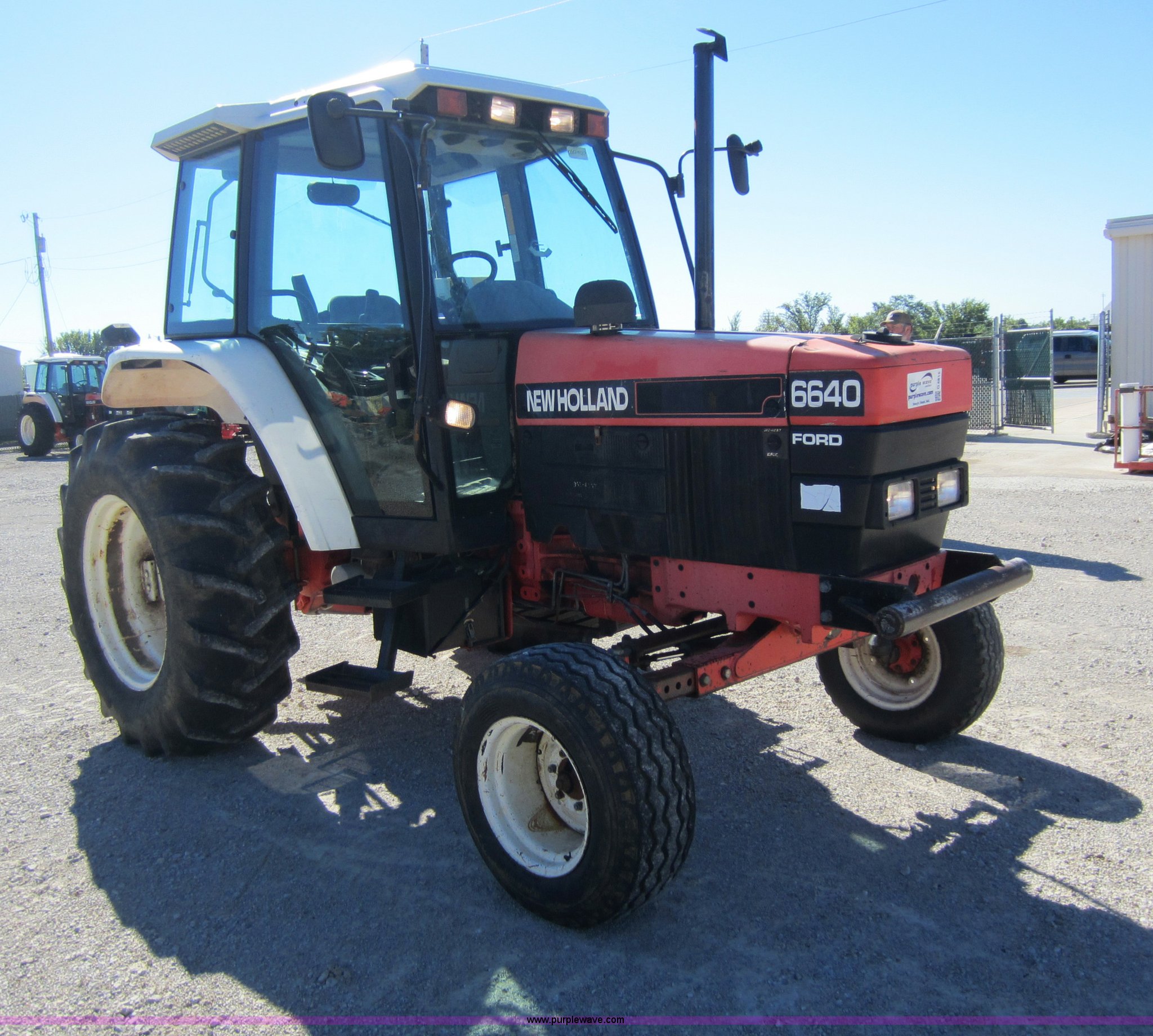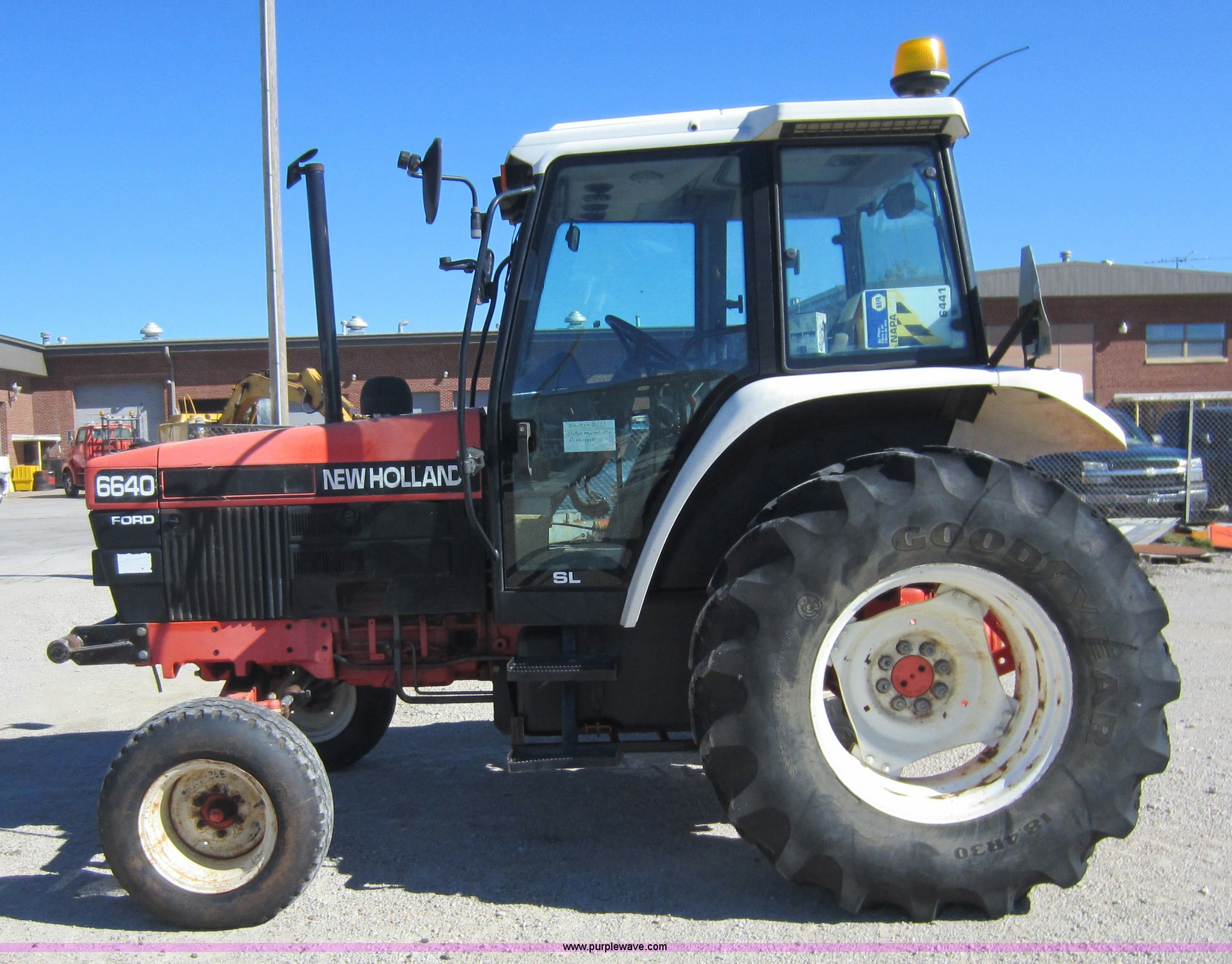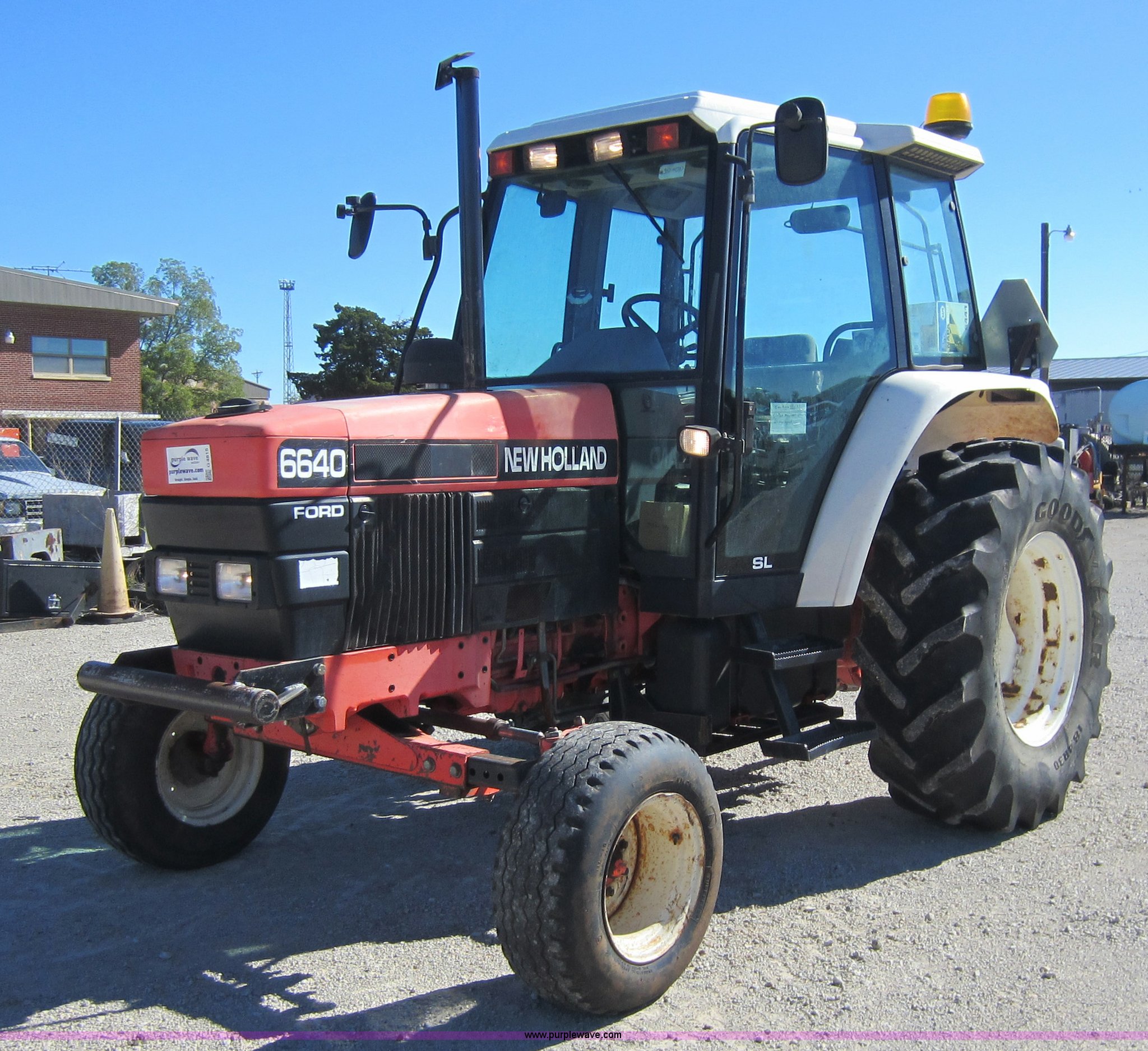 Purple Wave is selling a used Tractor in Kansas. This item is a 1997 New Holland 6640SL tractor with the following: 5,649 hours on meter, Add-on hour meter, 304 CI four cylinder diesel engine, 12 speed transmission, 12F-12R gears, AC and heat, AC works intermittently, AM/FM, Suspension seat, Front and rear windshield wipers, Front and rear work lights, Draw bar, 540 PTO, 76 HP, (4) sets of hydraulic remotes, Three point, Missing top link, 32x11-15 front tires, Front tires in poor condition, 18.4-30 rear tires, Hood latches need replaced, Clutch does not always stay disengaged, Differential lock light on, Serial 087513B, KDOT ID 352-4037