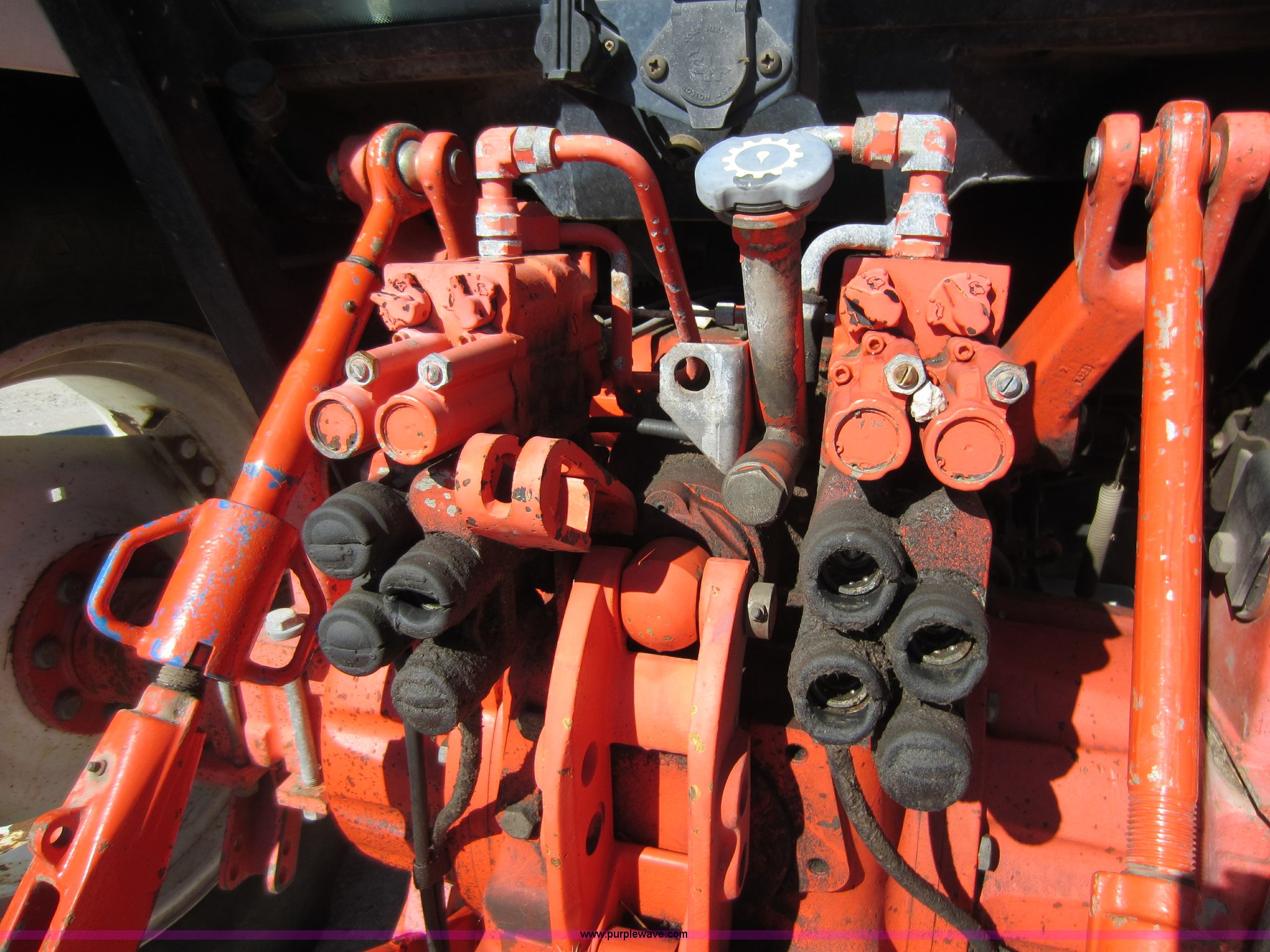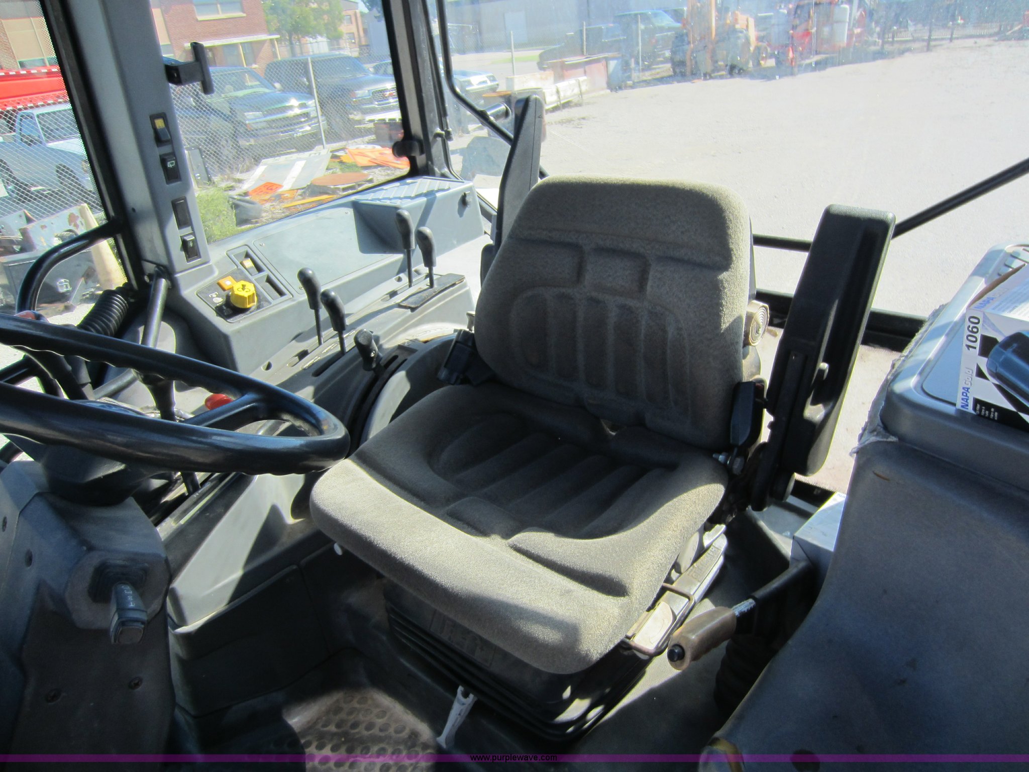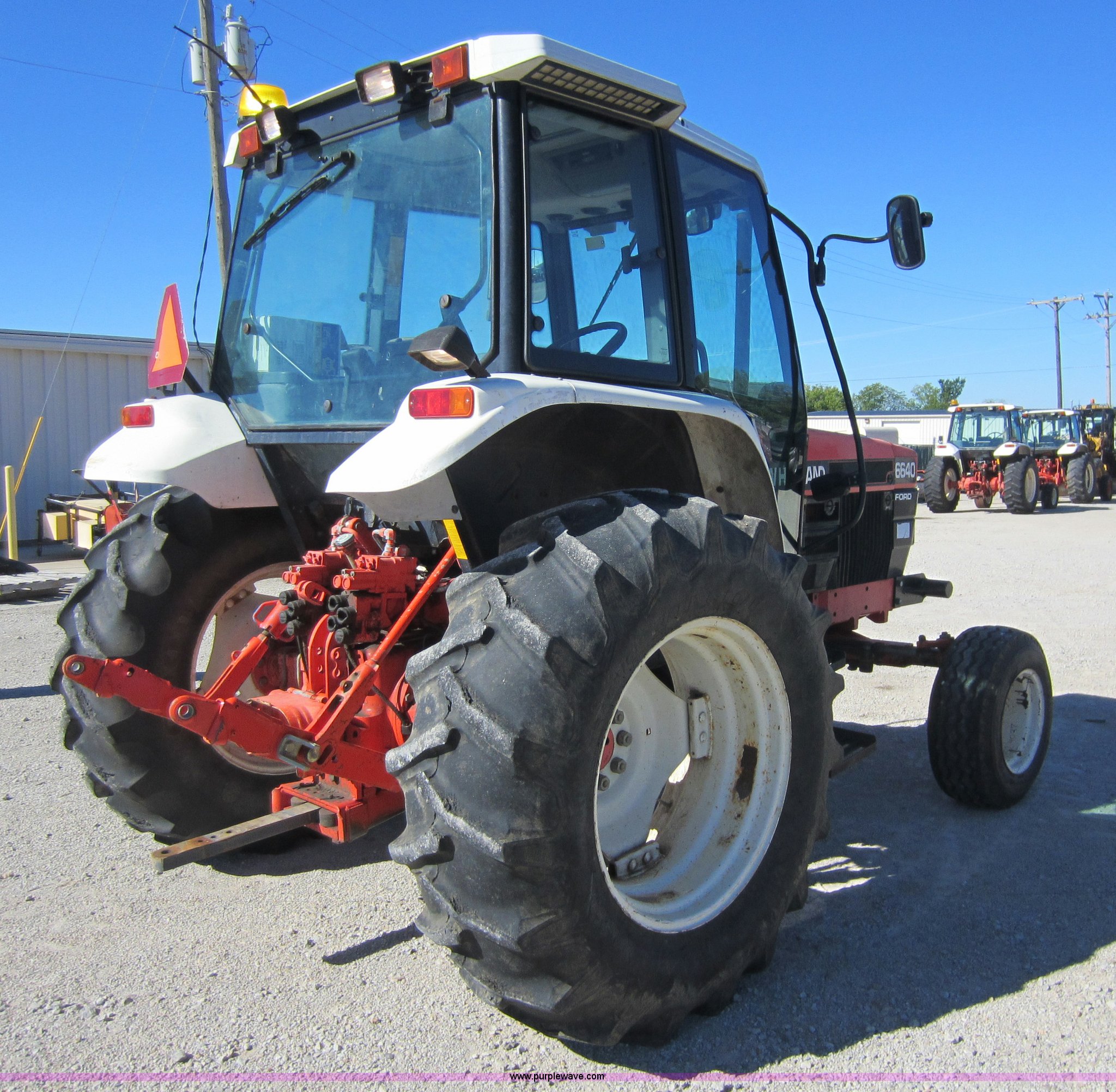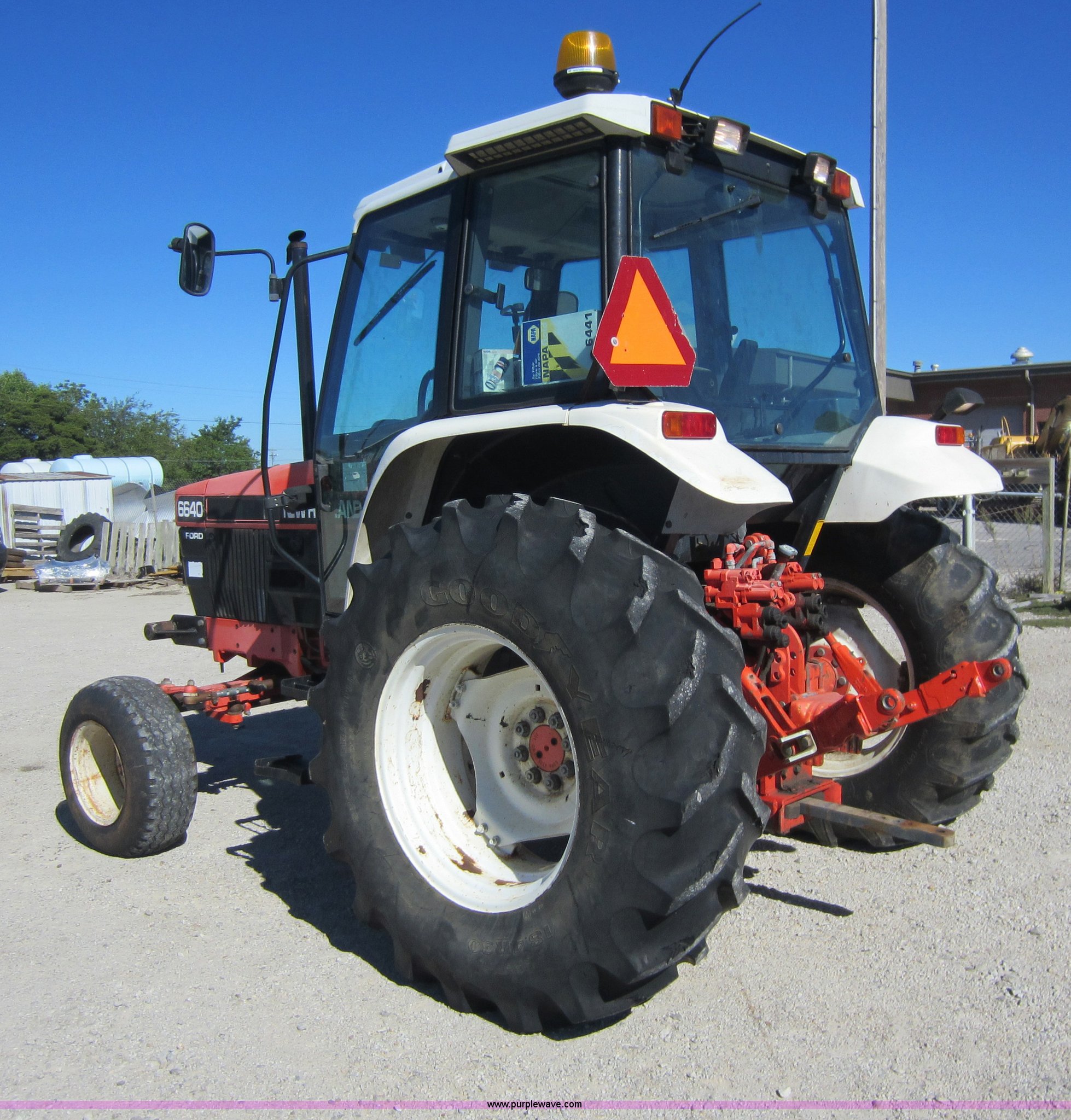 Purple Wave is selling a used Tractor in Kansas. This item is a 1997 New Holland 6640SL tractor with the following: 5,649 hours on meter, Add-on hour meter, 304 CI four cylinder diesel engine, 12 speed transmission, 12F-12R gears, AC and heat, AC works intermittently, AM/FM, Suspension seat, Front and rear windshield wipers, Front and rear work lights, Draw bar, 540 PTO, 76 HP, (4) sets of hydraulic remotes, Three point, Missing top link, 32x11-15 front tires, Front tires in poor condition, 18.4-30 rear tires, Hood latches need replaced, Clutch does not always stay disengaged, Differential lock light on, Serial 087513B, KDOT ID 352-4037