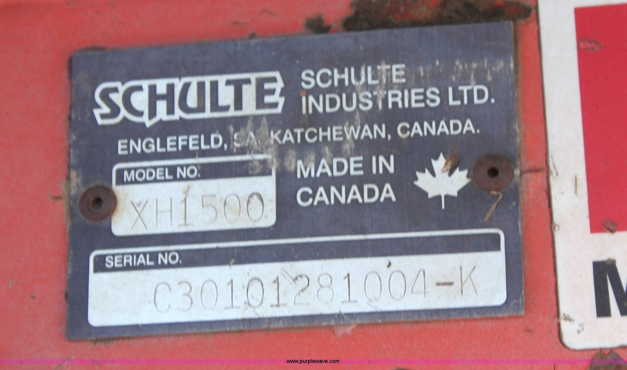 2000 Schulte XH1500 batwing rotary mower. 15'W, 540 PTO, Hydraulic fold and lift, Clevis hitch, Serial C30101281004K, KDOT ID 397-1069. Shipping quotes available. KDOT - Topeka. 101 Gage Blvd. Topeka, KS 66606
