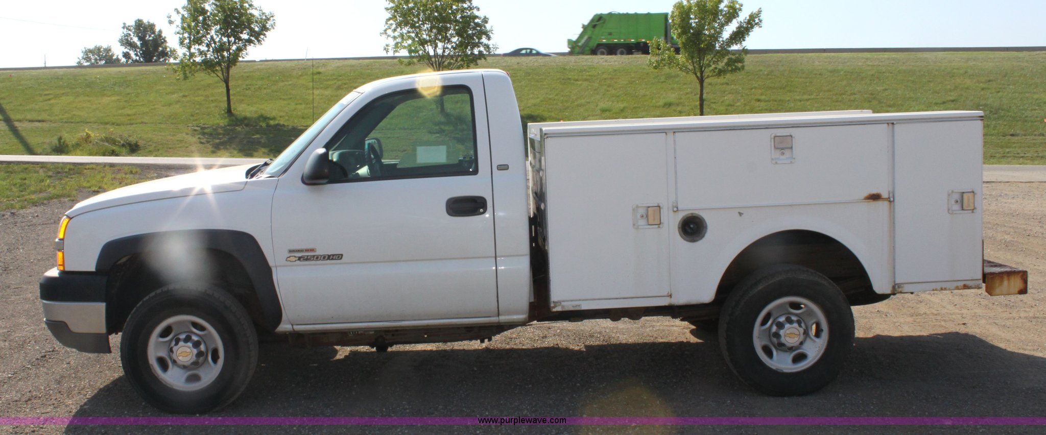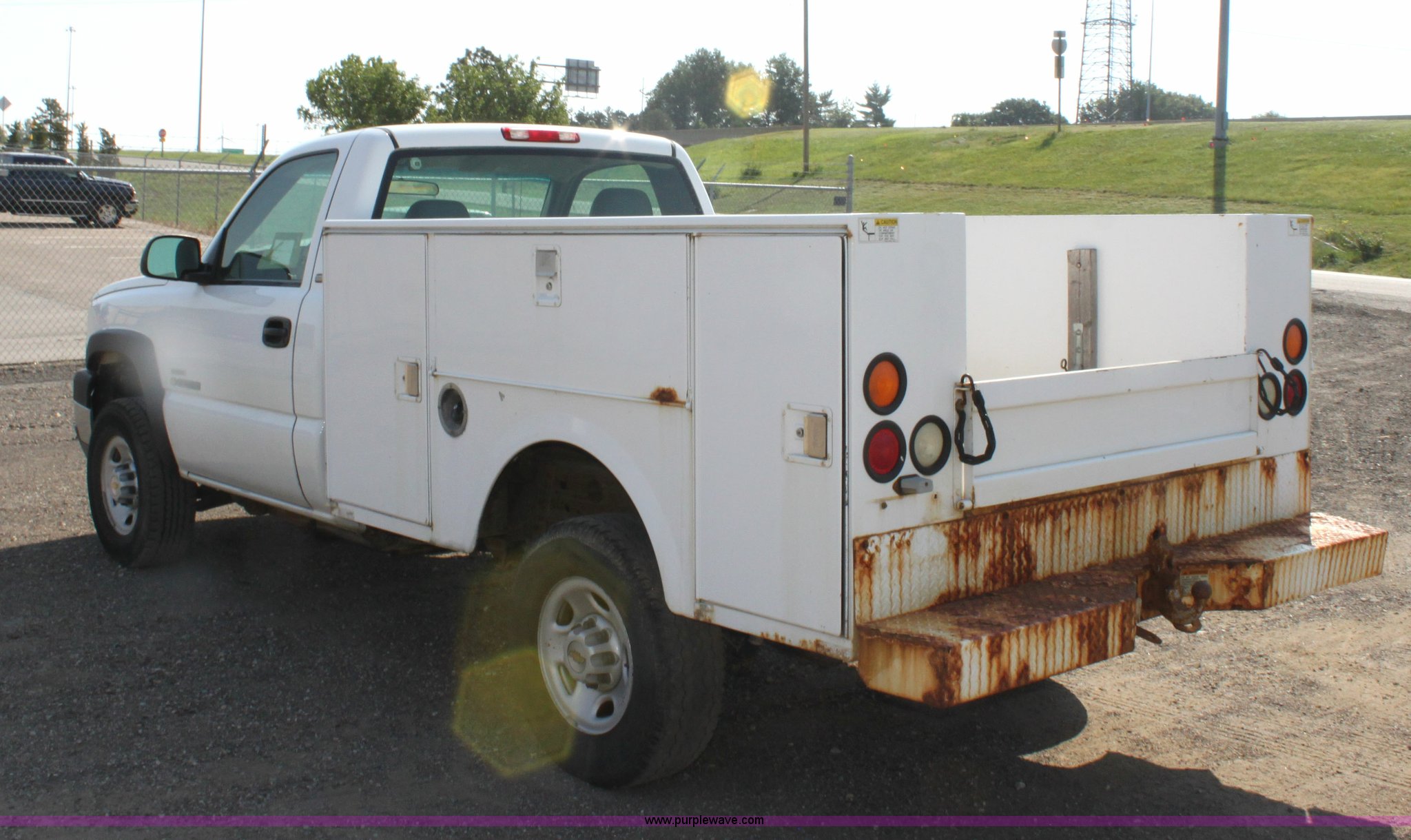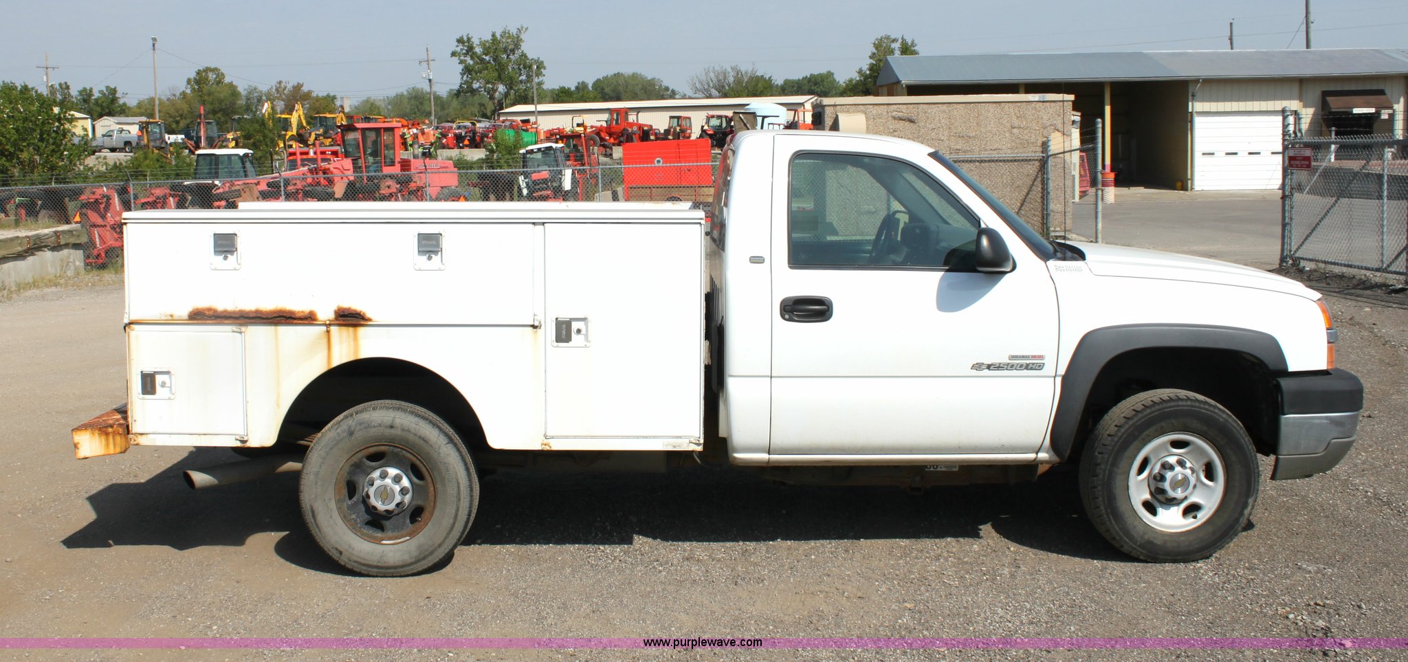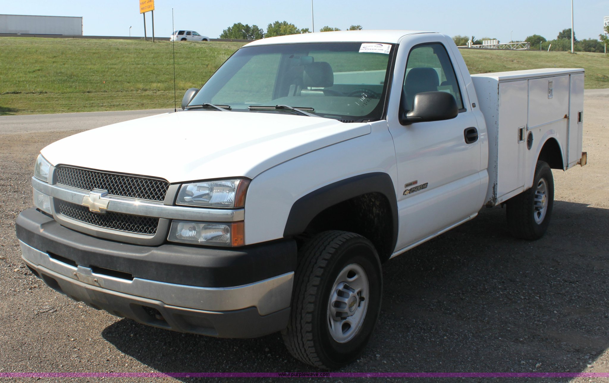 Purple Wave is selling a used Service Truck in Kansas. This item is a 2003 Chevrolet Silverado C2500HD pickup truck with the following: 240,695 miles on odometer, Duramax 6.6L V8 diesel engine, Allison automatic transmission, AC and heat, AC non-functional, AM/FM, Tilt, Cruise, Vinyl interior, Utility bed, Pintle hitch, Trailer wiring, 245/75R16 tires, Paint faded and scratched, Rust holes in bed, KDOT ID 112-0032