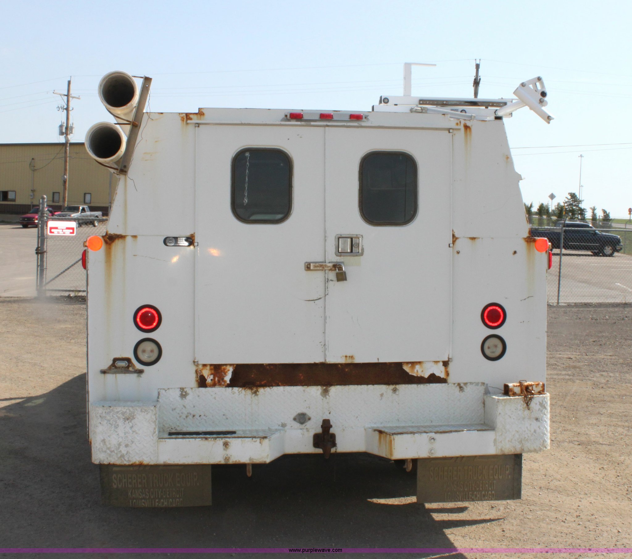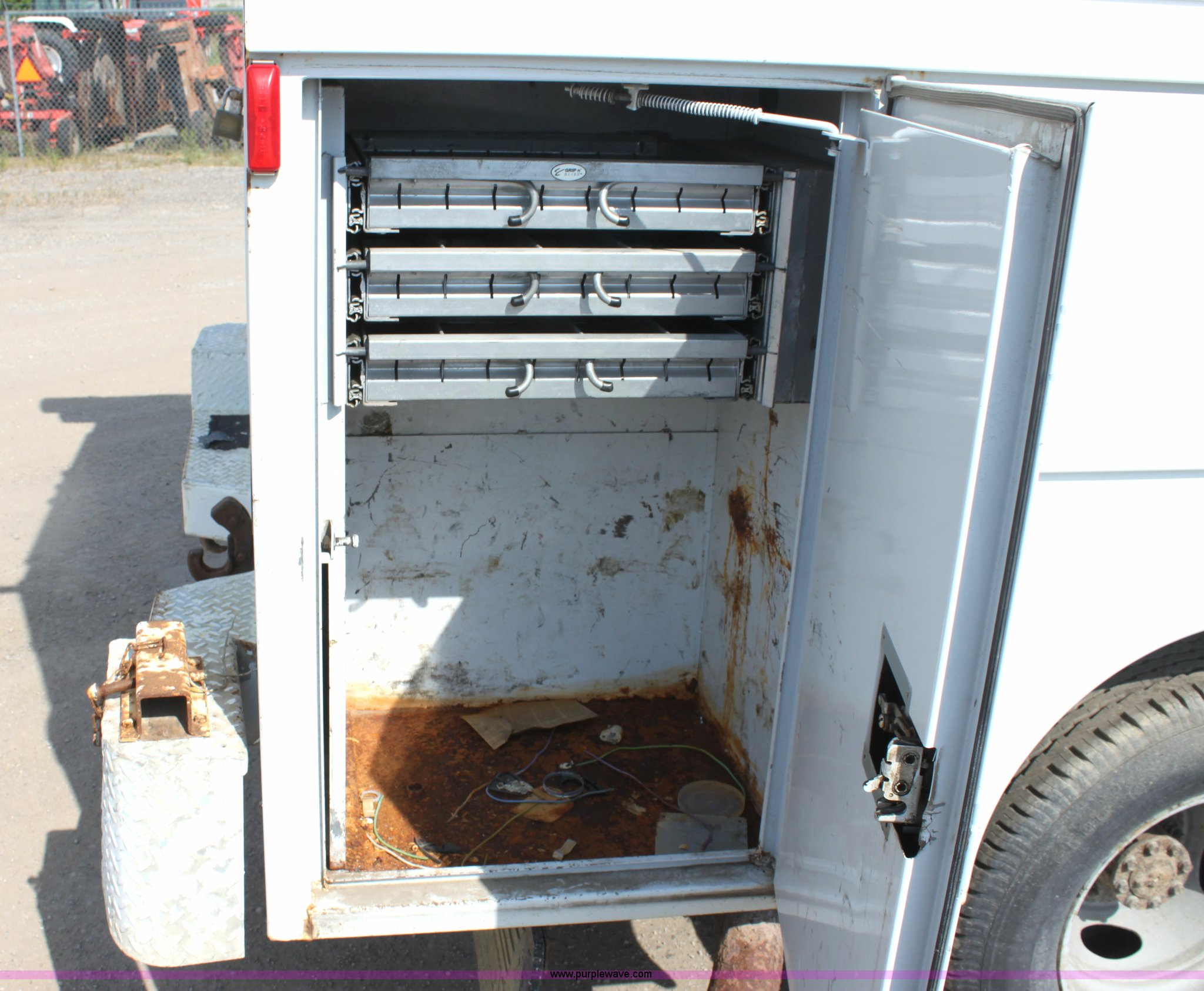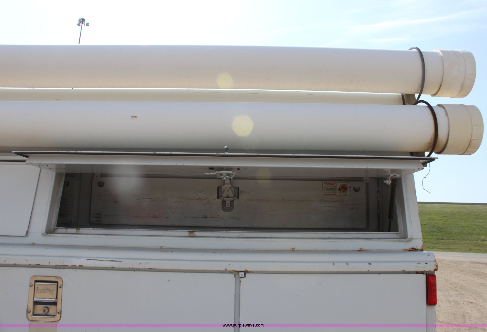 2002 Ford F350 Super Duty pickup truck. 123,650 miles on odometer, Powerstroke V8 7.3L turbo diesel engine, Automatic transmission No forward gears, AC and heat, AM/FM/cassette, Tilt, Cruise, Manual windows and locks, Front tow hooks, Reading enclosed utility bed 49"H interior, Ladder rack, Pintle hitch, Trailer wiring, 215/85R16 tires, Bad transmission, no forward gears, Battery needs replaced, Paint faded and scratched, KDOT ID 153-1012. 1FDWX36F72ED12949. Shipping quotes available. KDOT - Topeka. 101 Gage Blvd. Topeka, KS 66606