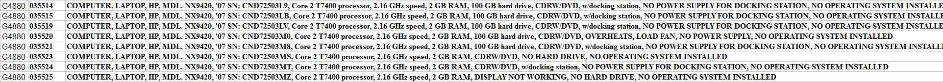 (8) HP NX9420 laptop computers. Core 2 T7400 processor , 2.16 GHz, 2 GB RAM, KDOT ID 035514, 035515, 035519, 035520, 035521, 035523, 035524, 035525. See images for detailed inventory. Shipping quotes available. KDOT - Norton. 312 S Second. Norton, KS 67654
