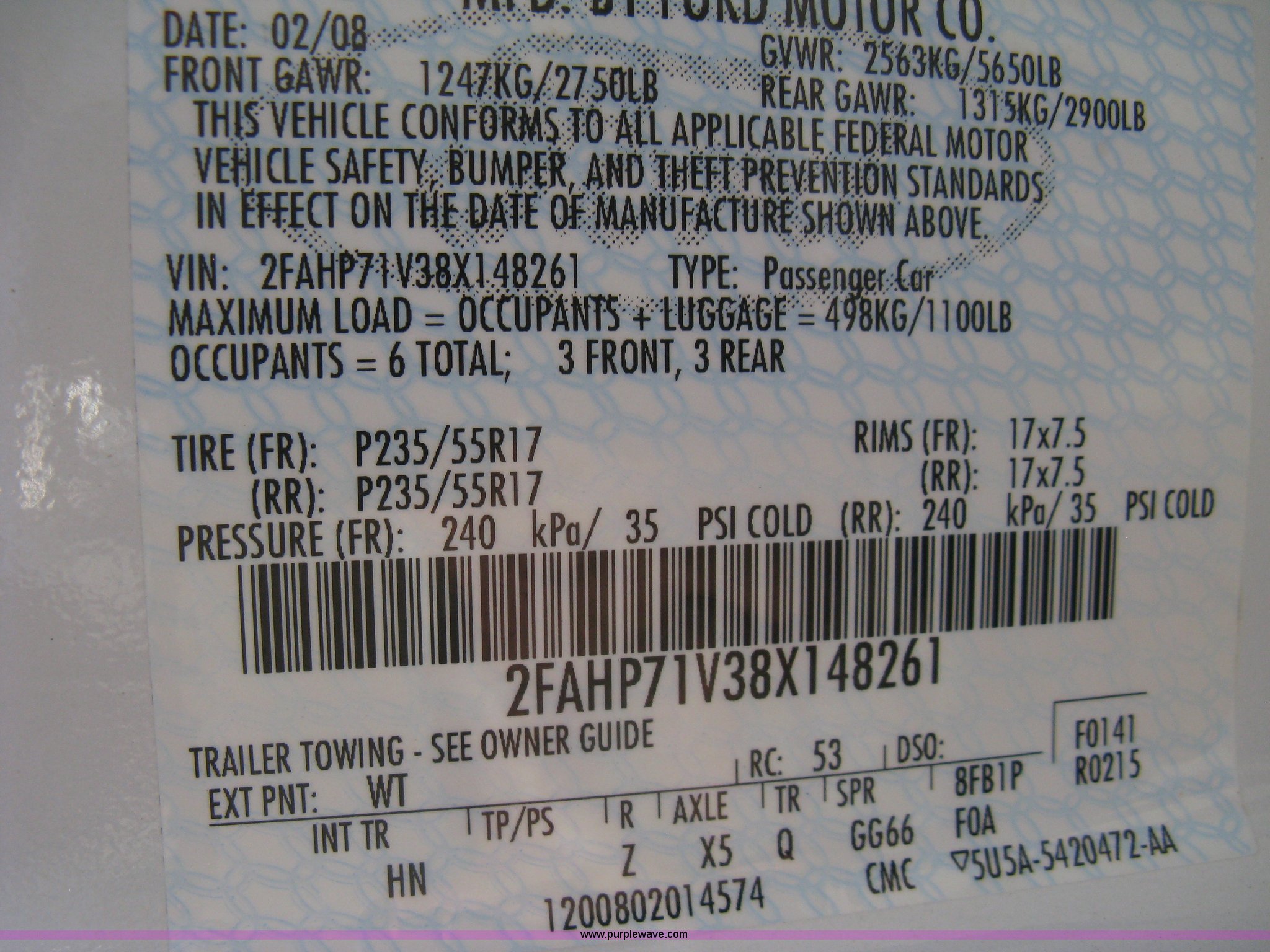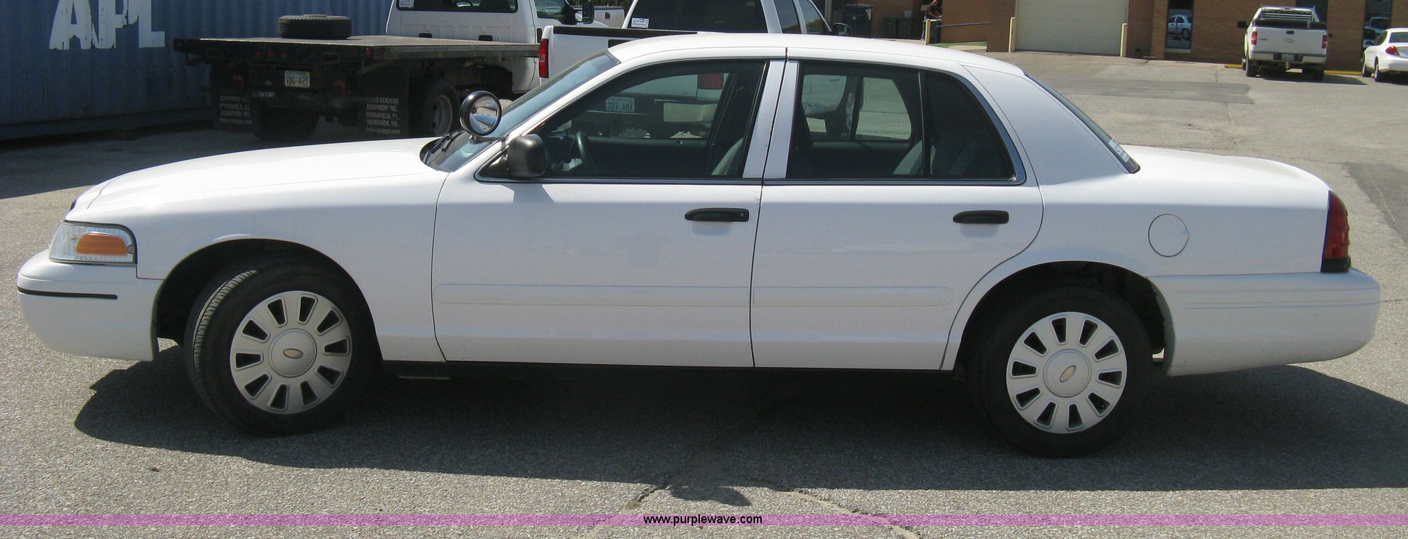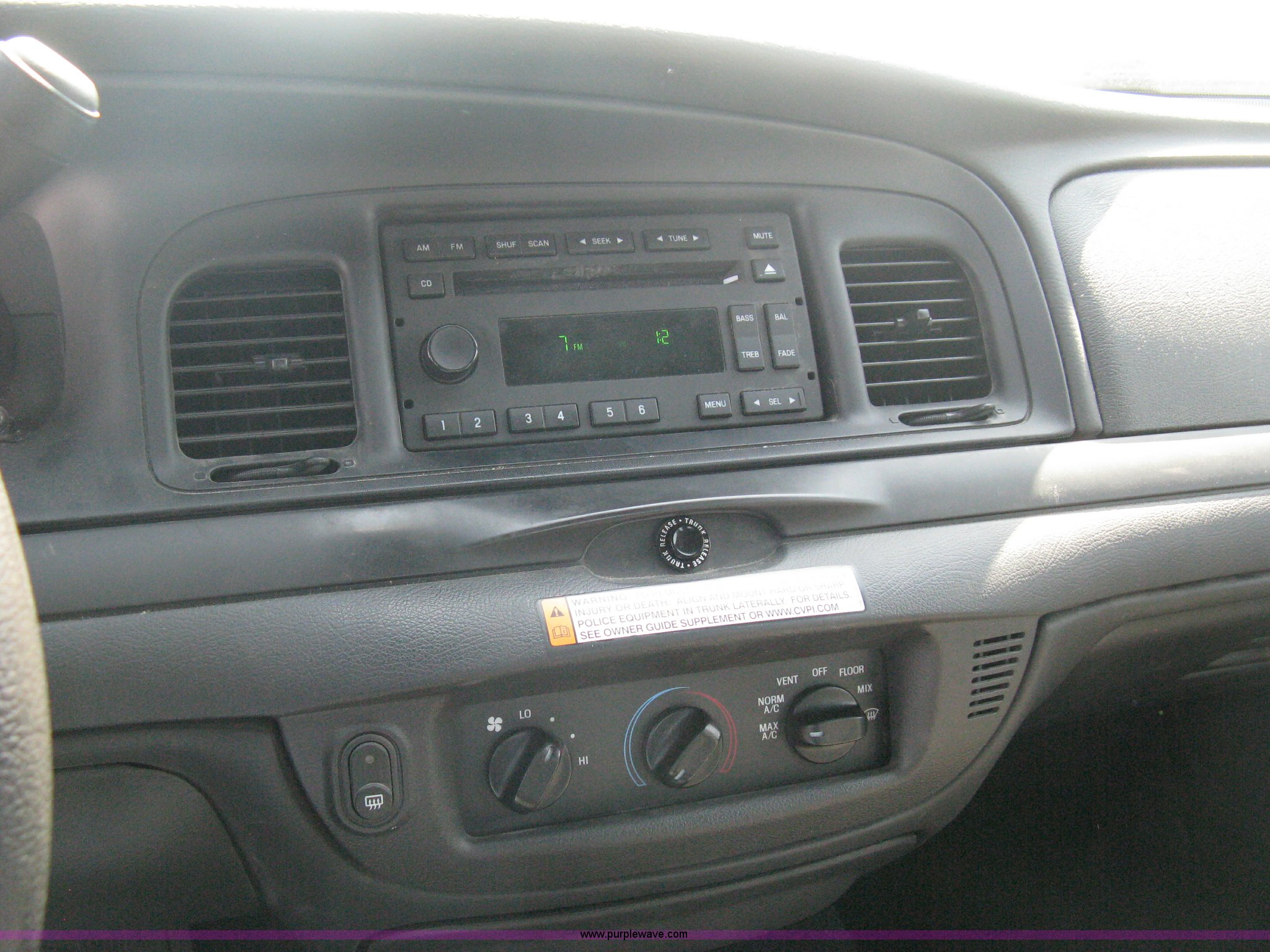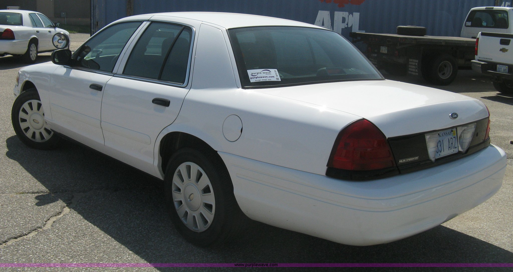 Purple Wave is selling a used Passenger Vehicle in Kansas. This item is a 2008 Ford Crown Victoria Police Interceptor with the following: 105,384 miles on odometer, 4.6L V8 EFI gas engine, Automatic transmission, AC and heat, Tilt, Cruise, AM/FM/CD, Power windows, locks, mirrors, and seats, Cloth interior, Spotlight, P235/55R17 tires, Spare tire, Equip# 5926