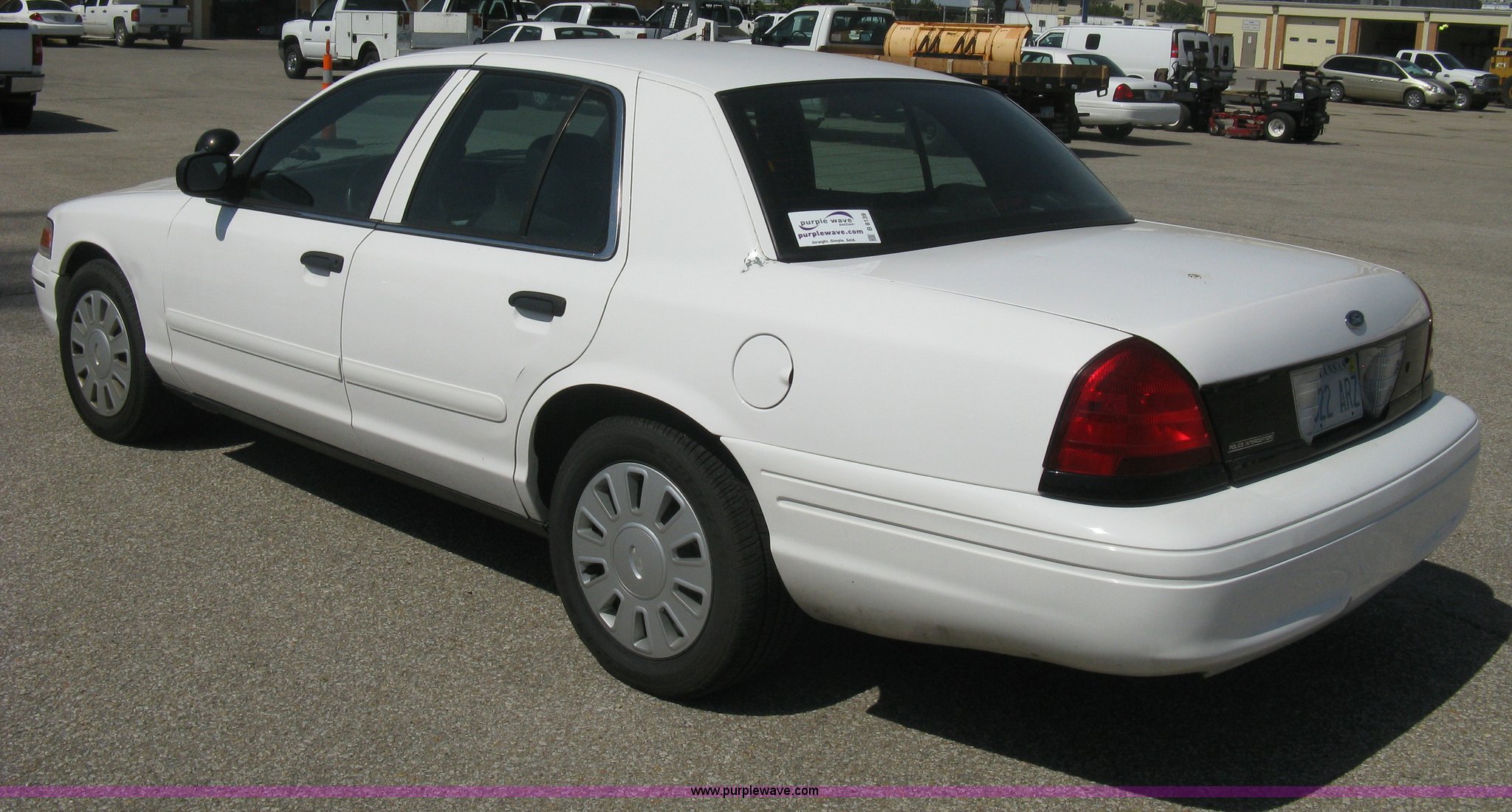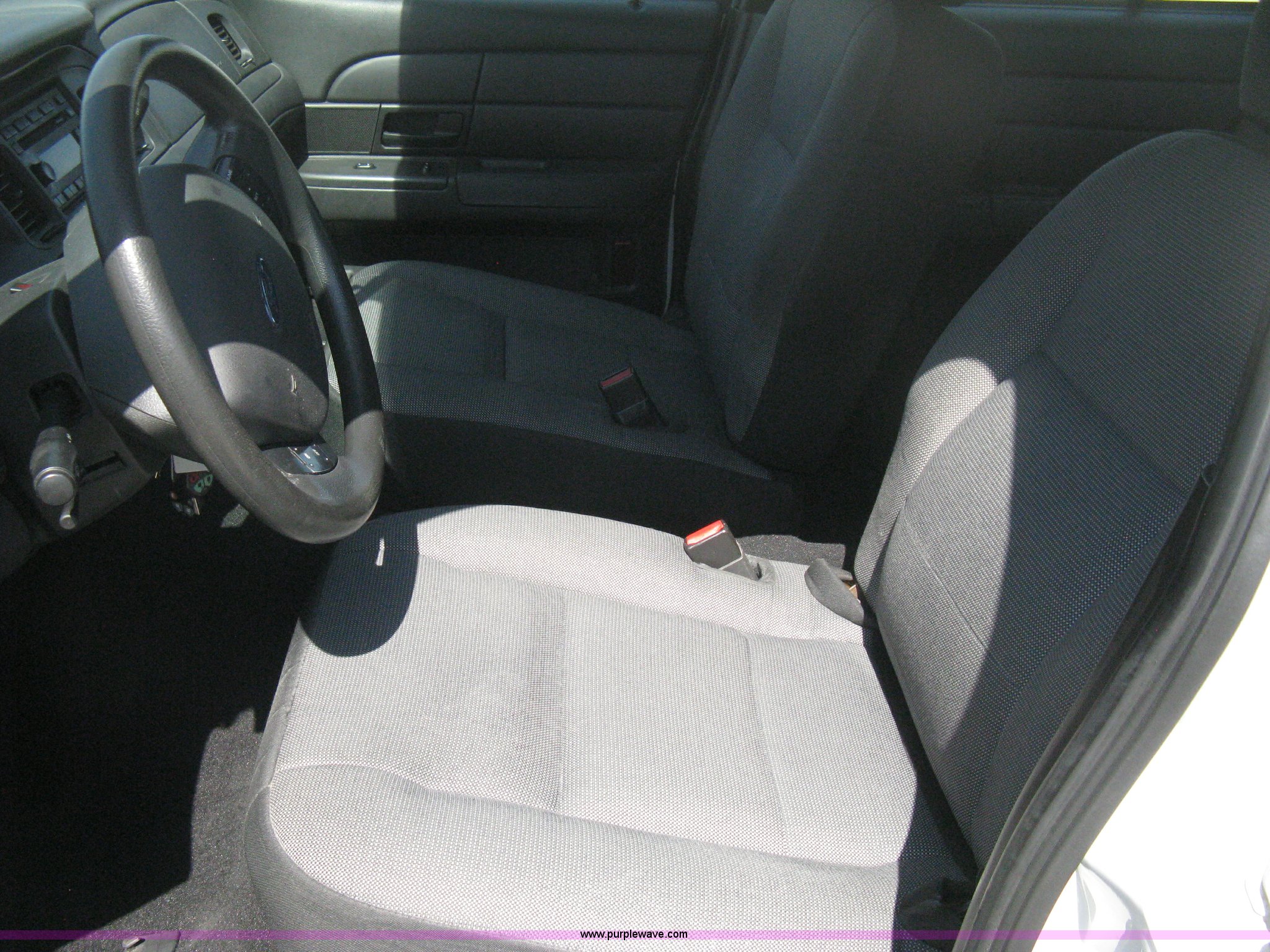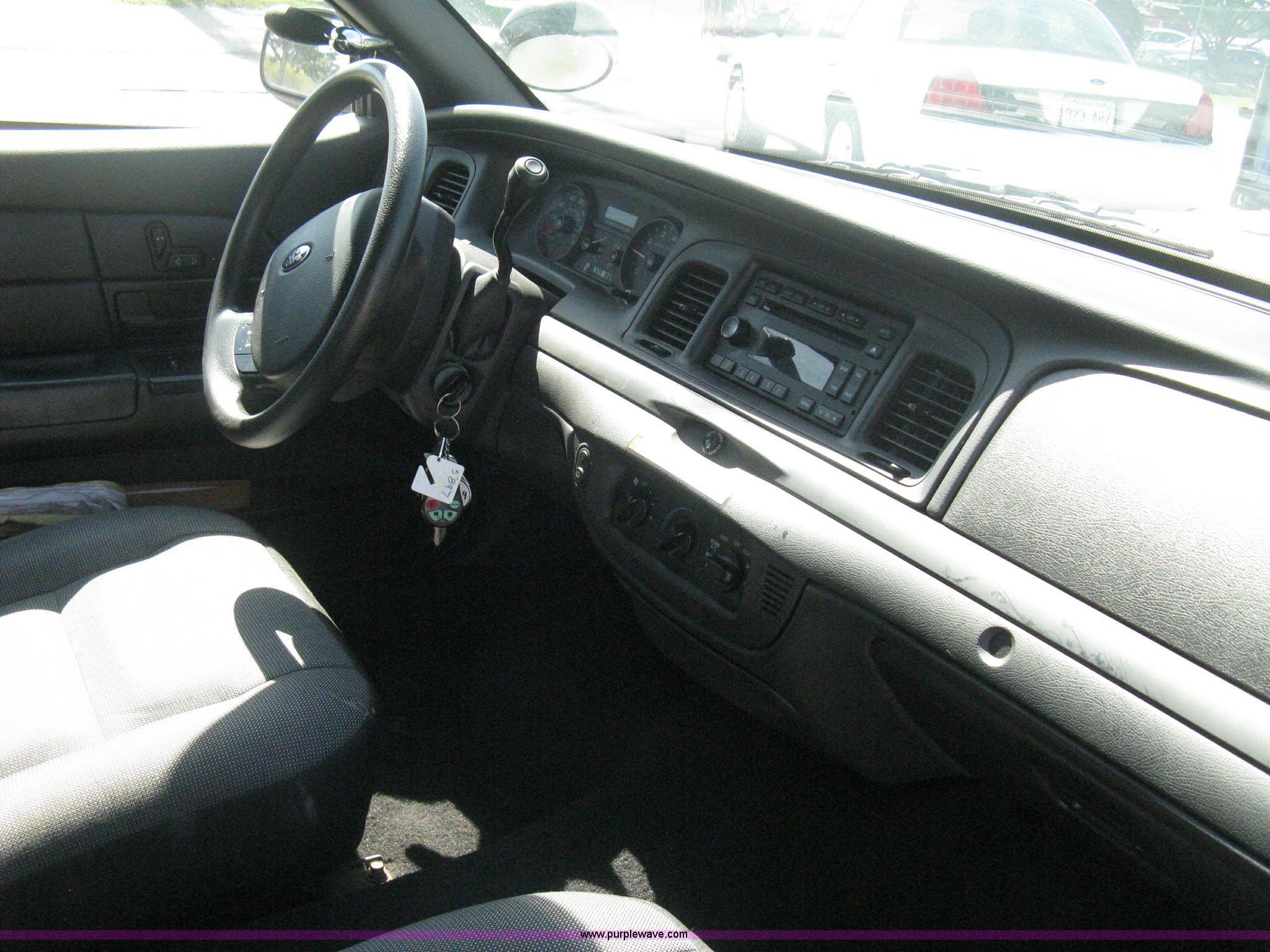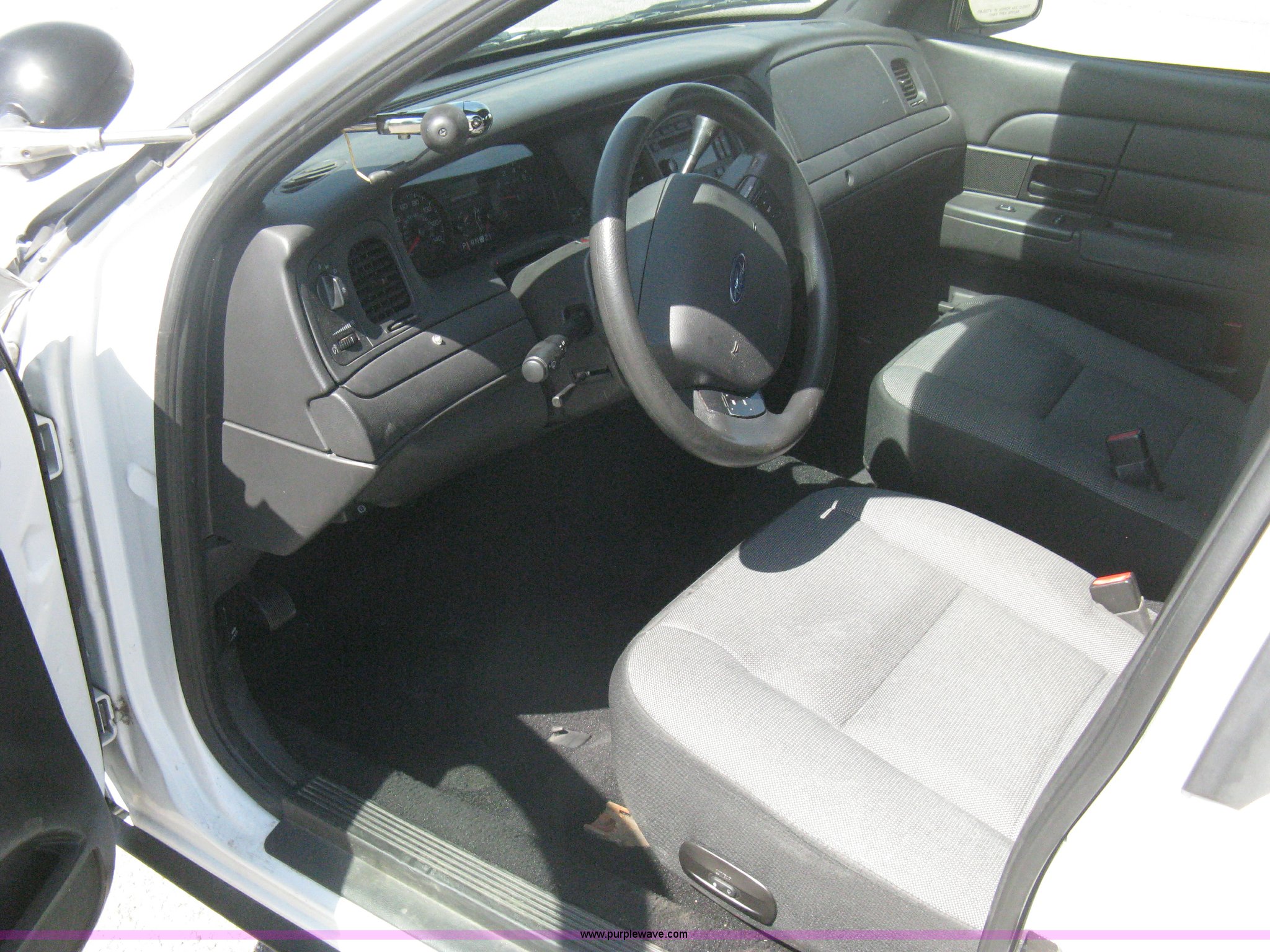 Purple Wave is selling a used Passenger Vehicle in Kansas. This item is a 2008 Ford Crown Victoria Police Interceptor with the following: 105,447 miles on odometer, 4.6L V8 EFI gas engine, Automatic transmission, AC and heat, Tilt, Cruise, AM/FM/CD, Power windows, locks, mirrors, and seats, Cloth interior, Key fob, Spotlight, P235/55R17 tires, Spare tire, Paint peeling, Equip# 5897