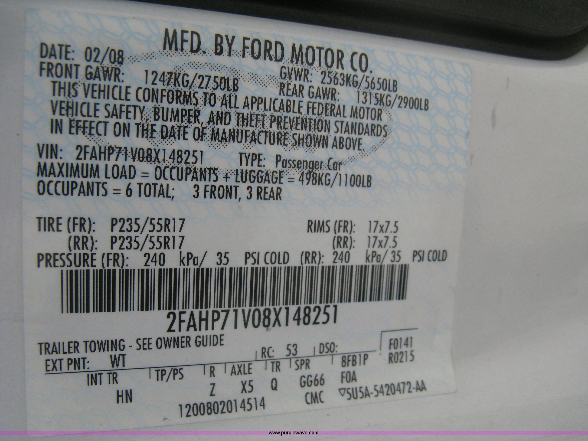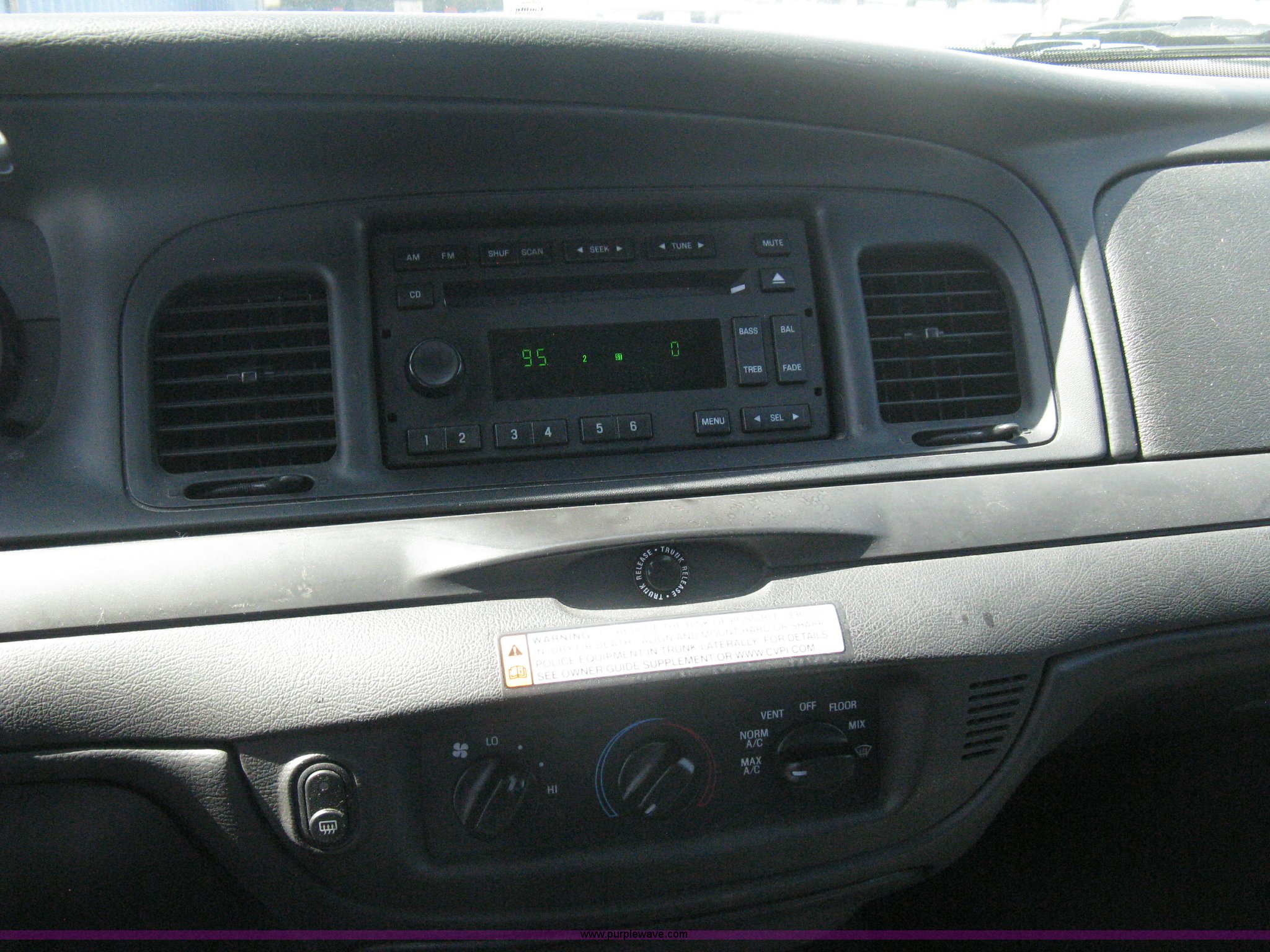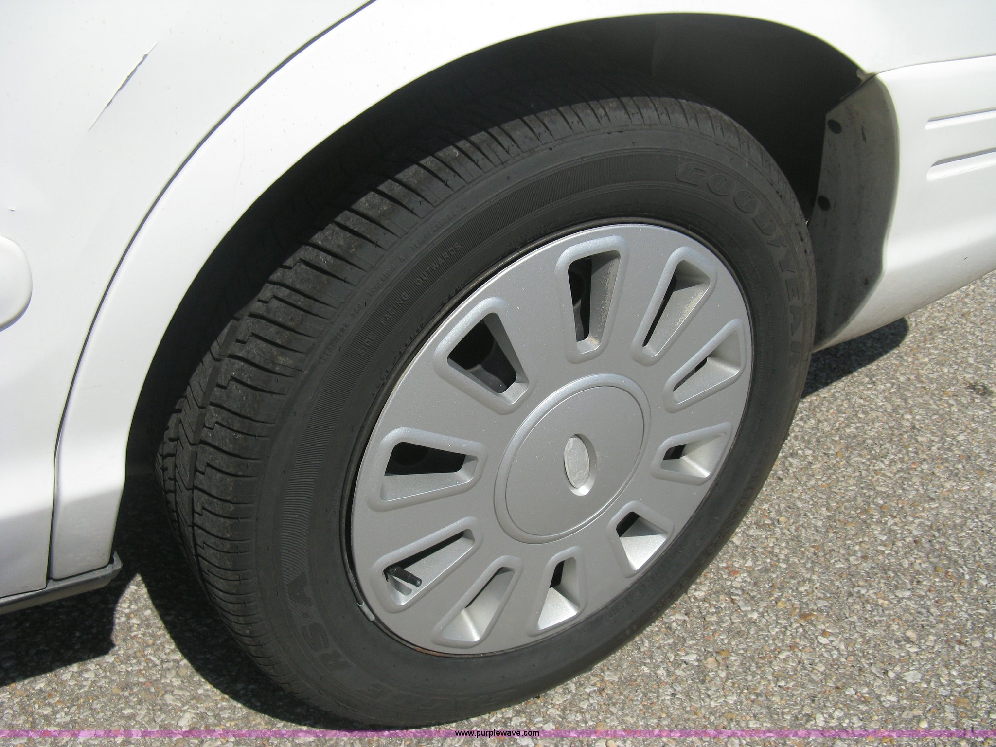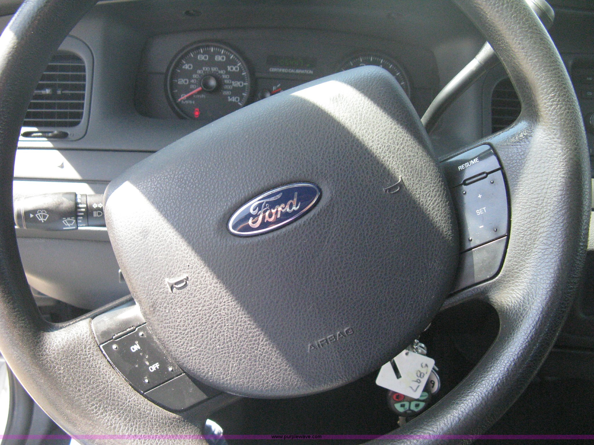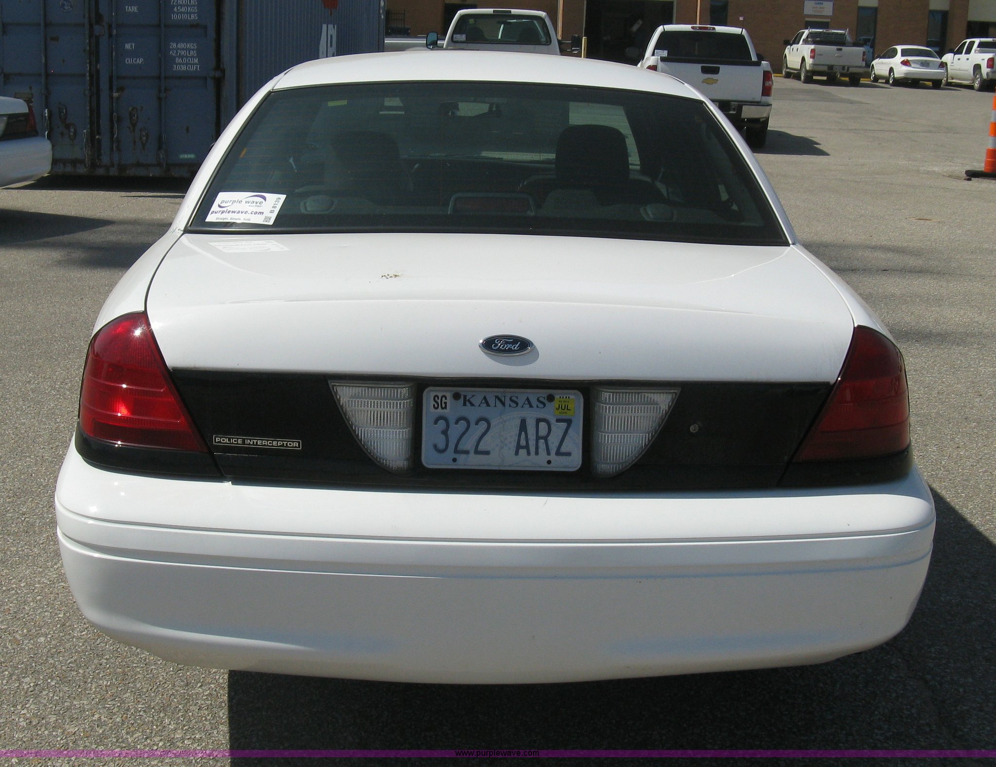 Purple Wave is selling a used Passenger Vehicle in Kansas. This item is a 2008 Ford Crown Victoria Police Interceptor with the following: 105,447 miles on odometer, 4.6L V8 EFI gas engine, Automatic transmission, AC and heat, Tilt, Cruise, AM/FM/CD, Power windows, locks, mirrors, and seats, Cloth interior, Key fob, Spotlight, P235/55R17 tires, Spare tire, Paint peeling, Equip# 5897