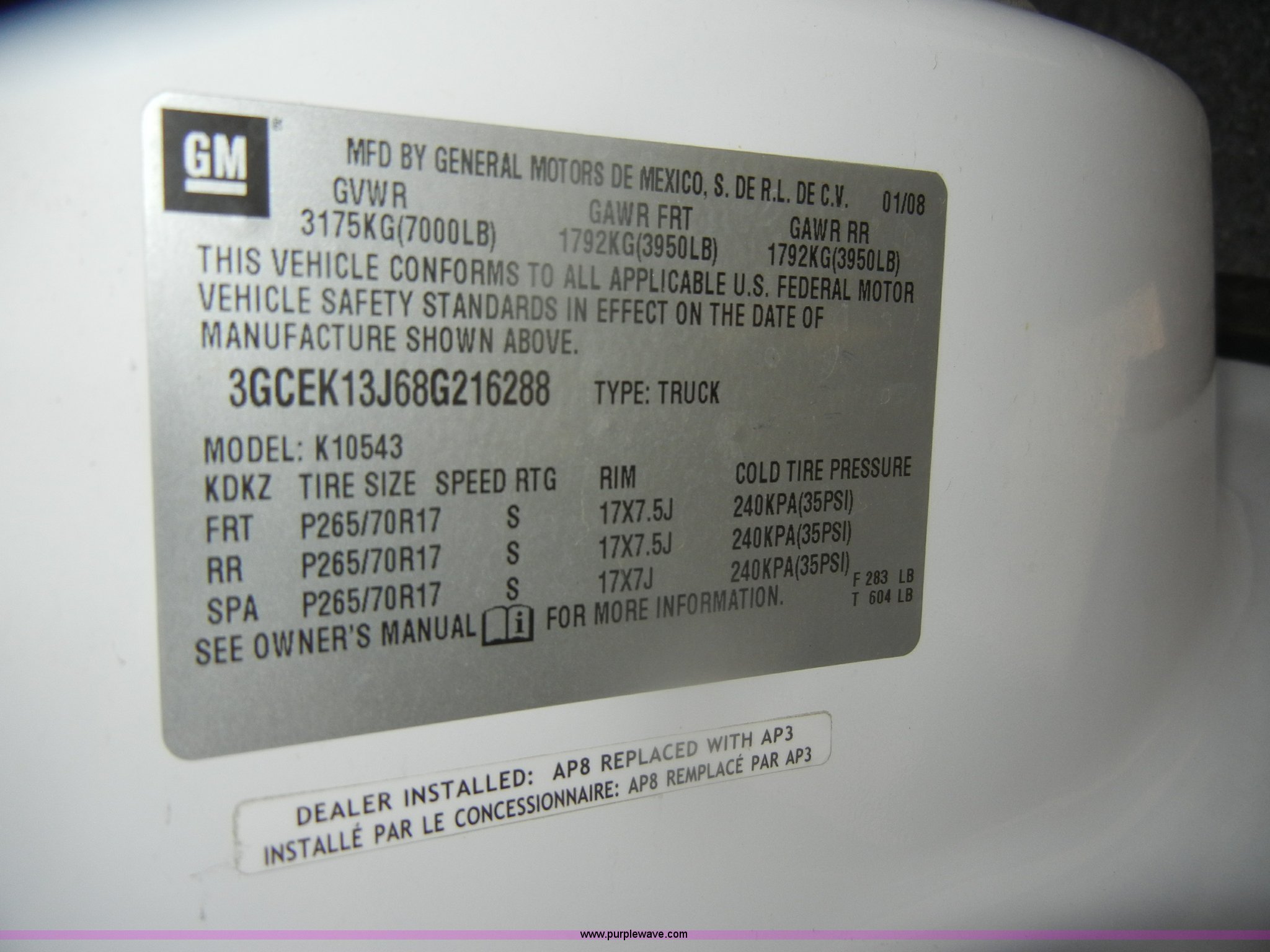 Purple Wave is selling a used 1/2 Ton Pickup or Van in Kansas. This item is a 2008 Chevrolet Silverado 1500 LT Crew Cab pickup truck with the following: 179,682 miles on odometer, 5.3L V8 SFI gas engine, Automatic transmission, Four wheel drive, Tow package, AC and heat, Tilt, Cruise, AM/FM/CD, Power windows, locks, mirrors, and seats, Cloth interior, Navigation system, Front bug shield, Front tow hooks, 6' short bed, Receiver hitch, Trailer wiring, 265/70R17 tires, Exterior cosmetic damage, Dents and scratches, Paint peeling, Equip# 2077