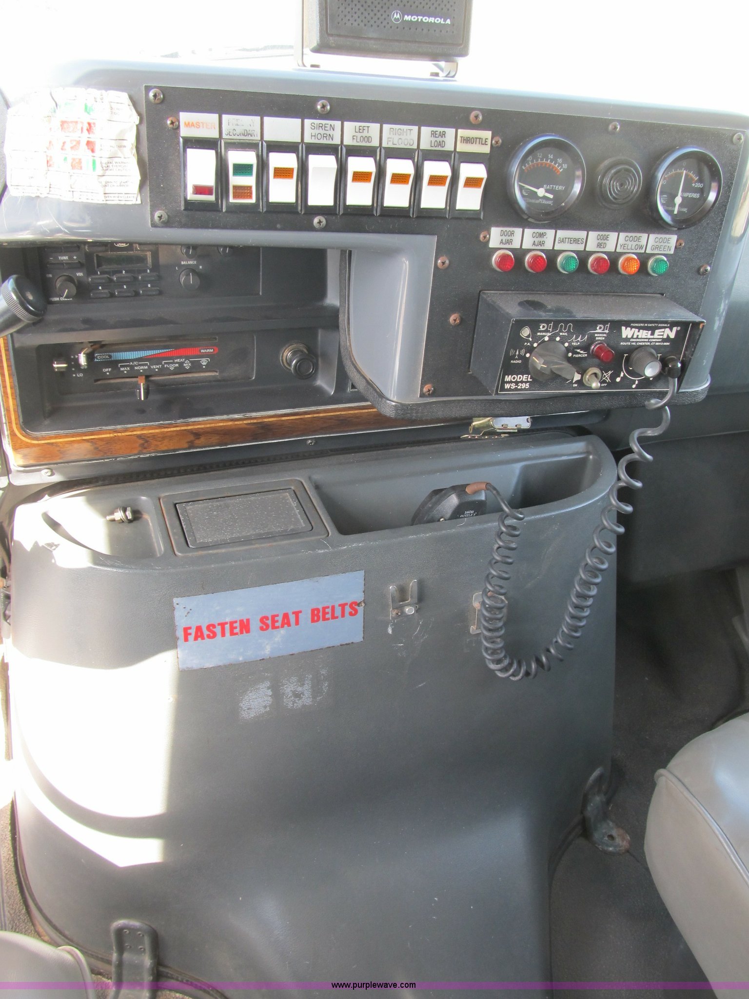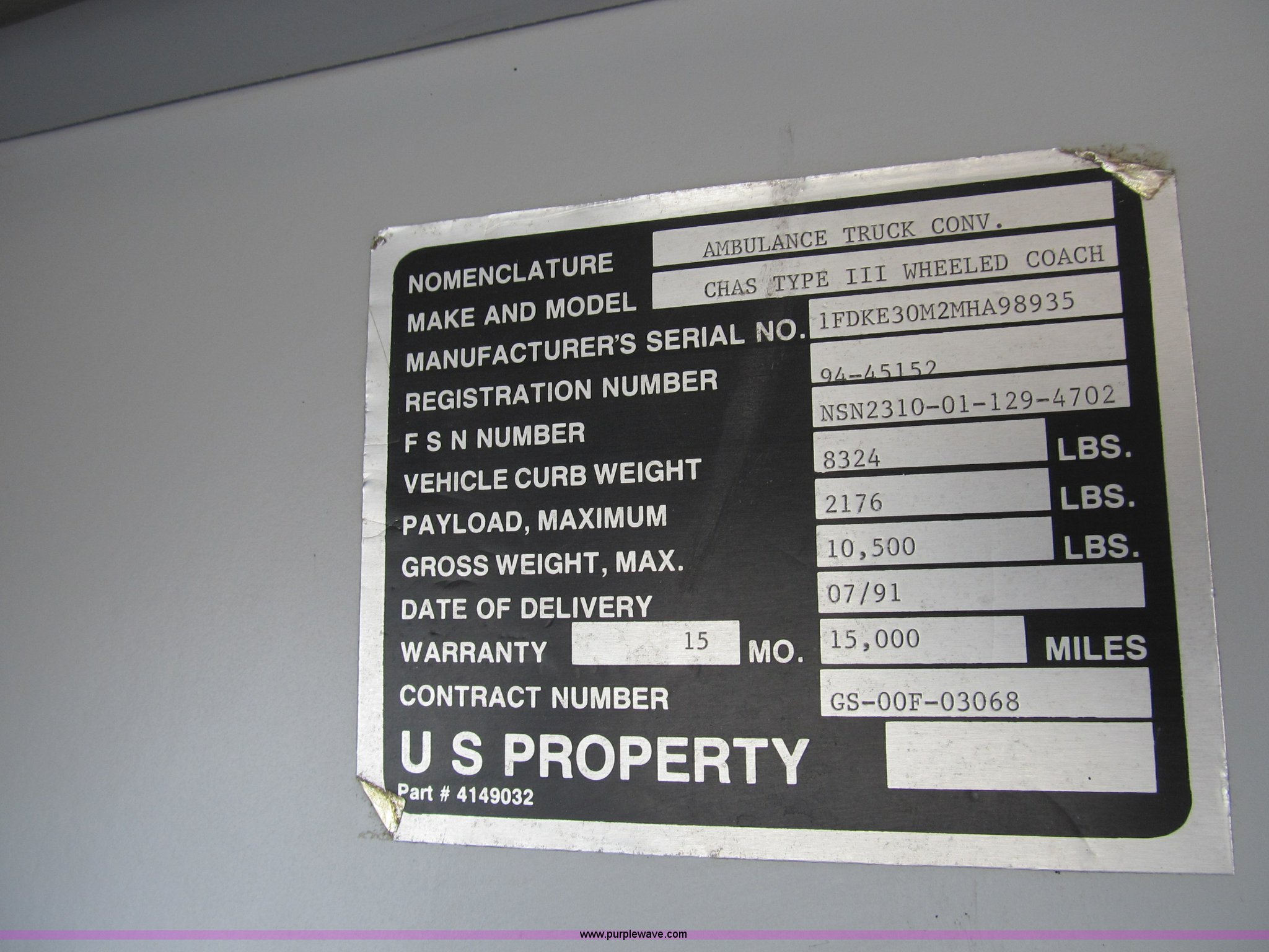 Purple Wave is selling a used Passenger Vehicle in Illinois. This item is a 1991 Ford E350 ambulance with the following: 36,206 actual miles, Powerstroke 7.3L V8 diesel engine, Automatic transmission, AC and heat, AM/FM, Cruise, Manual windows and locks, Backup alarm, Horton light controls and siren controls, Disconnected, Rear climate controls, Vinyl interior, Whelen WS-295 radio, Unknown working condition, (2) rear oxygen hookups, (5) outside storage compartments, Side and rear entry, 115v auxiliary electric in cab, Running boards, LT215/85R16 tires, GVWR 10,500 lbs, Seats need minor repair