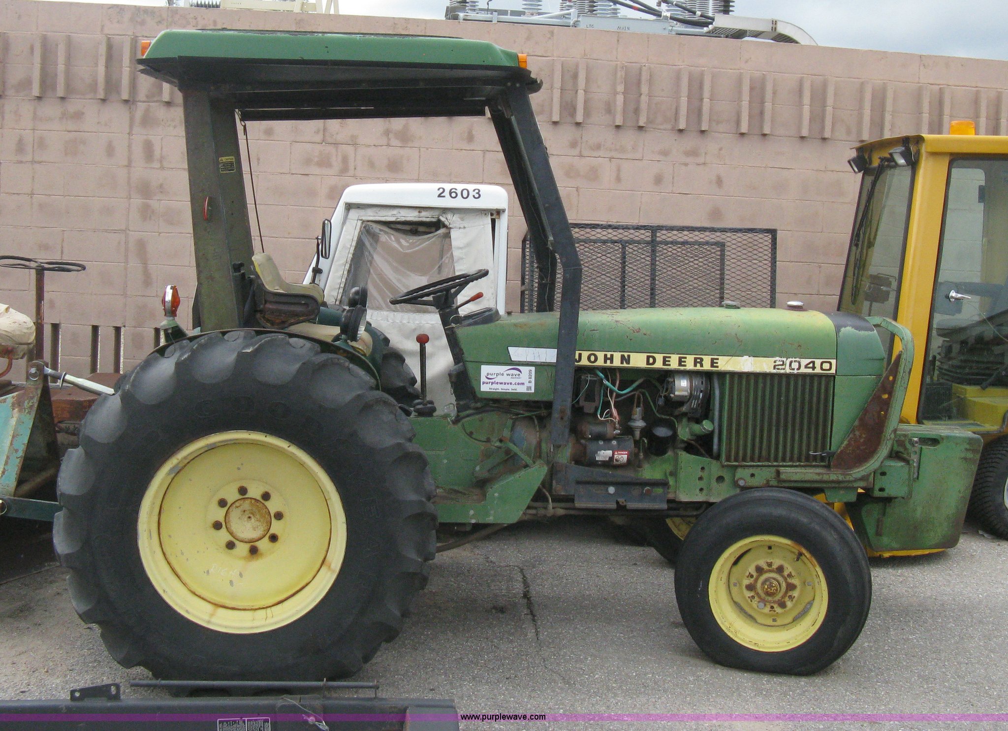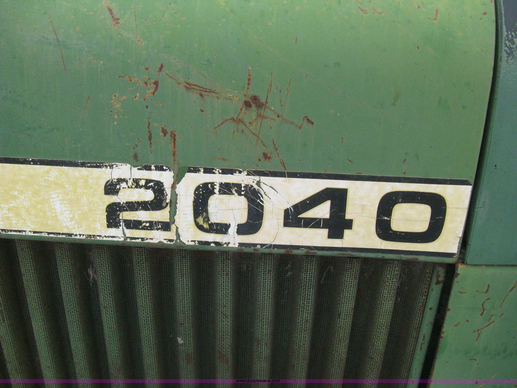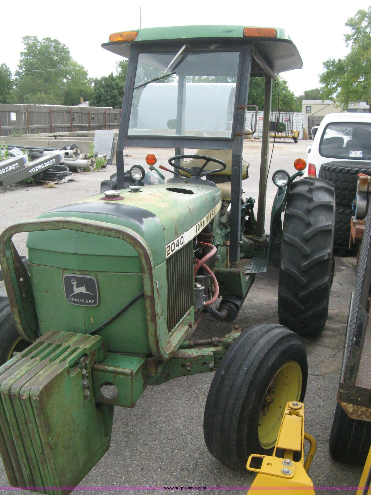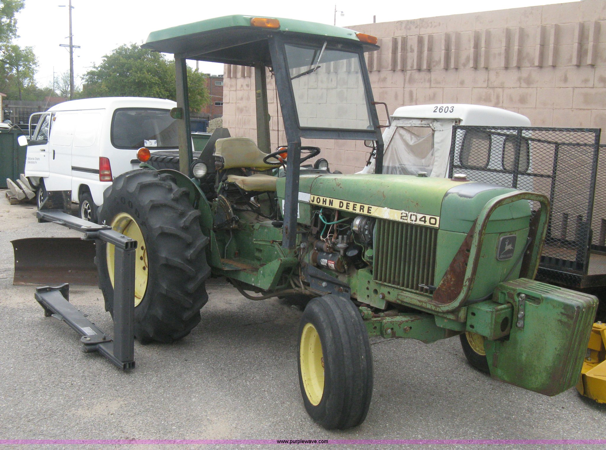 Purple Wave is selling a used Tractor in Kansas. This item is a 1980 John Deere 2040 tractor with the following: 32 hours on meter, Actual hours unknown, Three cylinder diesel engine, Four speed Hi-Low transmission, ROPS, Hard top canopy with lights, Windshield wiper, Foot pedal and column throttle control, Block heater, Three point, 540 PTO, Hydraulic remotes, Draw bar, 8' rear blade, Bolt on edge, Manual angle adjust, Rear exhaust with muffler, (6) suitcase weights, 14.9-24 rear tires, 7.50-15 front tires, (2) 21.5L-16.1 rear turf tires included, Two post roll bar included, Serial 3164DL-04/362795CD